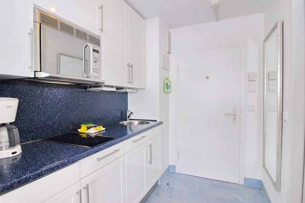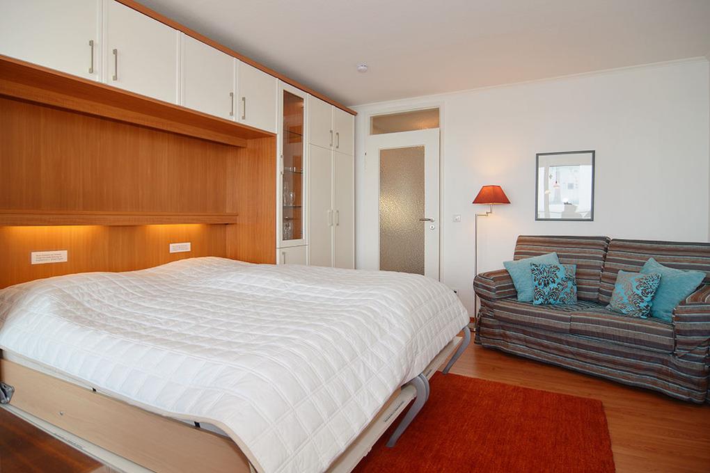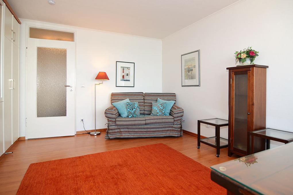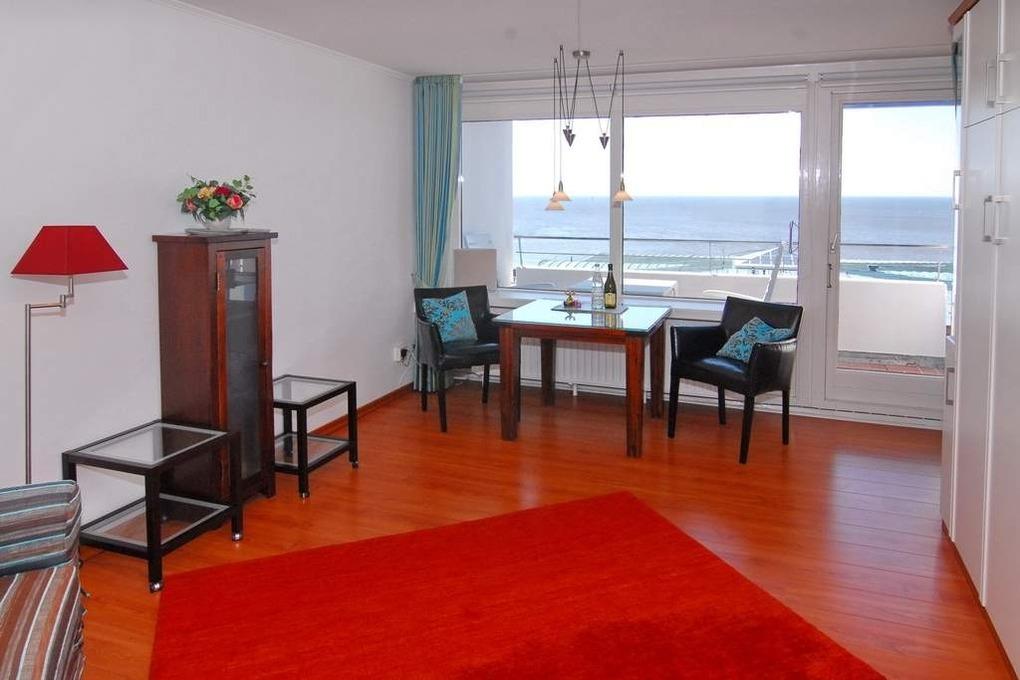Hübsches1-Zimmer-Ferienwohnung, ca. 34 qm im Haus Sylter Welle, 4 OG. Nichtraucher-Whg.! Wohn-/Schlafraum mit Westbalkon und Meeresblick, 2 Einzelschrankbetten, Esstisch mit 2 Lederstühlen am Fenster und Blick auf das Meer, Zweisitzer-Couch, Vitrine-und Kleiderschrank, Flat-TV und Radio. W-Lan (ohne Gewähr) Das Apartment ist mit Holzlaminat ausgelegt. Küchenzeile im Flur mit Mikrowelle und Geschirrspüler, Vollbad / WC mit Duschvorrichtung. Tierhaltung ist nicht gestattet. Bettwäsche und Handtücher sind zur Anreise aufgezogen. Ein PKW-Stellplatz kann kostenpflichtig zugebucht werden.