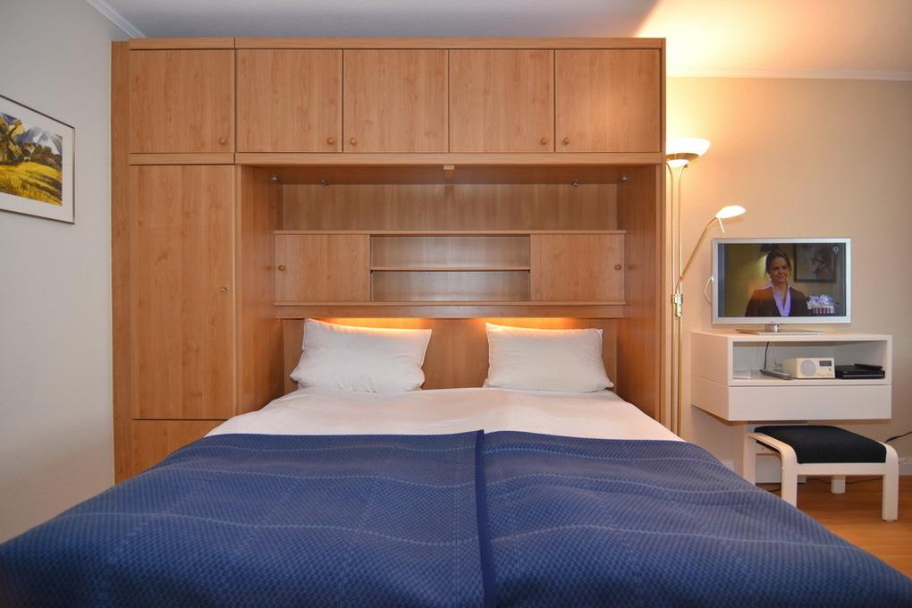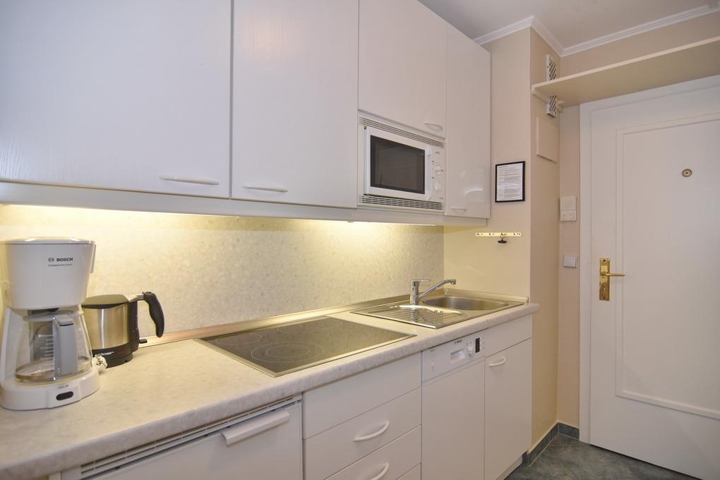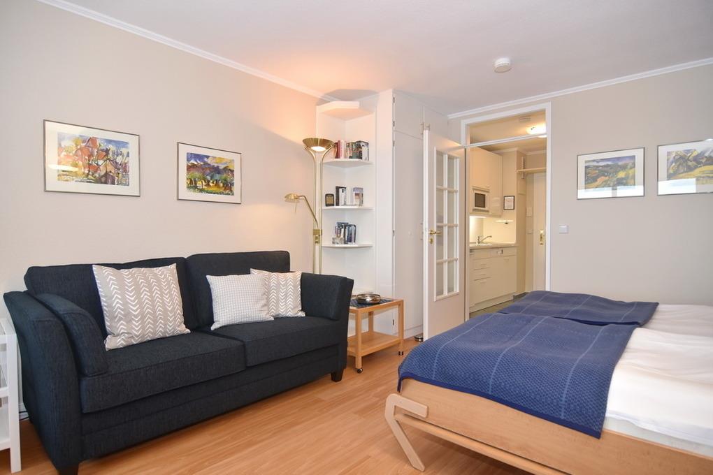 Hübsche 1-Zimmer-Wohnung zur Seeseite, ca. 34m² im 5. OG im Haus Sylter Welle. Wohn-/ Schlafraum mit Einzelschrankbetten (je 90 x 190), Essplatz am Fenster, 2-Sitzer-Couch und Sessel, Flat-TV, W-LAN (ohne Gewähr), Telefon (Festnetzflatrate), Zugang zum Westbalkon mit Blick auf Strand und Meer. Im Flurbereich befindet sich eine Küchenzeile mit Geschirrspüler, Ceranherd und Mikrowelle. Duschbad/WC. Rauchen und Tierhaltung ist hier nicht gestattet. Bettwäsche und Handtücher sind zur Anreise aufgezogen. Ein PKW-Stellplatz kann kostenpflichtig zugebucht werden.