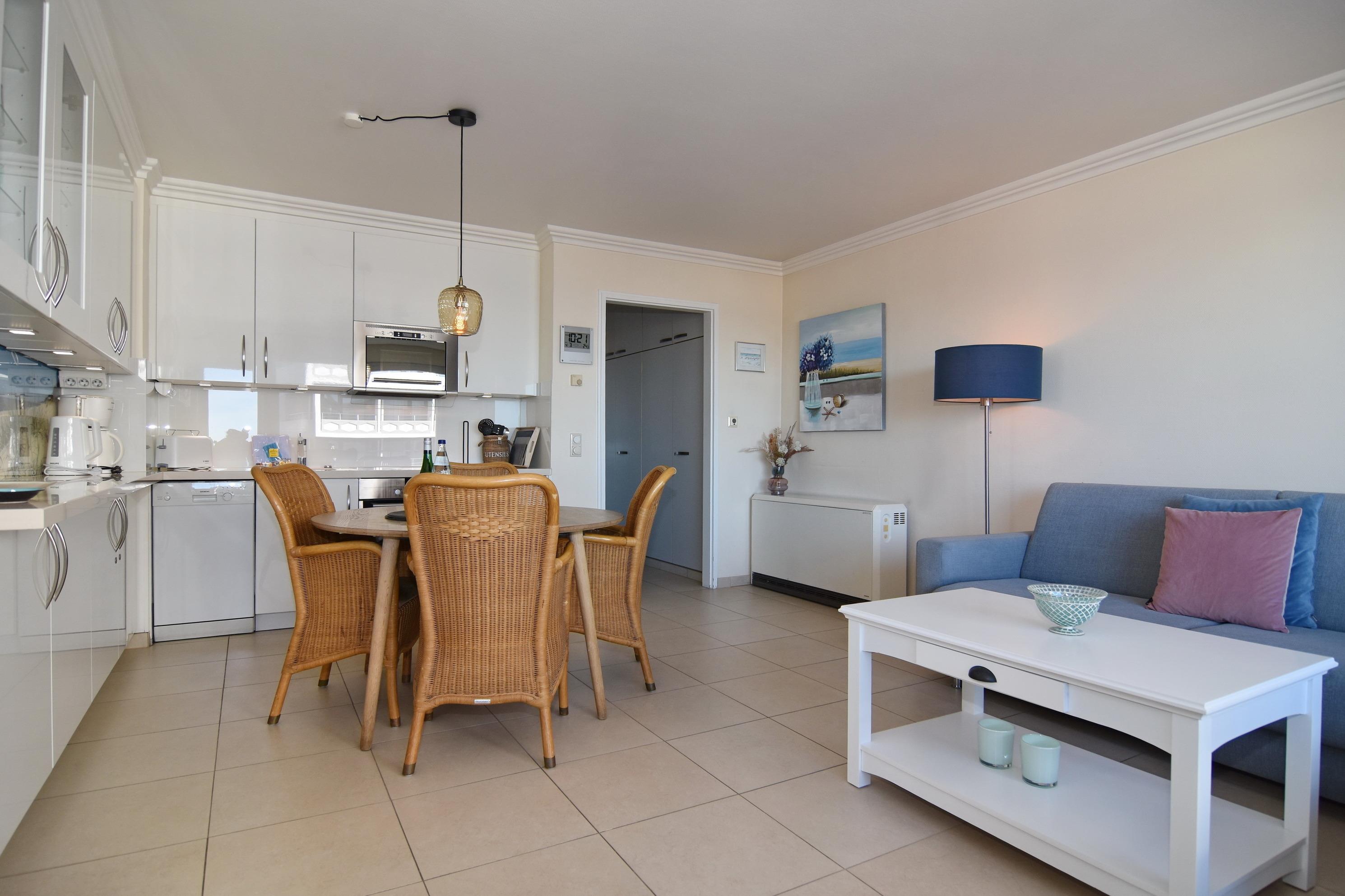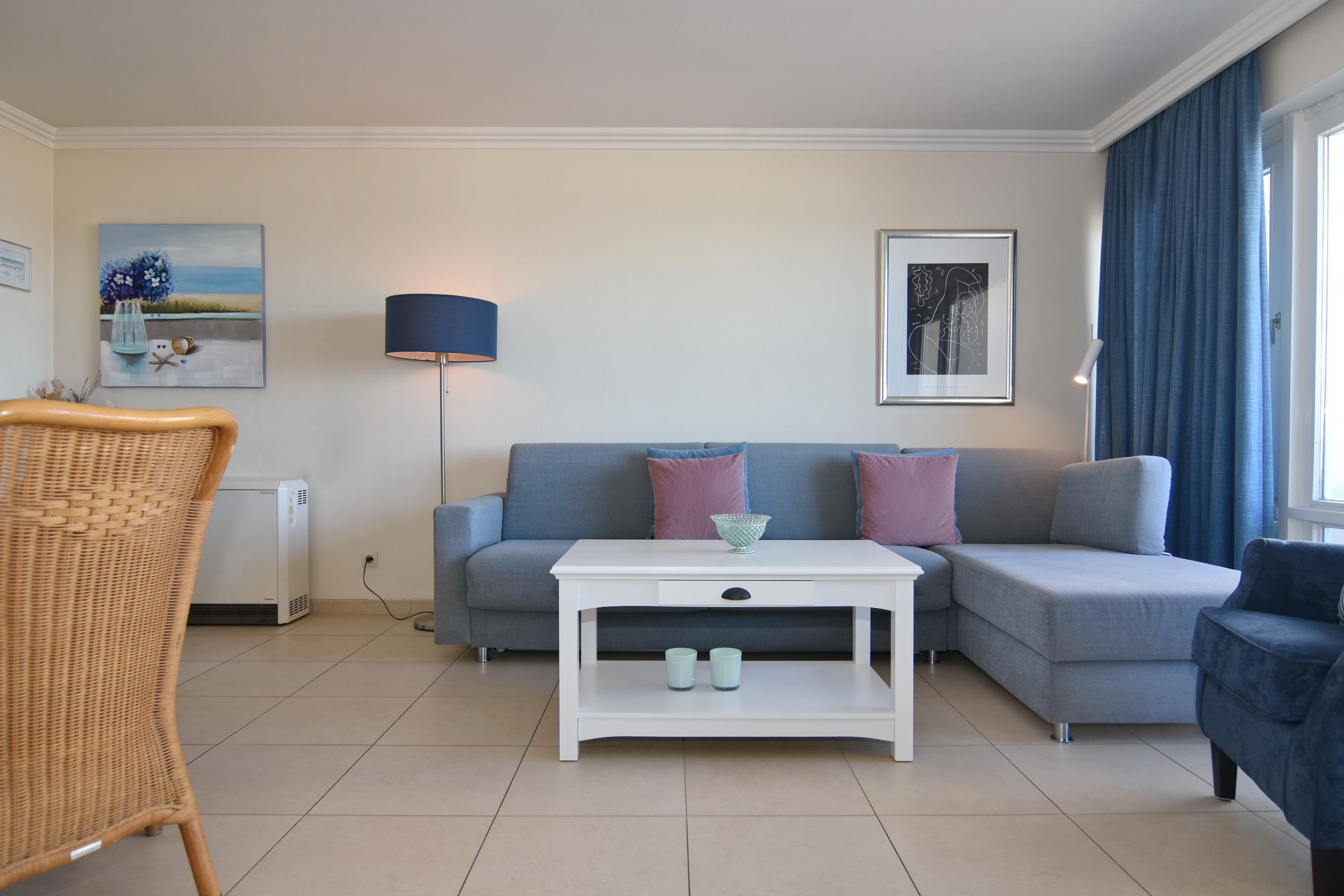 Schöne 2-Zimmer-Ferienwohnung im Haus Westerhörn, ca. 45m², 4.OG. Nichtraucher-Apartment. Wohnzimmer mit Eckgarnitur, Flachbild-Plasma-TV, Essplatz mit 4 Stühlen, Küchenzeile mit Mikrowelle, Backofen und Geschirrspüler, Westbalkon mit kleinem Blick auf das Meer. Offenes Schlafzimmer mit Doppelbett (140x200, 1 Matratze) und Schiebetürenschrank, Duschbad / WC. Wohnung ist komplett gefliest und mit Fussbodenheizung. Die Heizquelle ist ein Nachtspeicherofen, im Badezimmer ist ein Elektroheizkörper verbaut. Bettwäsche und Handtücher sind zur Anreise aufgezogen. Garage inkl., Code 0279 (Bedienungsanleitung beachten. Gewicht 1700 kg, Länge 5 m, Breite 1,85, Höhe 1,65, Spurbreite 1,74, Nutzung auf eigene Gefahr-keine Haftung!). Tierhaltung verboten. Waschküche im Keller. Wäschepaket nur auf Bestellung.