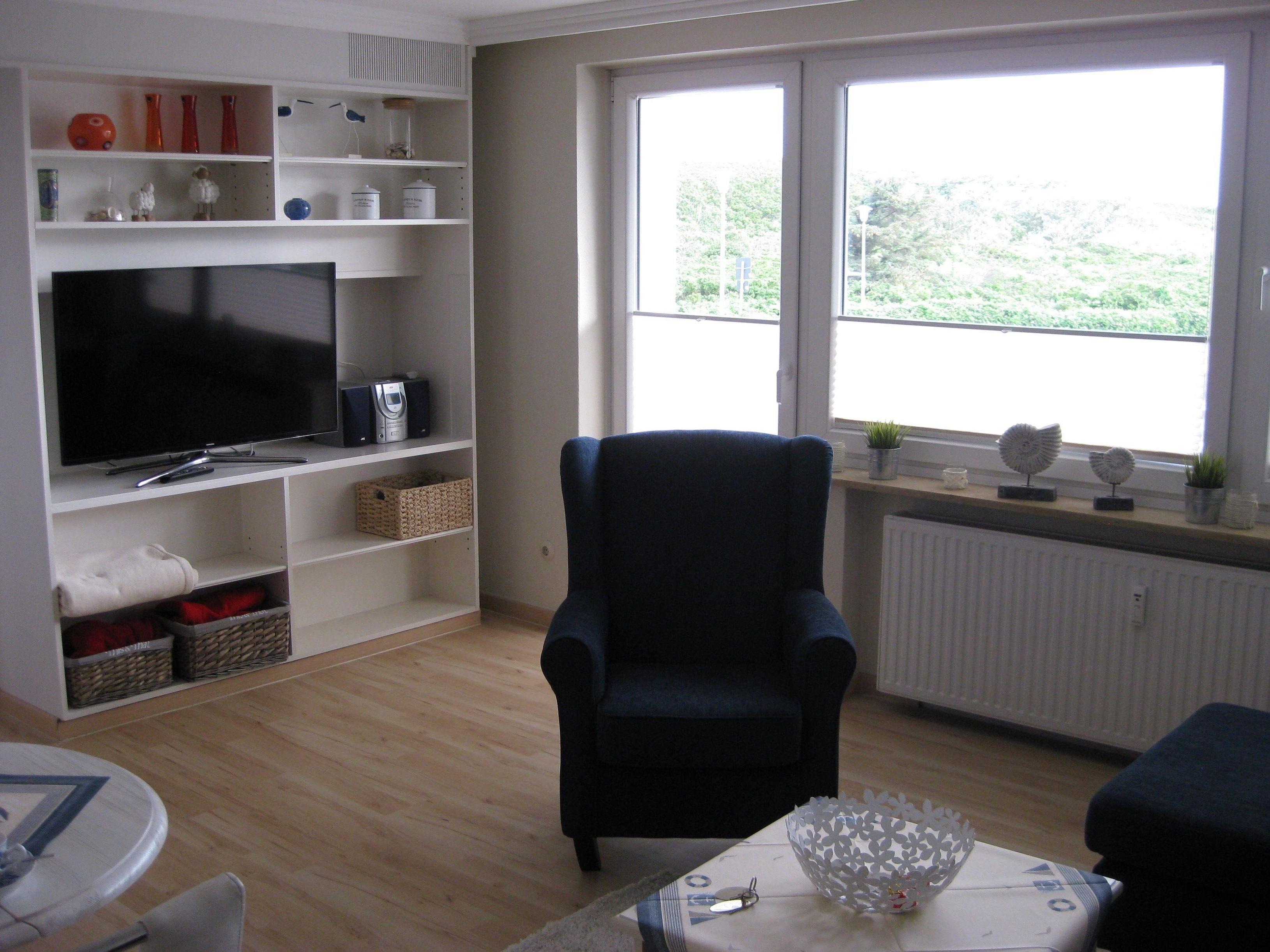 Das Wohnzimmer ist mit großen Panorama-Fenstern ausgestattet. Sie schauen auf die Dünen Richtung Wenningstedt. Die Wohnung hat 50 qm Wohnfläche. Die Wohnung ist hell und exklusiv eingerichtet.