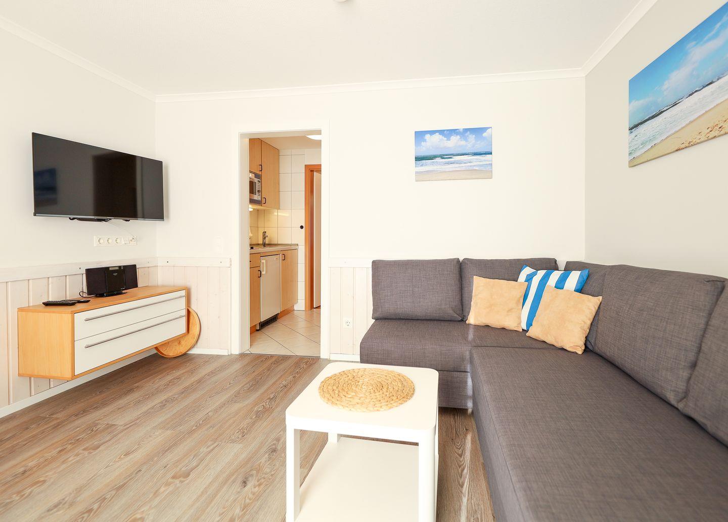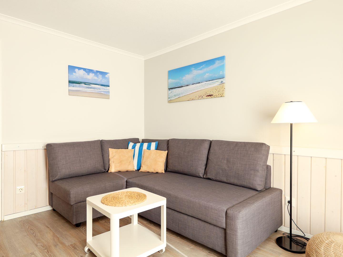 Appartement Riterspöör präsentiert sich im moderne Bungalow-Stil mit einer kleinen Terrasse nebst Strandkorb.