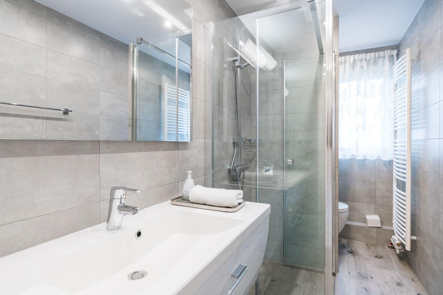 Im Schlafzimmer sorgt das große Doppelbett für eine entspannte Wohlfühl-Atmosphäre, die sich auch in dem geräumigen Duschbad fortsetzt.