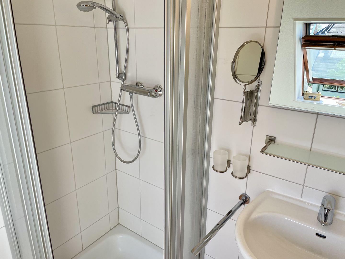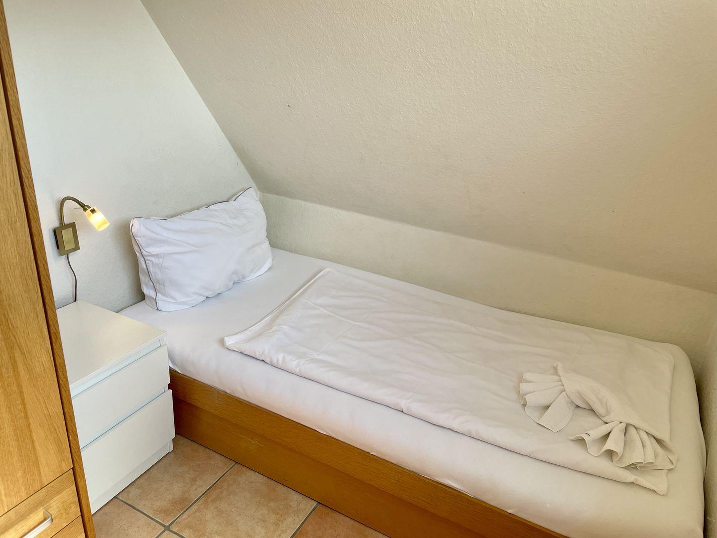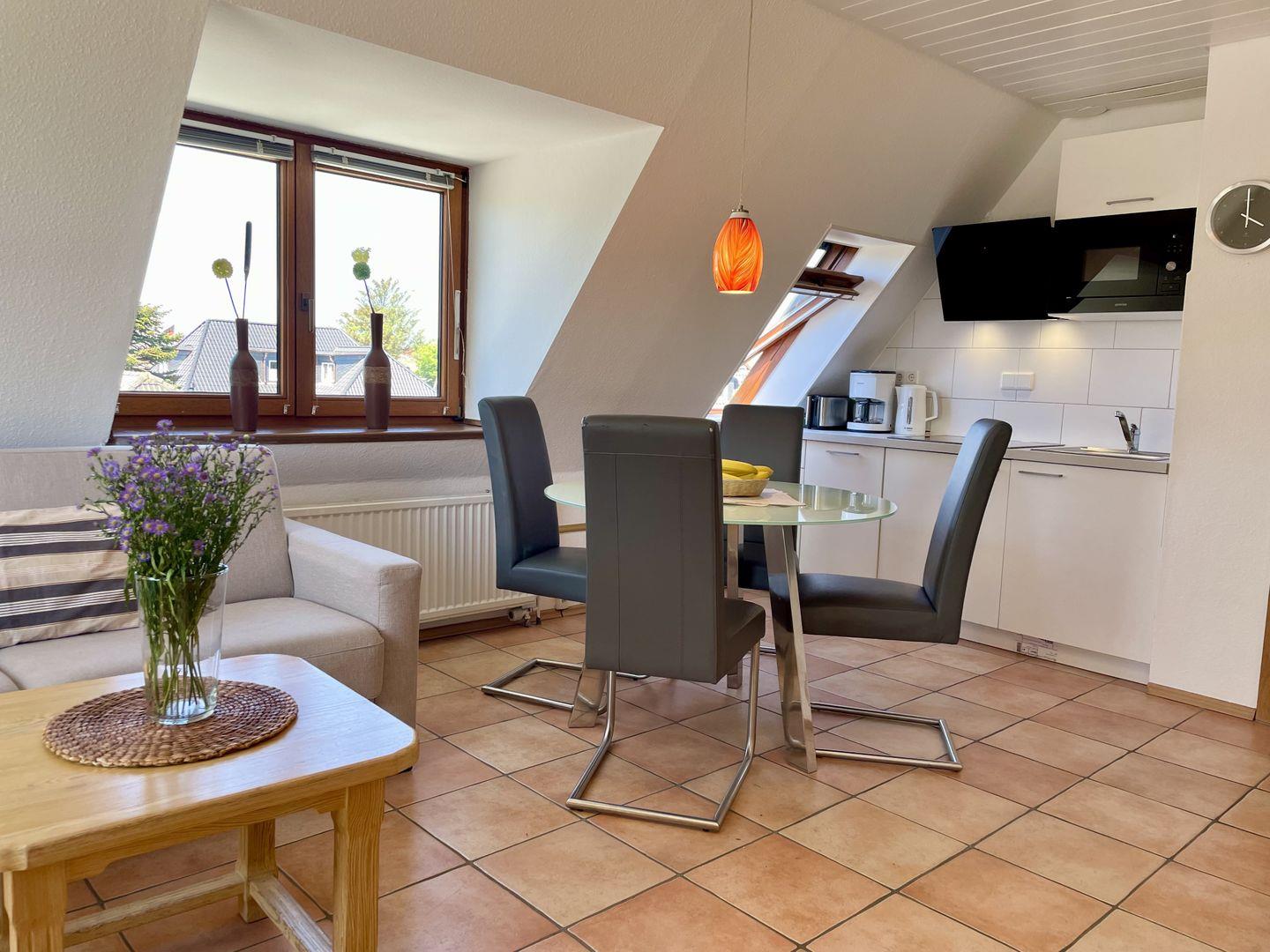 Diese gemütliche ca. 55 m² große Ferienwohnung für bis zu 4 Personen verläuft über zwei Ebenen. Das Obergeschoss bietet Ihnen eine offene Küche samt Geschirrspüler mit angrenzendem Wohn- und Essbereich, ein Duschbad sowie ein Einzelschlafzimmer. Im Spitzboden erwartet Sie ein Doppelschlafzimmer mit einem Notbett. Die Treppe in den Spitzboden ist steil. Nutzen Sie gerne die schöne Südterrasse samt Strandkorb (in der Saison). Kostenlose, öffentliche Parkplatzmöglichkeiten vor dem Haus sind vorhanden. Haustiere sind willkommen.