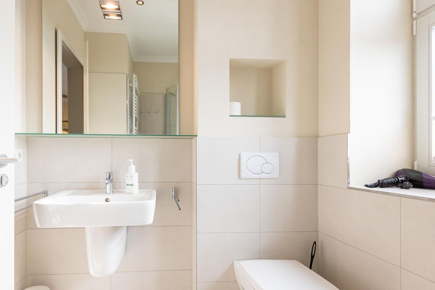 Badezimmer: Modernes Duschbad mit WC und Fenster.