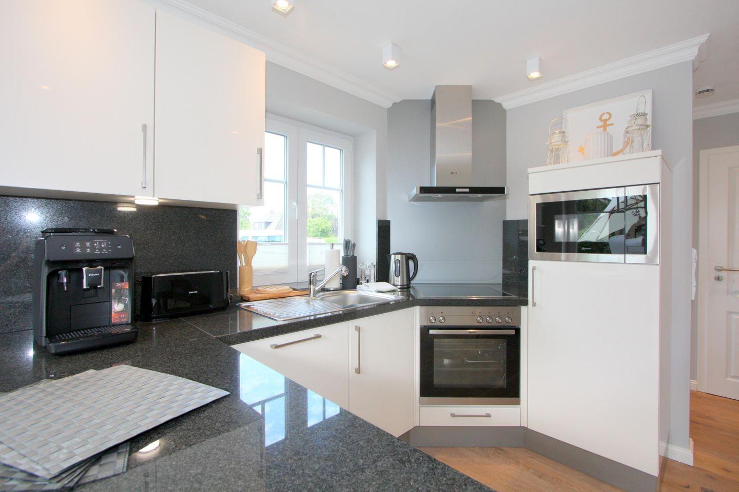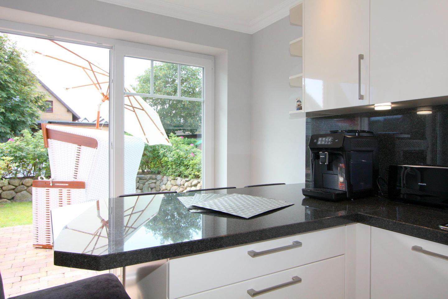 Wohn-/Essbereich: Gemütliches Schlafsofa mit TV sowie eine gut ausgestattete, offene Küche mit Geschirrspüler, Mikrowelle, Caffissimo-Kaffeemaschine und angrenzendem Küchentresen mit 4 Stühlen. Ebenfalls gelangen Sie von hier auf die schöne West-Terrasse mit Strandkorb und Gartenmobiliar.