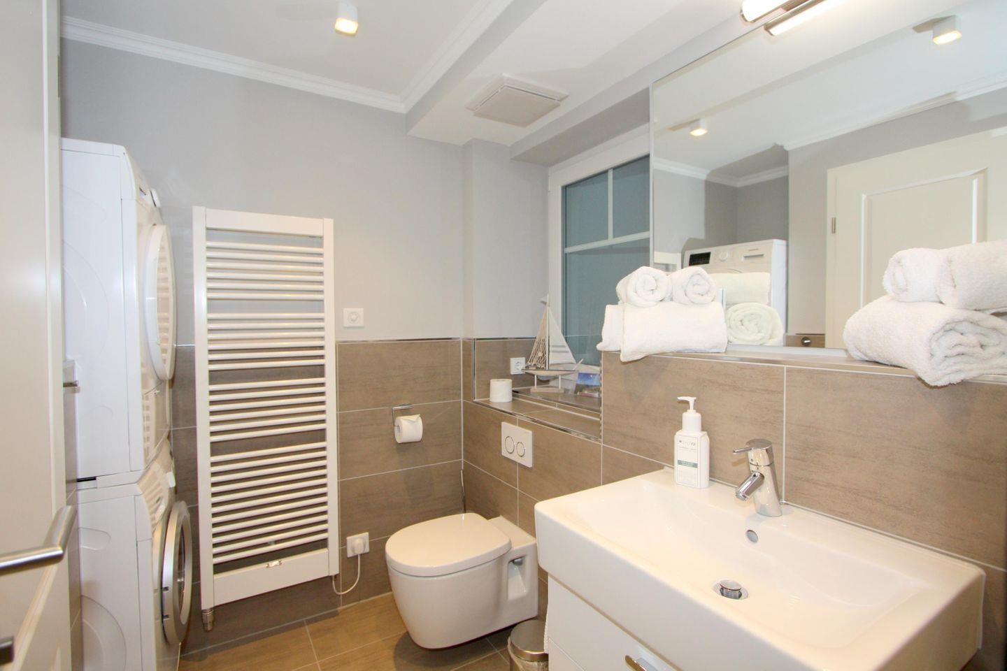 Badezimmer: Helles Duschbad mit Waschmaschine und Trockner.