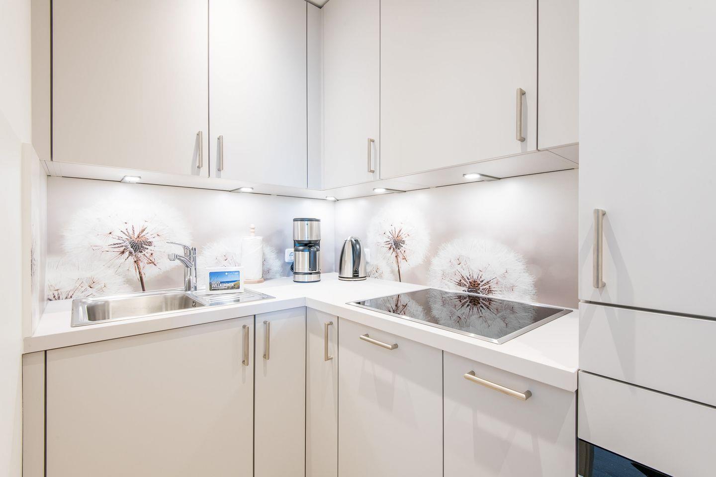 Küche: Komplett neu renovierte und gut ausgestattete kleine Küchenzeile mit Backofen in einem separaten Raum.