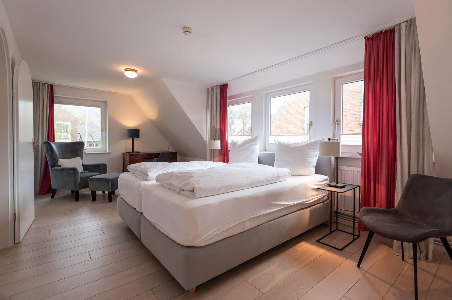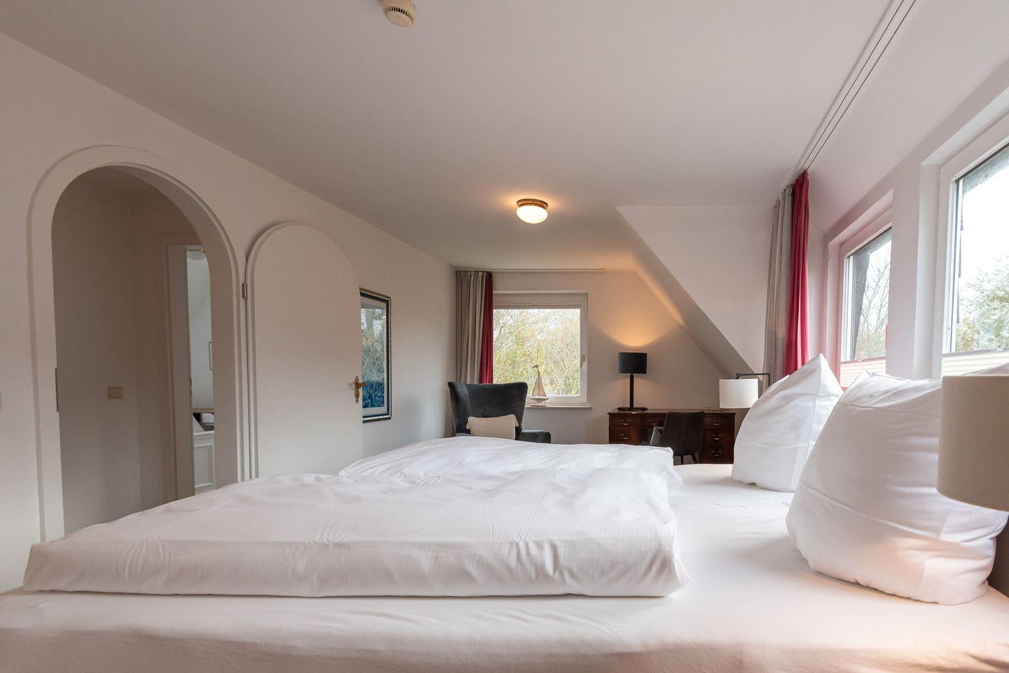 Schlafzimmer 1: großzügig geschnitten mit Doppelbett (1,80 x 2,0 m), begehbarem Wandschrank und Holzfußboden, Schreibtischecke sowie Fenster in zwei Himmelrichtungen.
