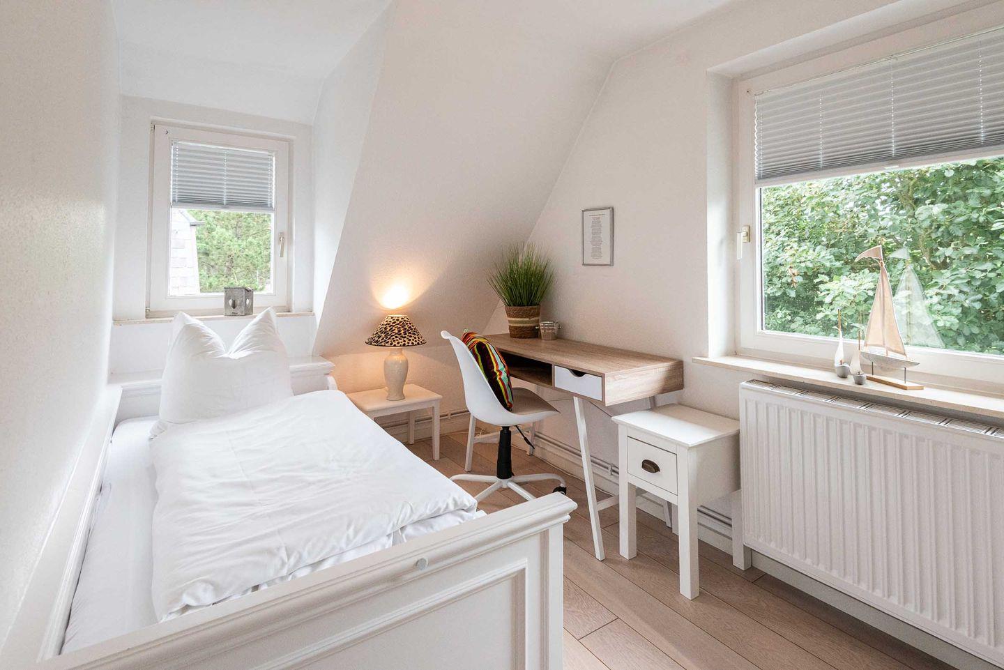 Schlafzimmer 2: Einzelbett (0,90 x 2,0 m) mit Fenster, großen Kleiderschrank und Schreibtischecke.