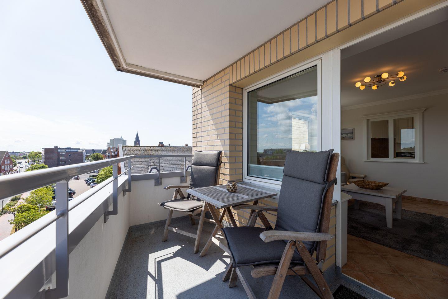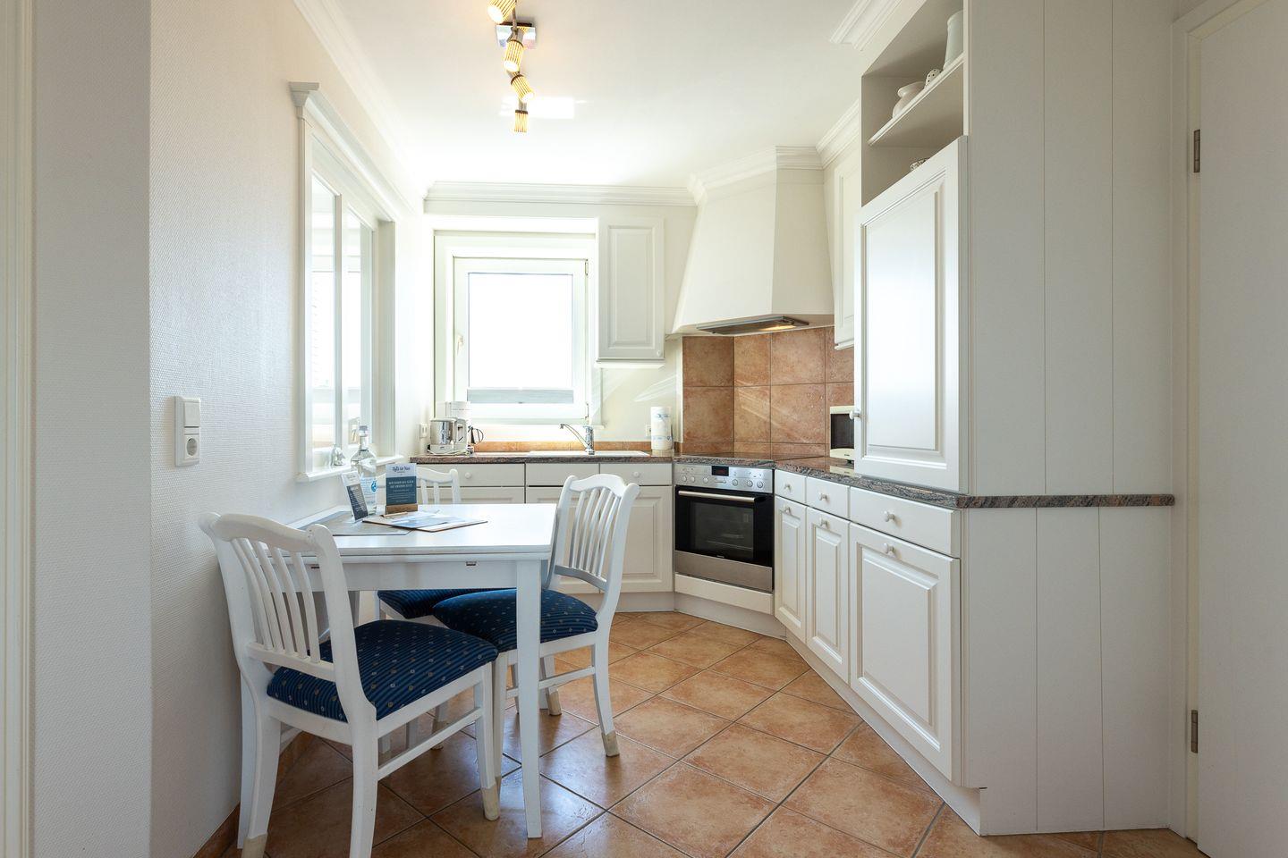 Helle Farben treffen auf hochwertige Einrichtungselemente und ergeben so einen erholsamen Rückzugsort, inmitten von Westerland. Im Wohnzimmer laden neben der Couch gleich zwei ultra bequeme Sessel zum Lesen und Fernsehen ein, während der Balkon (Ost) zum Frische-Luft-Schnuppern einlädt. Die separate Küche hat neben ihrer umfassenden Ausstattung auch einen kleinen Esstisch zu bieten und auch das ganz in Weiß gehaltene Duschbad lässt nichts vermissen.