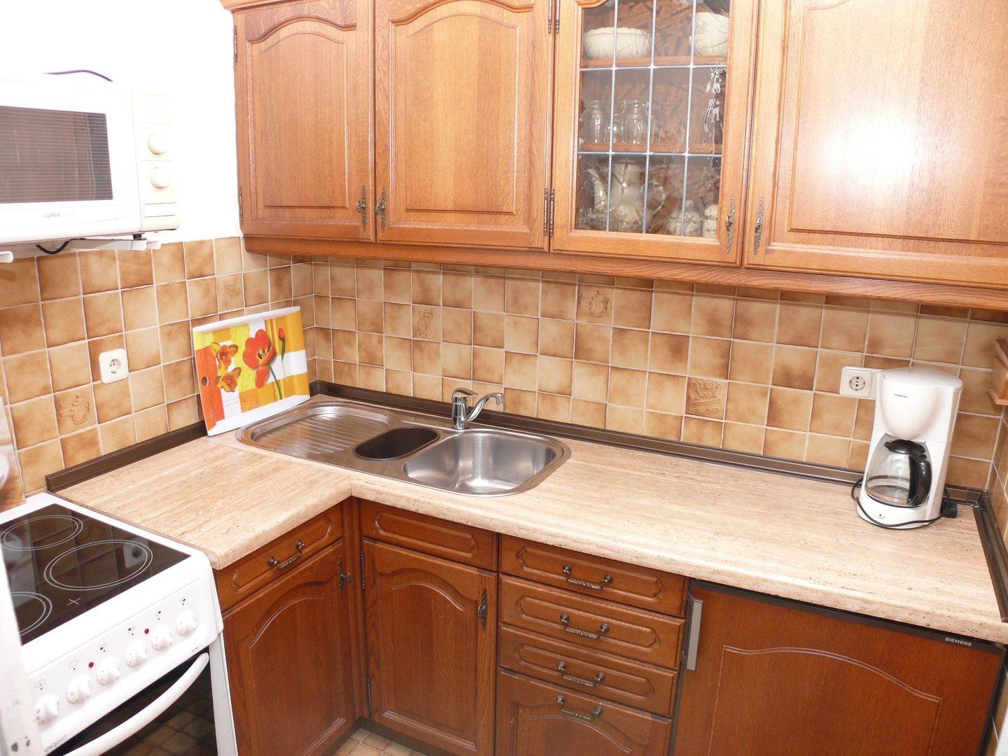 • Küche: Separate Einbauküche mit Fenster für komfortables Kochen, Kochfeld, Mikrowelle, Backoffen, Kühlschrank mit Gefrierfach