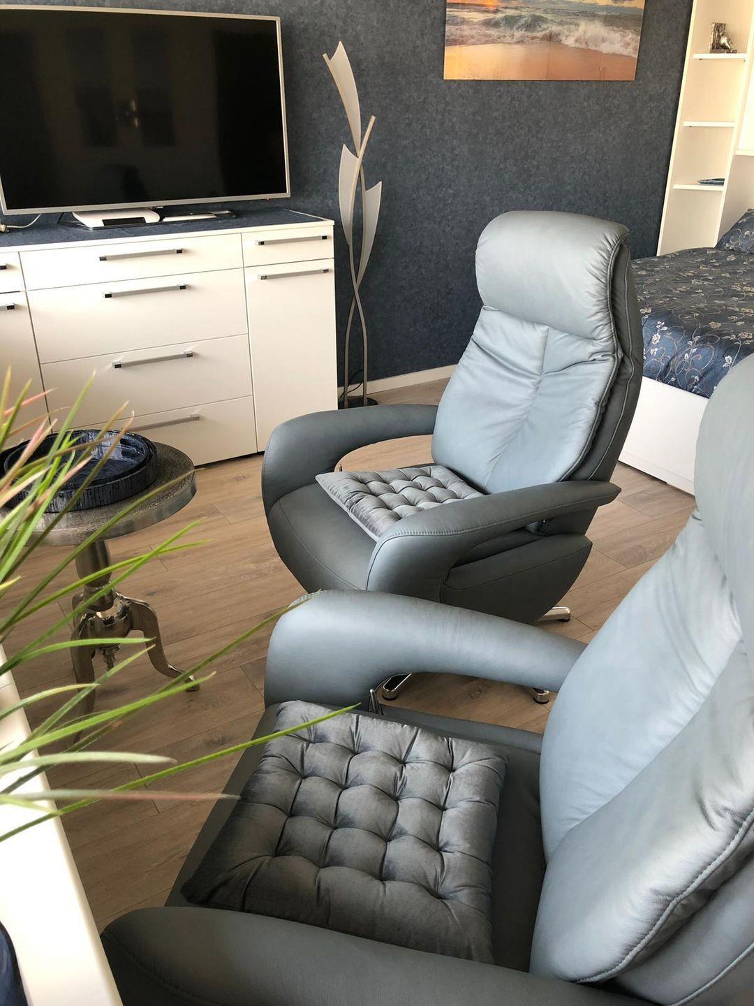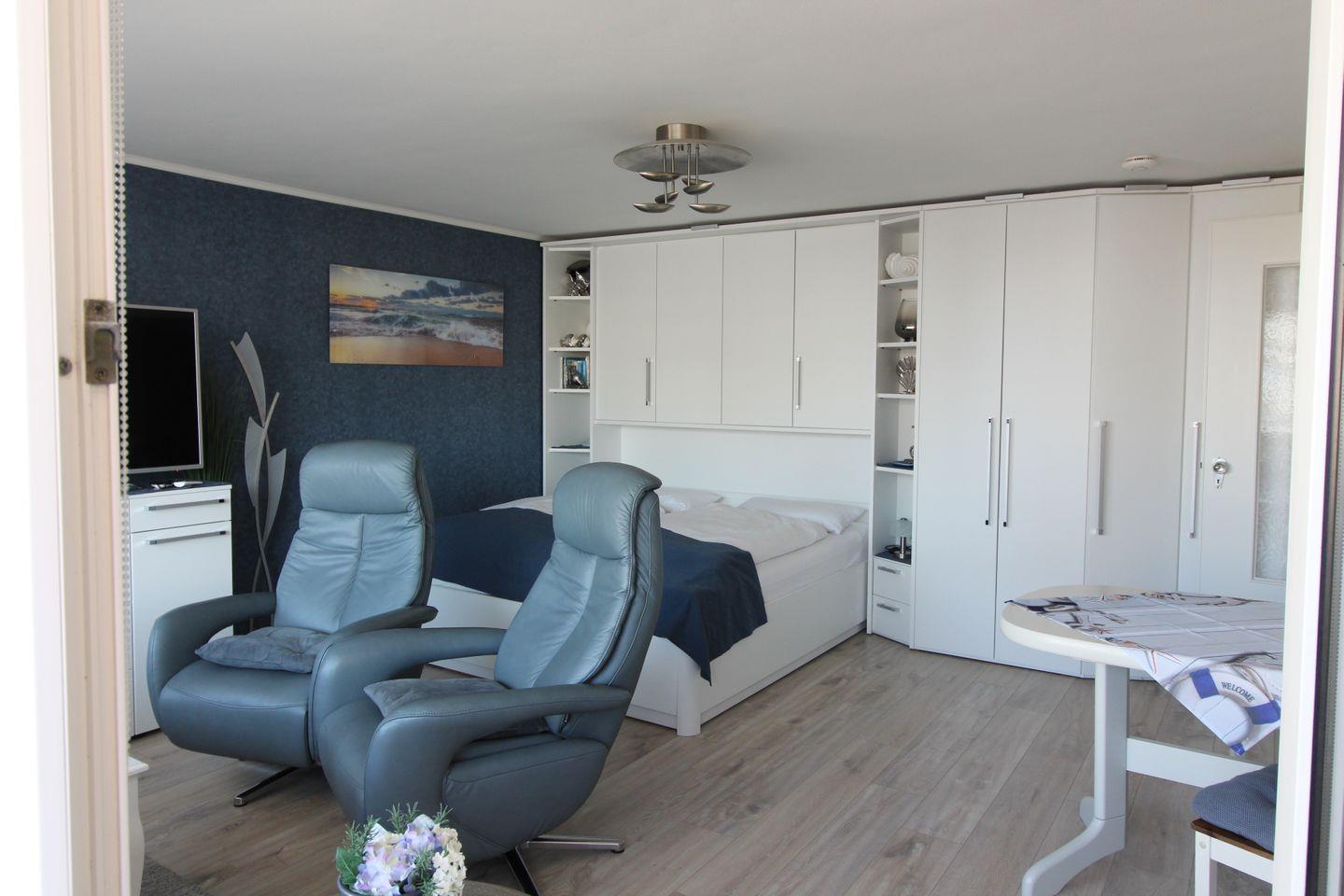 • Wohn-/Schlafraum: Feststehendes Doppelbett , zwei bequeme Leder-Relax-Sessel, ansprechender Essbereich