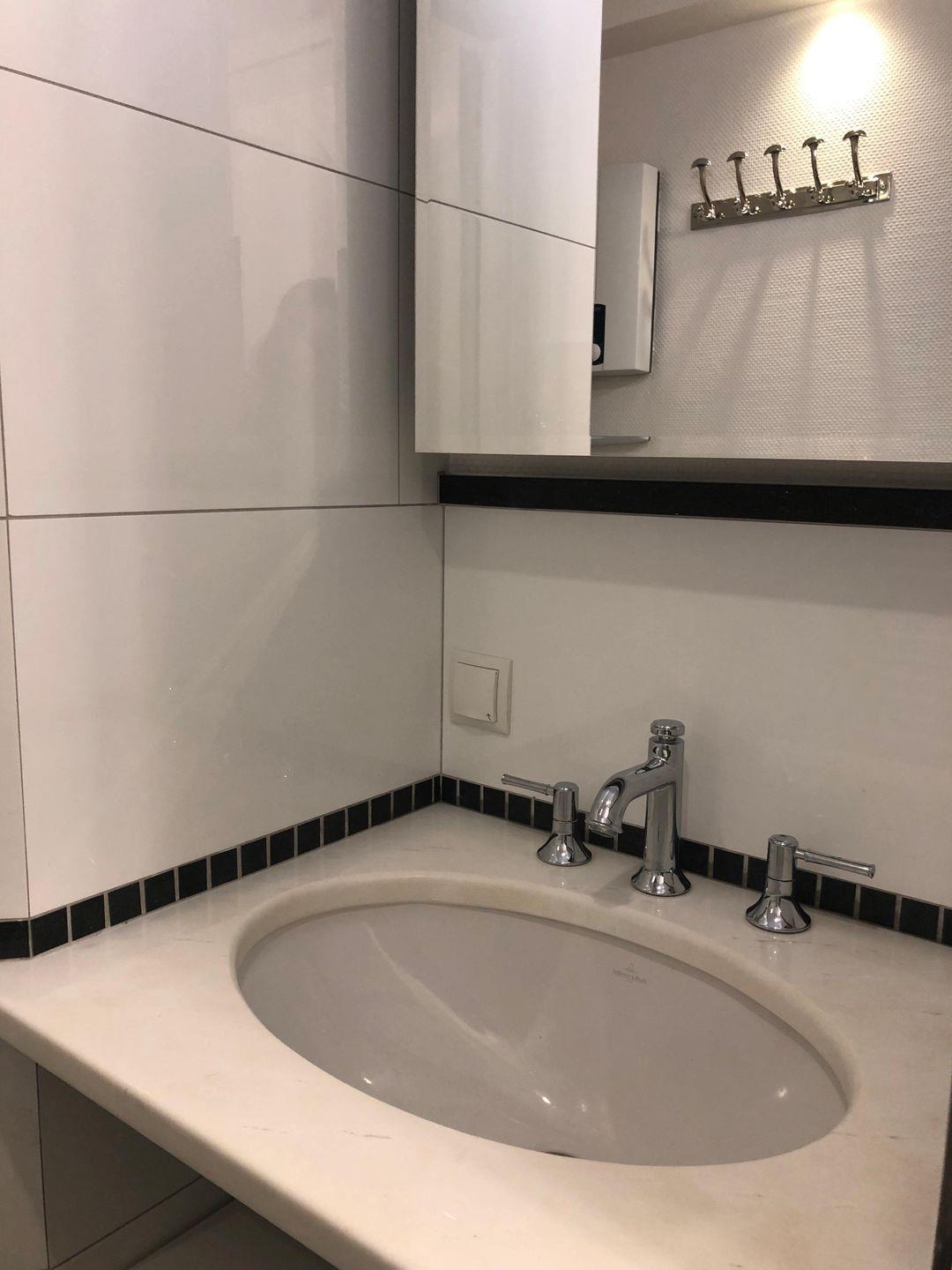 • Badezimmer: Modernes Designer-Duschbad, Handtuchtrockner-Heizung. Edles Marmor-Waschbecken