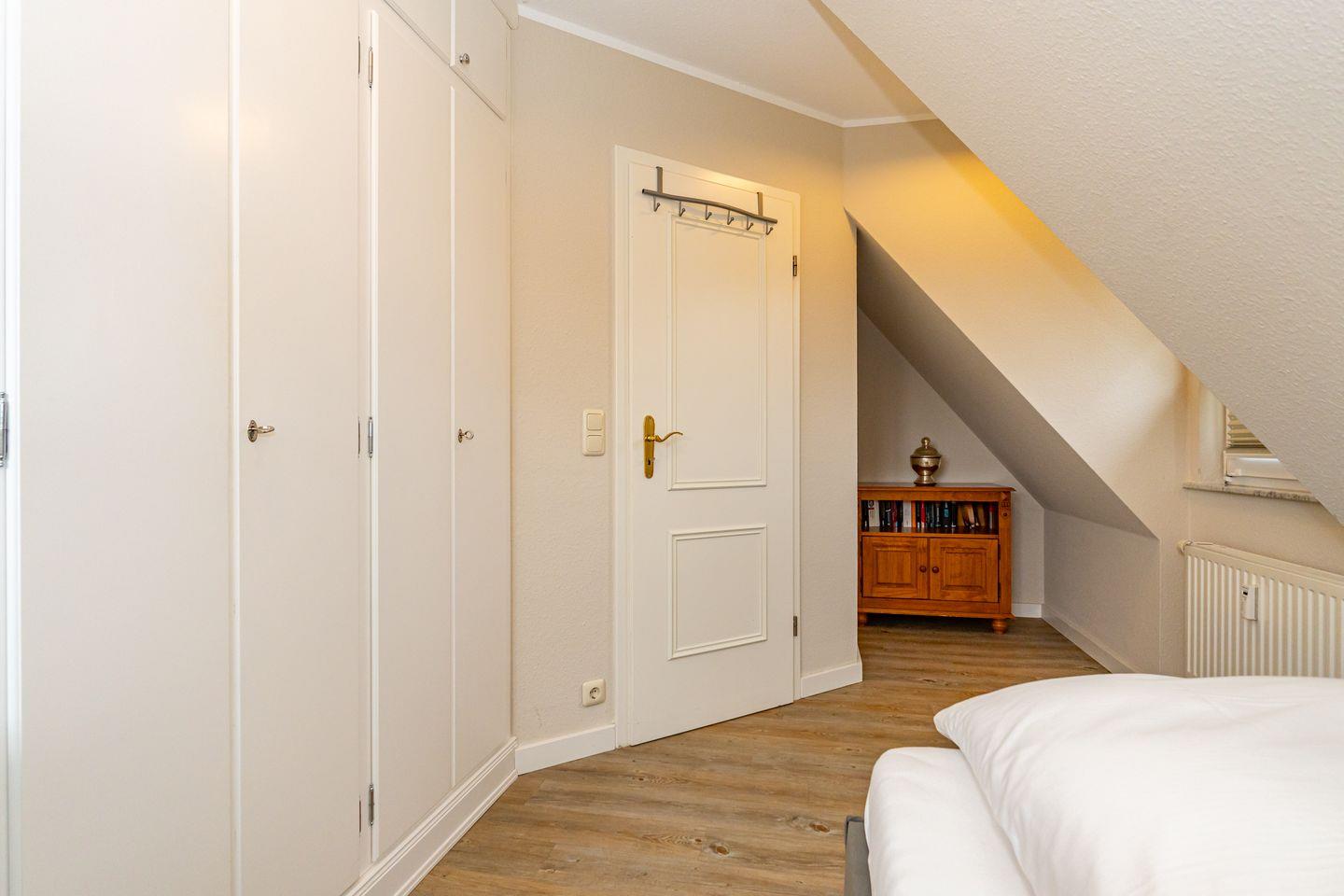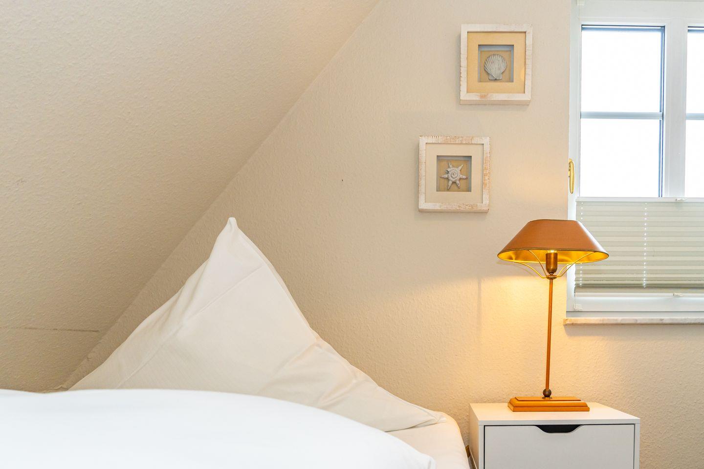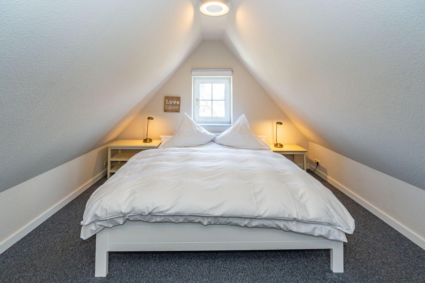 Des Weiteren verfügt diese Etage über ein helles und freundliches Duschbad/WC und ein Schlafraum mit Einzelbett. Im Dachgeschoss befindet sich das schöne und große Schlafzimmer mit einem Doppelbett. Dieses wird über eine Treppe erreicht und hat keine Tür. Ein PKW-Stellplatz gehört zu dieser Ferienwohnung.