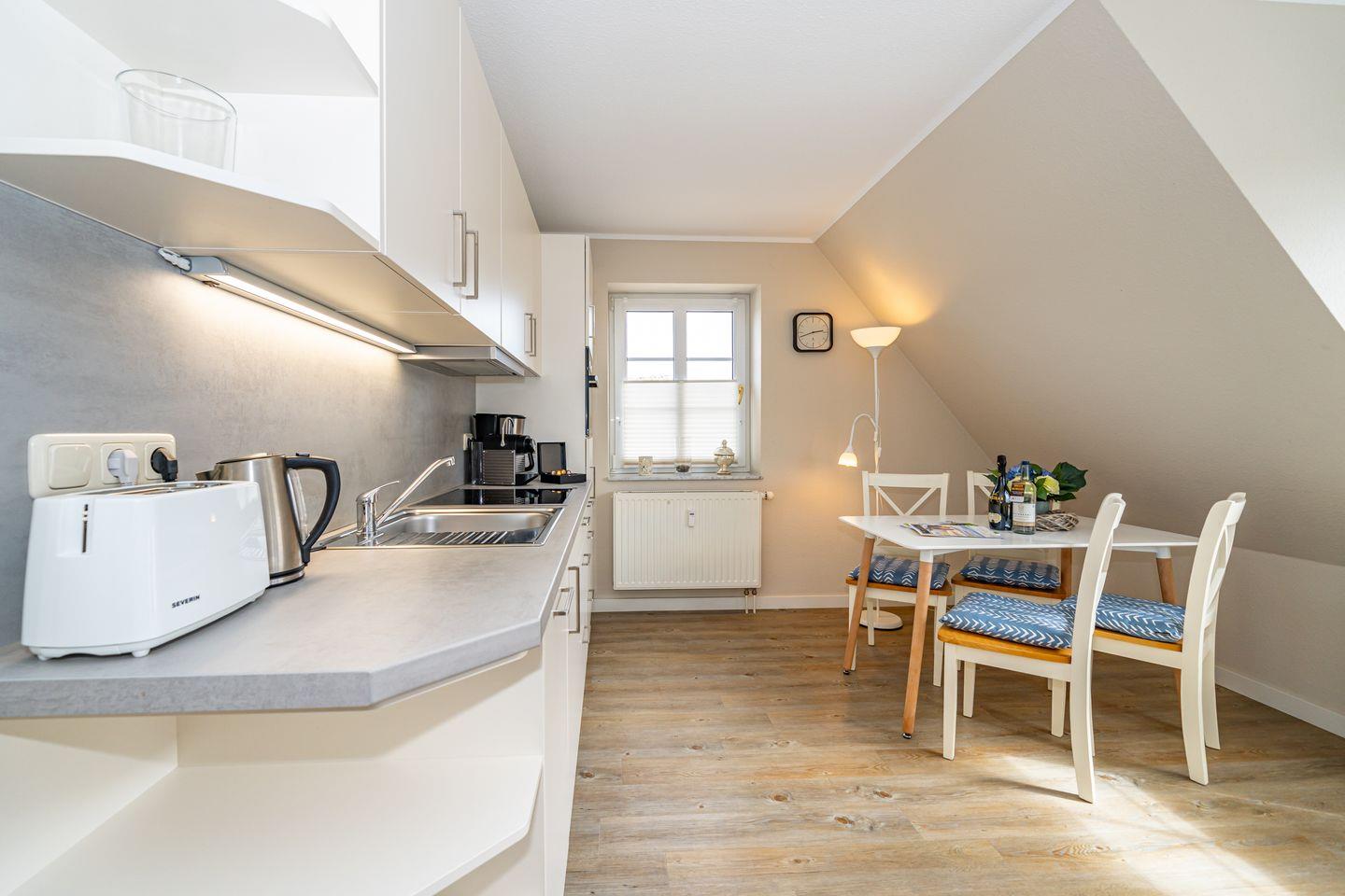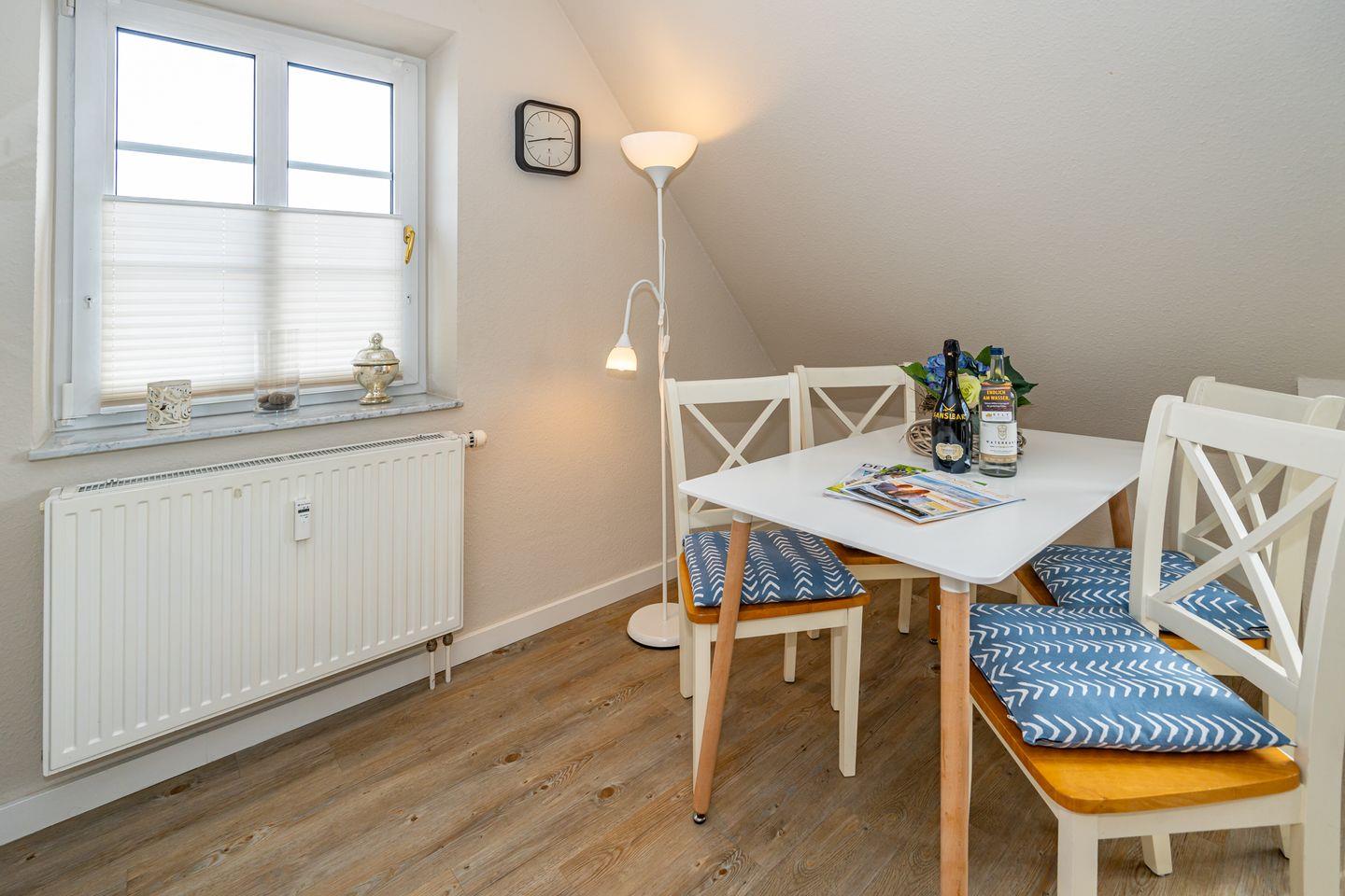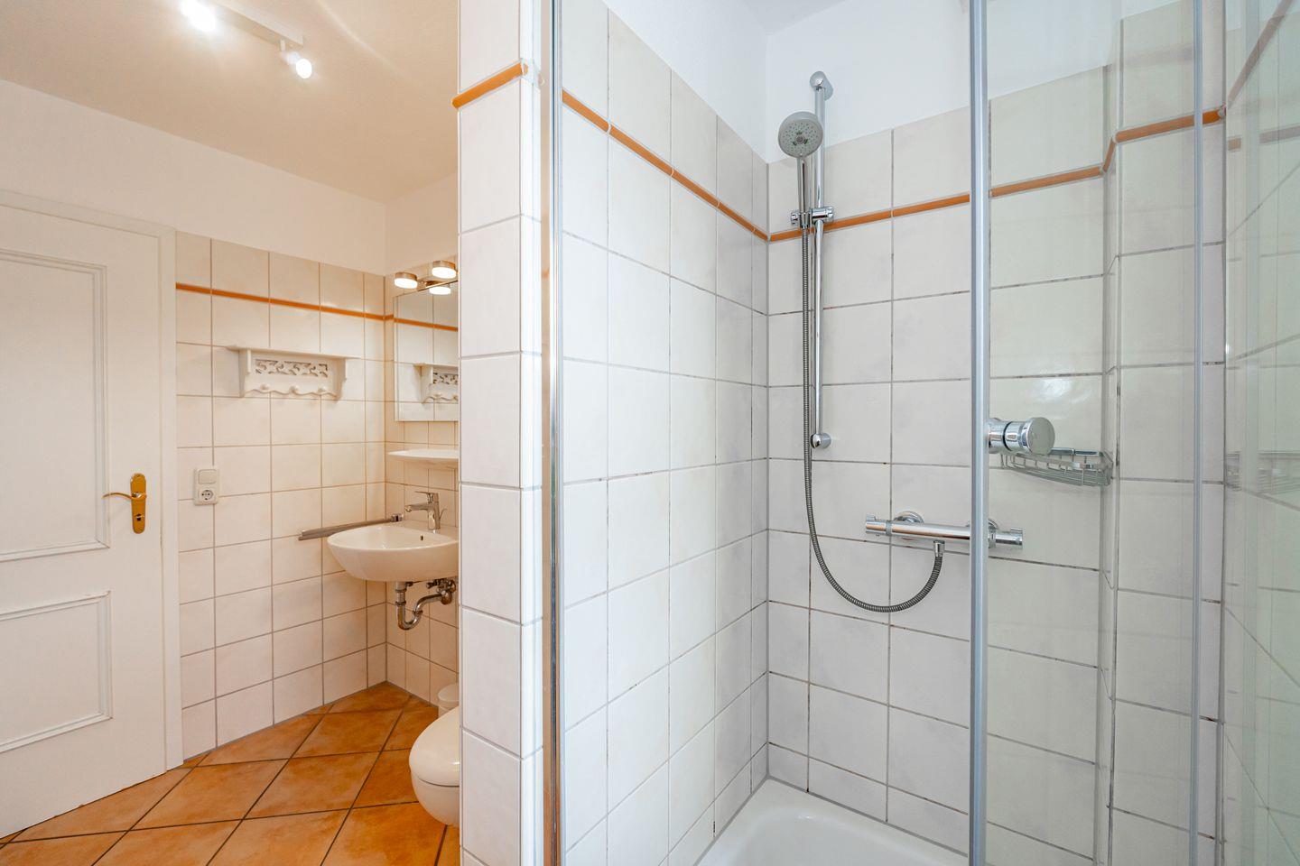Des Weiteren verfügt diese Etage über ein helles und freundliches Duschbad/WC und ein Schlafraum mit Einzelbett. Im Dachgeschoss befindet sich das schöne und große Schlafzimmer mit einem Doppelbett. Dieses wird über eine Treppe erreicht und hat keine Tür. Ein PKW-Stellplatz gehört zu dieser Ferienwohnung.