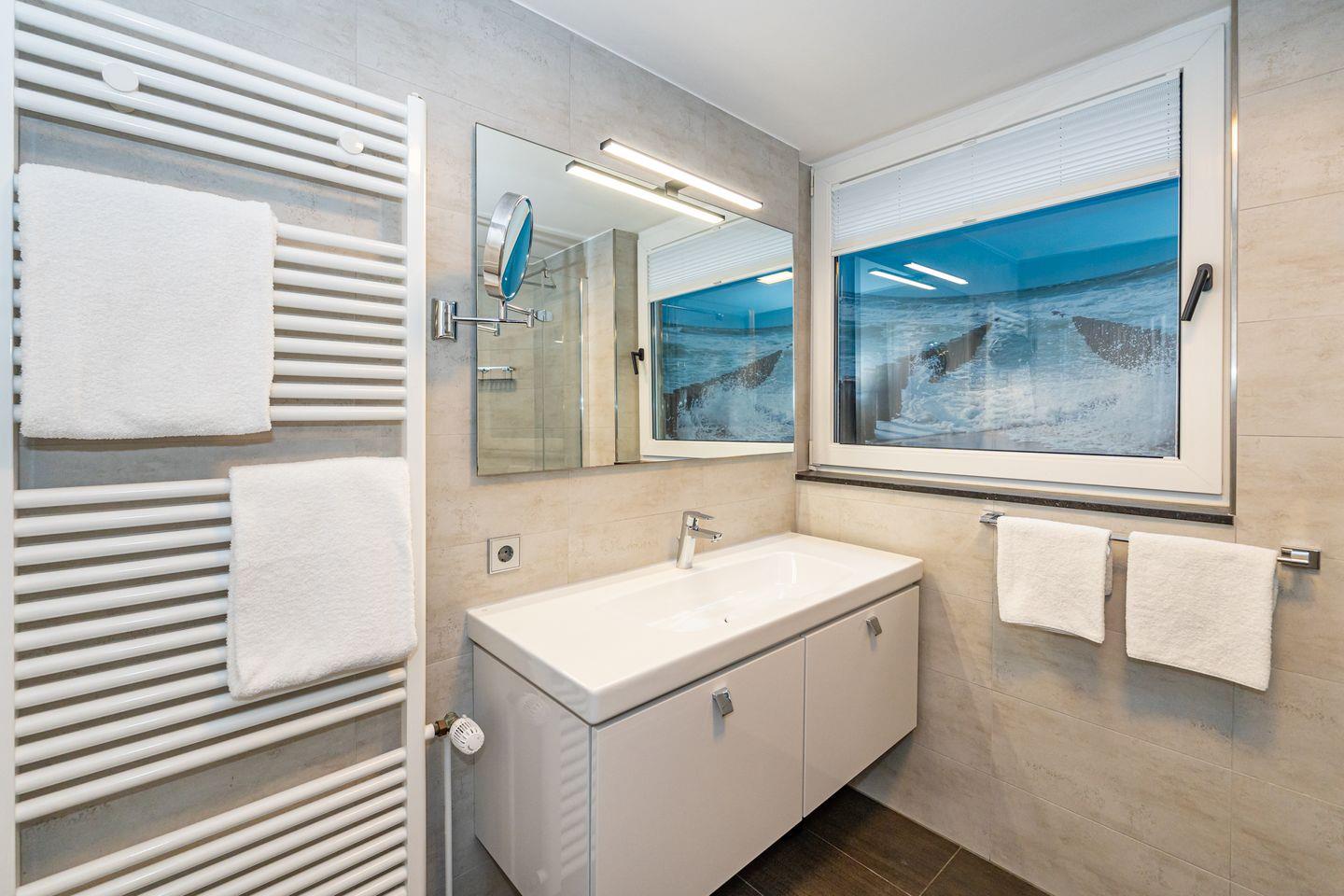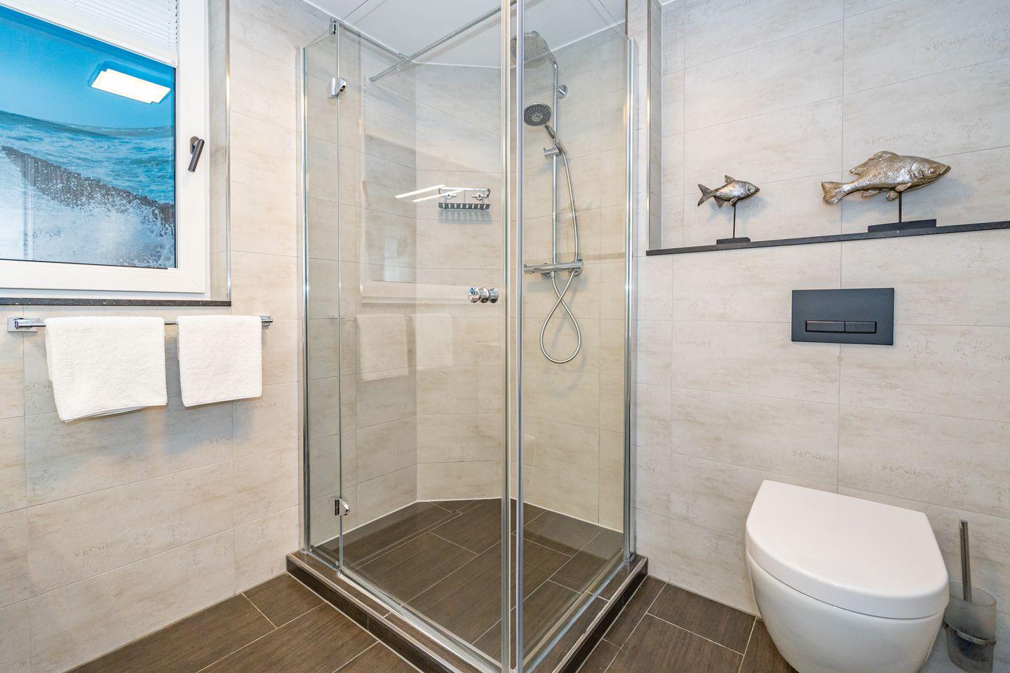 Sie bietet Platz für bis zu 3 Personen. Die ca. 65 qm Wohnfläche verteilen sich auf zwei Ebenen. Im EG befinden sich die offen gestaltete Küche mit angrenzendem Essbereich und das gemütliche Wohnzimmer. Im Wohnzimmer steht Ihnen ein Flachbildfernseher zur Verfügung. Die Ausstattung (Backofen, Spülmaschine, Cerankochfeld, Kaffeemaschine, Nespresso Maschine, Toaster, Wasserkocher) der hochwertigen Küche lässt keine Wünsche offen. Vom Wohnzimmer gelangt man auf die Terrasse mit Strandkorb und Gartenmöbeln, die zum Verweilen einlädt. Im Souterrain befinden sich ein Schlafzimmer mit Einzelbett (90 x 200 cm) und TV, ein Schlafzimmer mit Doppelbett und TV, ein Gäste-WC und das Bad mit bodentiefer Dusche und WC.