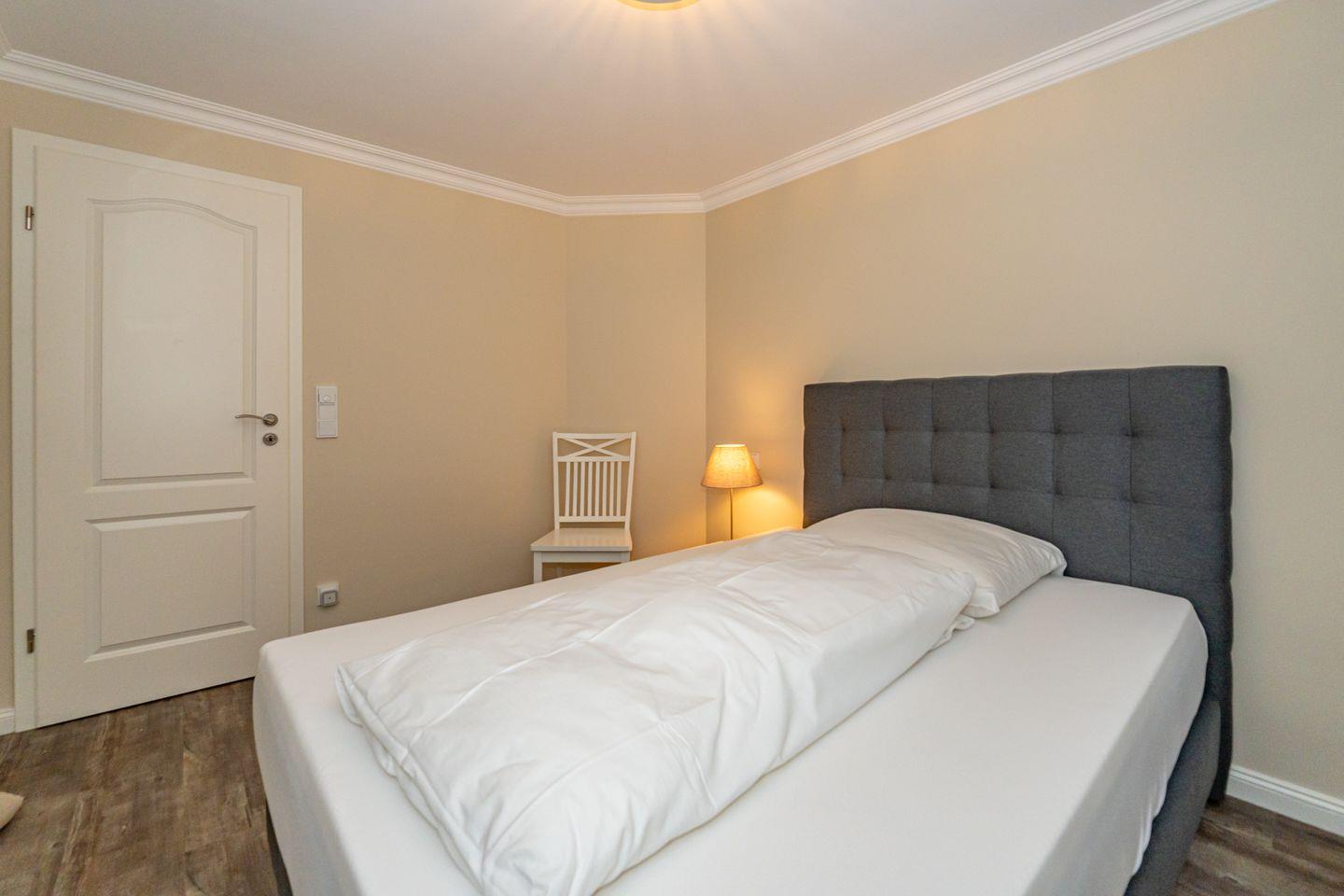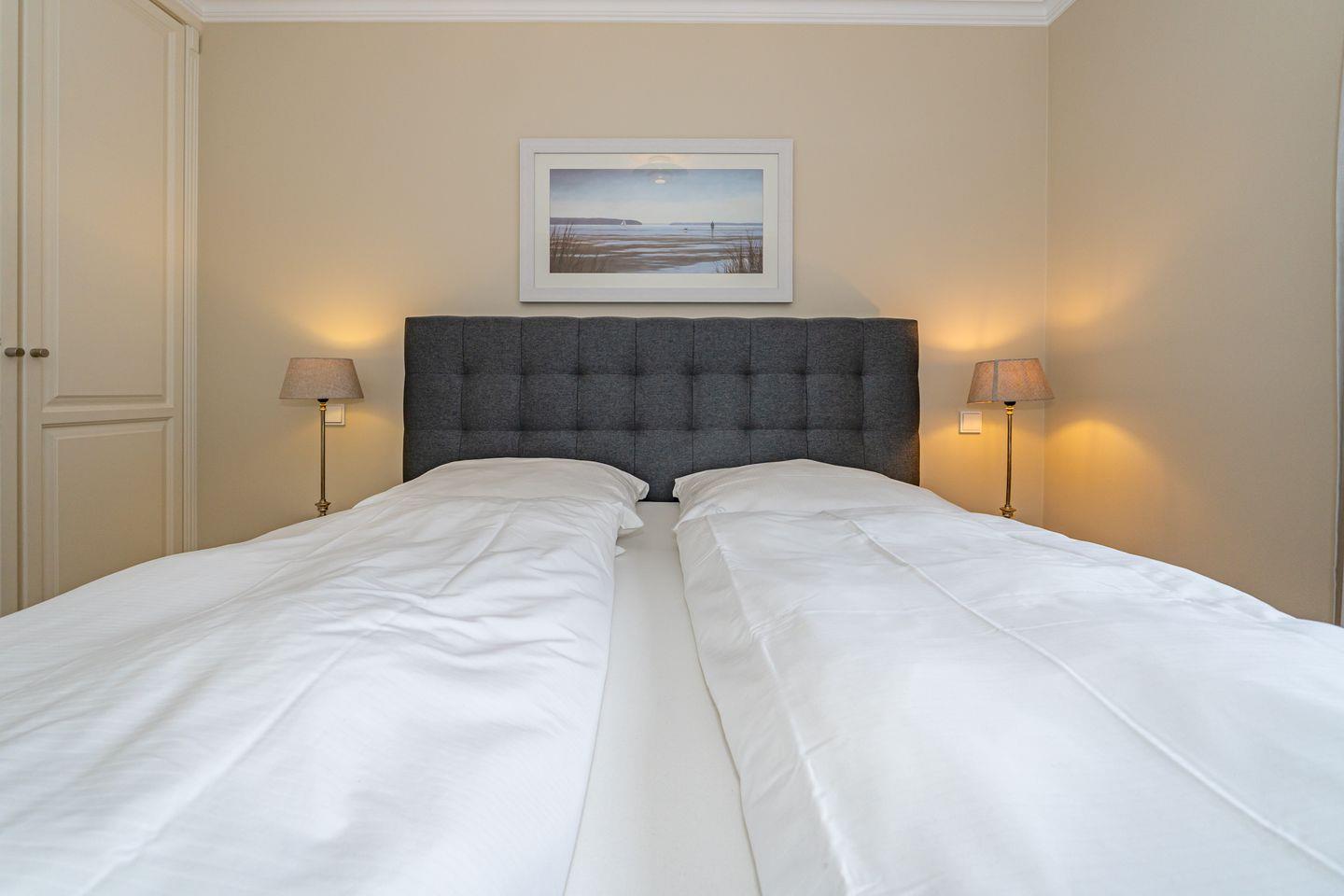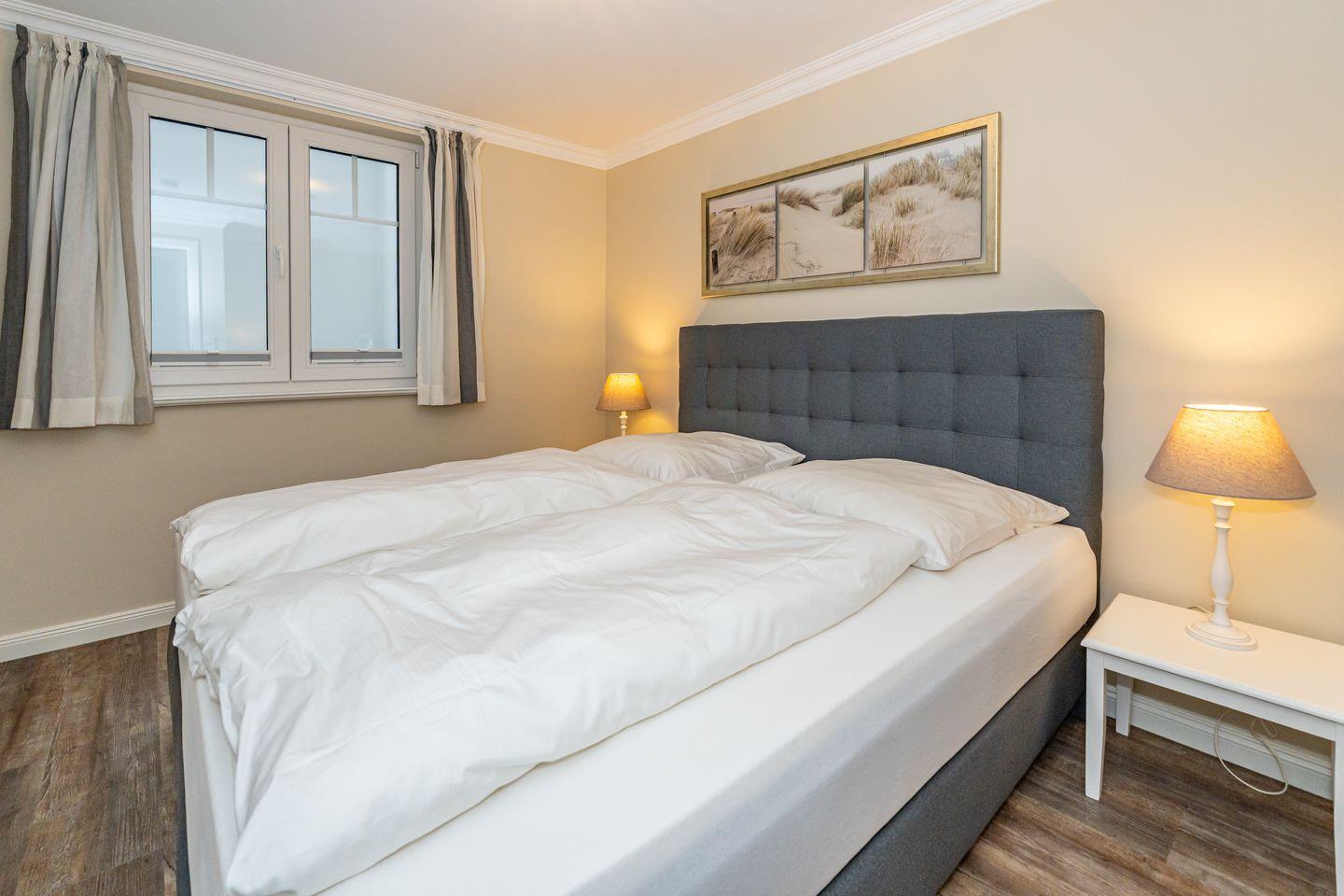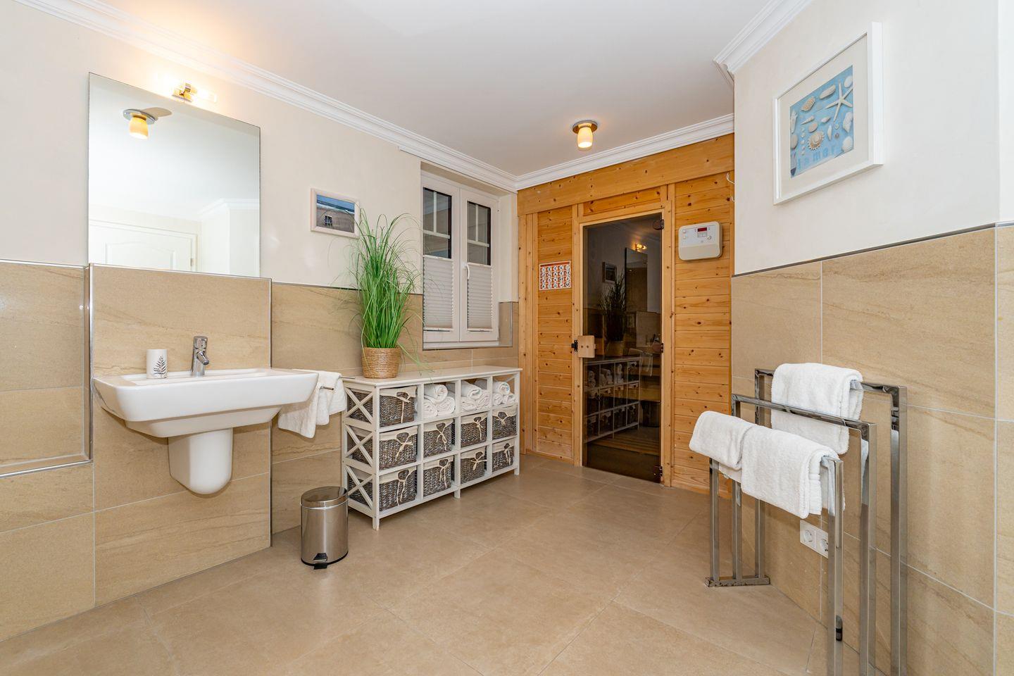 Die offene Küche mit Essgruppe, Backofen, Herd, Spülmaschine und Mikrowelle, sowie ein Schlafzimmer mit gemütlichen Doppelbett und ein Duschbad mit WC befinden sich ebenso auf dieser Ebene. Im Souterrain befinden sich zwei weitere Schlafzimmer, eines mit einem Doppelbett und eines mit einem Bett im französischen Maß. In der gesamten Ferienwohnung befinden sich geräumige, weiße Einbauschränke die Ihnen viel Stauraum bieten. Das Highlight dieser Ferienwohnung erwartet Sie ebenfalls im Untergeschoss. Das Badezimmer mit Sauna, Badewanne und Dusche/WC lässt auch an stürmischen Tagen keine Wünsche offen und sorgt für Entspannung pur. Waschmaschine und Trockner befinden sich in einem separaten Raum. Ein Pkw-Stellplatz steht Ihnen direkt am Haus zur Verfügung. Haustiere sind in dieser Ferienwohnung nicht erlaubt. Bitte beachten Sie, dass diese Ferienwohnung eine Nichtraucherwohnung ist.