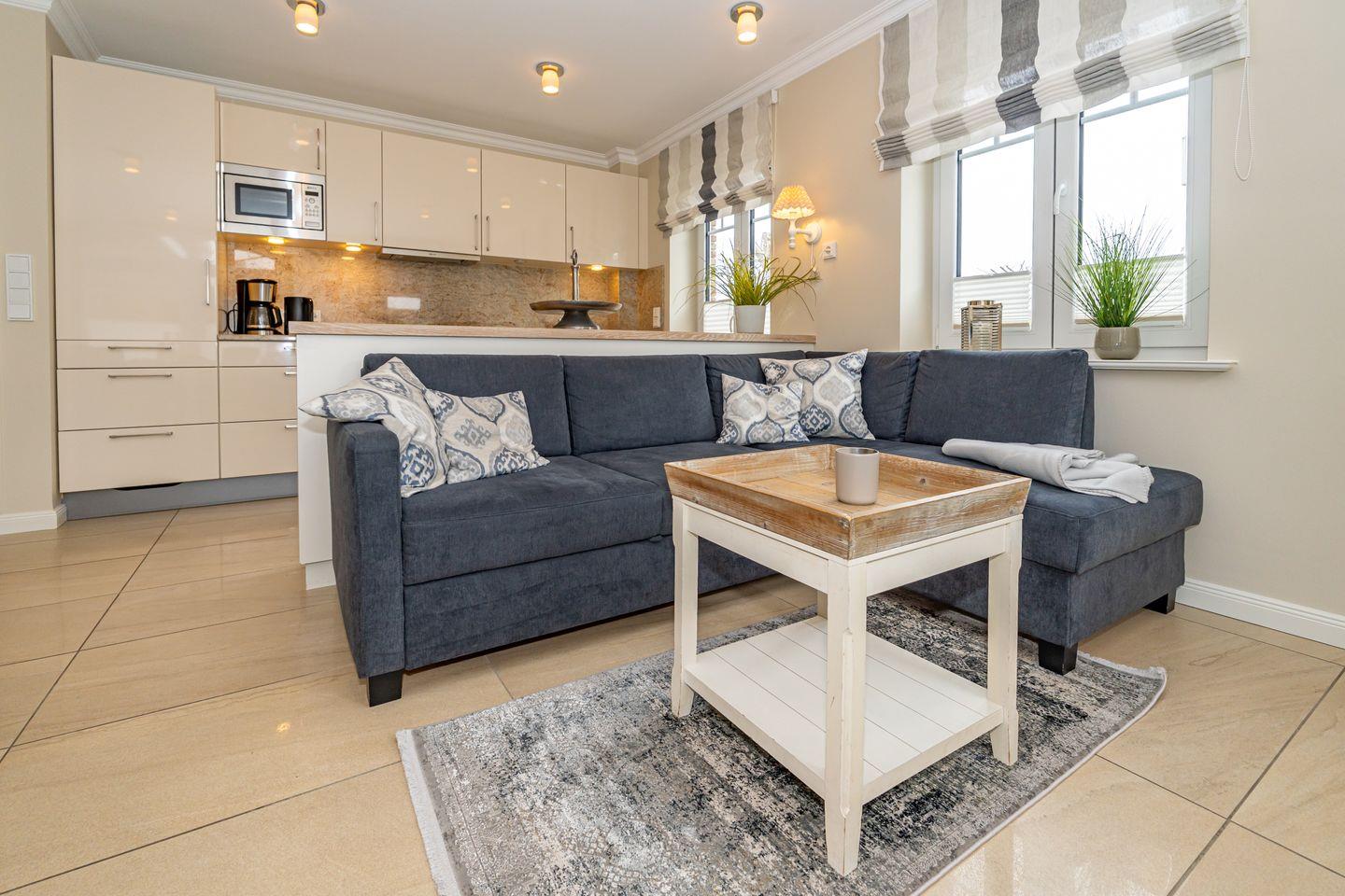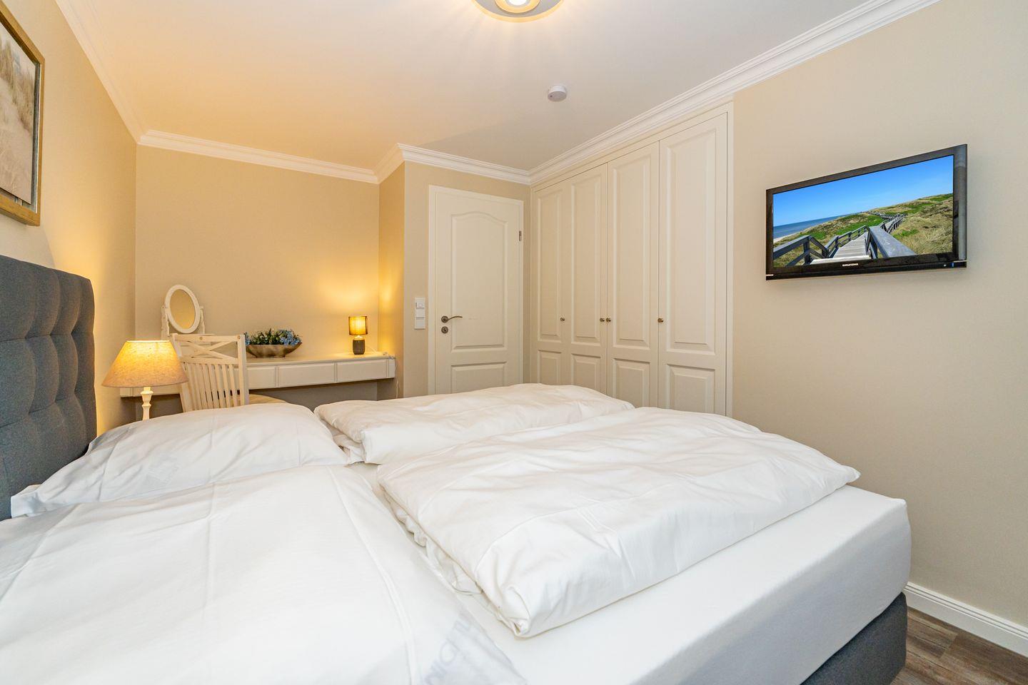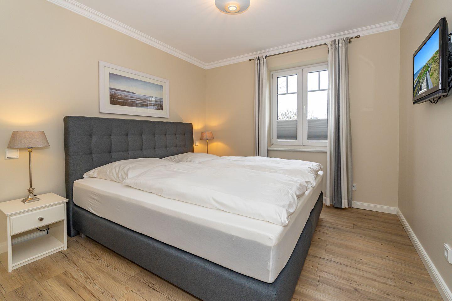 Die offene Küche mit Essgruppe, Backofen, Herd, Spülmaschine und Mikrowelle, sowie ein Schlafzimmer mit gemütlichen Doppelbett und ein Duschbad mit WC befinden sich ebenso auf dieser Ebene. Im Souterrain befinden sich zwei weitere Schlafzimmer, eines mit einem Doppelbett und eines mit einem Bett im französischen Maß. In der gesamten Ferienwohnung befinden sich geräumige, weiße Einbauschränke die Ihnen viel Stauraum bieten. Das Highlight dieser Ferienwohnung erwartet Sie ebenfalls im Untergeschoss. Das Badezimmer mit Sauna, Badewanne und Dusche/WC lässt auch an stürmischen Tagen keine Wünsche offen und sorgt für Entspannung pur. Waschmaschine und Trockner befinden sich in einem separaten Raum. Ein Pkw-Stellplatz steht Ihnen direkt am Haus zur Verfügung. Haustiere sind in dieser Ferienwohnung nicht erlaubt. Bitte beachten Sie, dass diese Ferienwohnung eine Nichtraucherwohnung ist.
