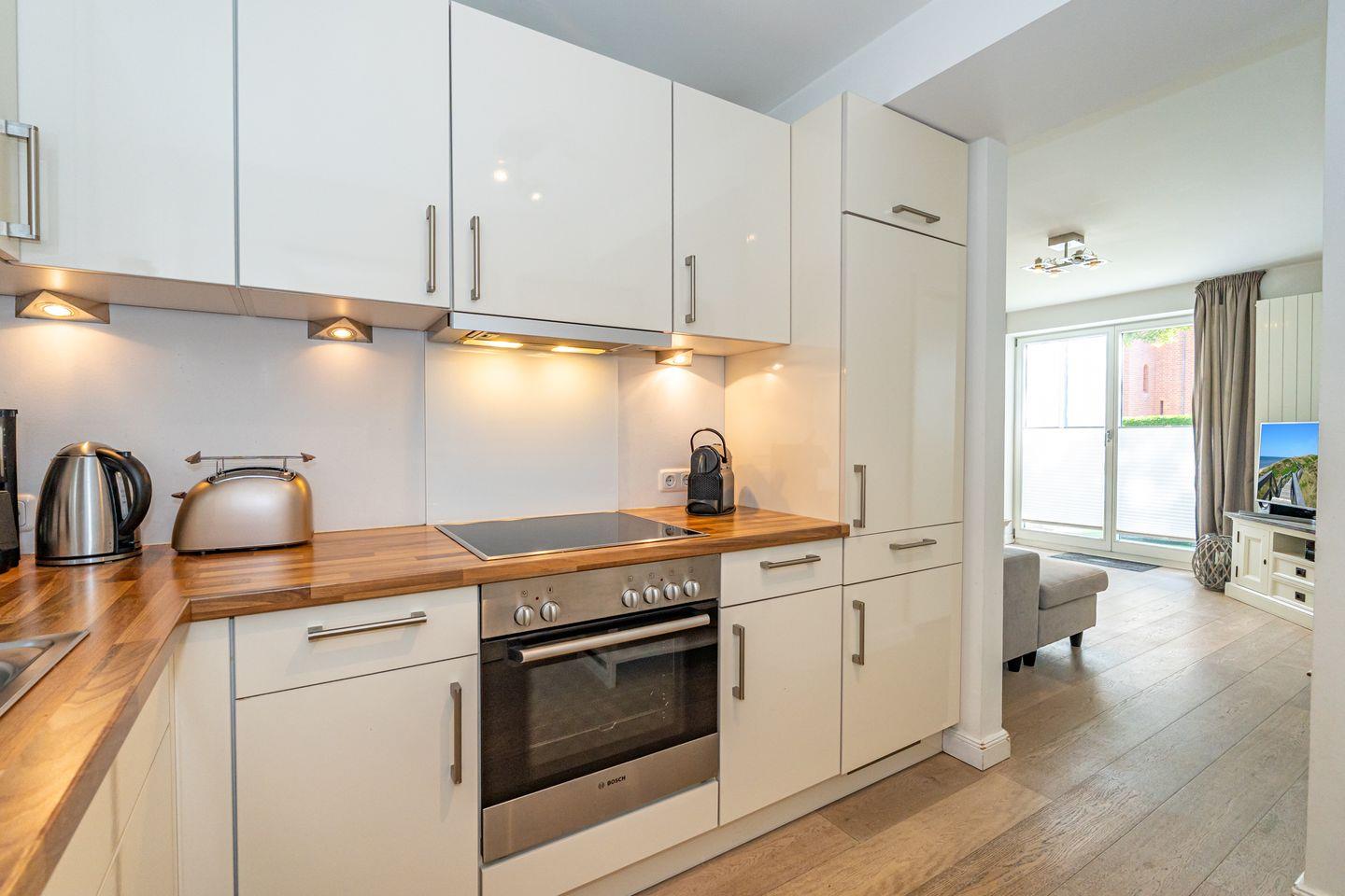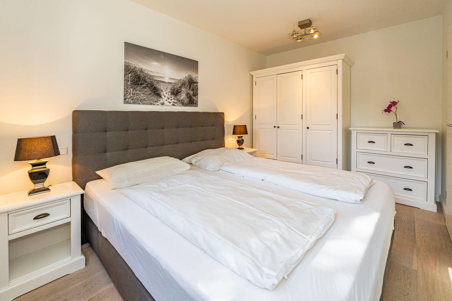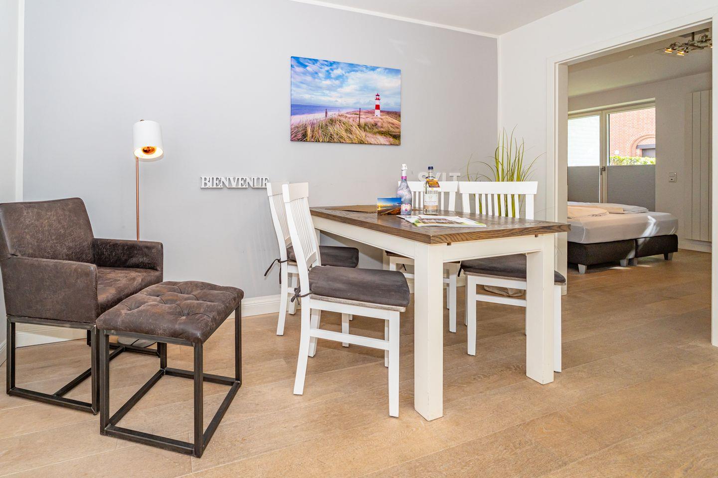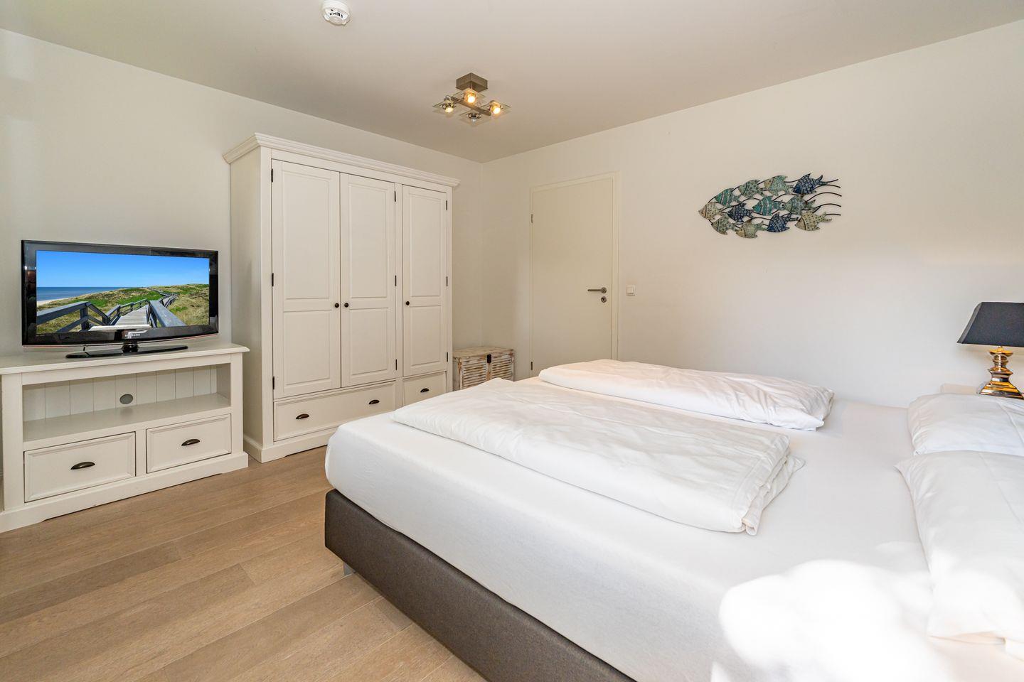Diese 3-Zimmer-Ferienwohnung (78 qm) befindet sich in einem Gebäude mit 22 Wohneinheiten. Die ebenerdige Ferienwohnung im Erdgeschoss besticht durch den großen, geräumigen Flur mit Einbaugarderobe und dem hellen, großzügigen Wohnzimmer mit Flachbildschirm und Esstisch. Die komplett ausgestattete und offene Küche (Mikrowelle, Kaffeefiltermaschine, Kühlschrank, Cerankochfeld, Backofen) ist direkt durch einen großen Durchgang vom Wohnzimmer aus zu erreichen. Von dort gelangen Sie in den Abstellraum, dort stehen Ihnen Waschmaschine und Trockner zur Verfügung. Das Badezimmer verfügt über einen Handtuchtrockner und eine bodentiefe Dusche. Abgerundet wird die Wohnung mit einer Terrasse (Süd-West-Ausrichtung), welche vom Wohnzimmer aus zu betreten ist und mit einem kleinen Gartenanteil umrundet wird. Ihnen stehen zwei Schlafzimmer mit jeweils Boxspringbett und TV zur Verfügung. Die Ferienwohnung liegt im Herzen von Westerland und ist somit auch sehr Stadt- und strandnah gelegen. In dieser Nichtraucherwohnung sind guterzogene Hunde nach vorheriger Anmeldung erlaubt (10,- € pro Tier/Tag). Ein Pkw-Stellplatz befindet sich in der Tiefgarage (Durchfahrtshöhe max. 2 Meter).