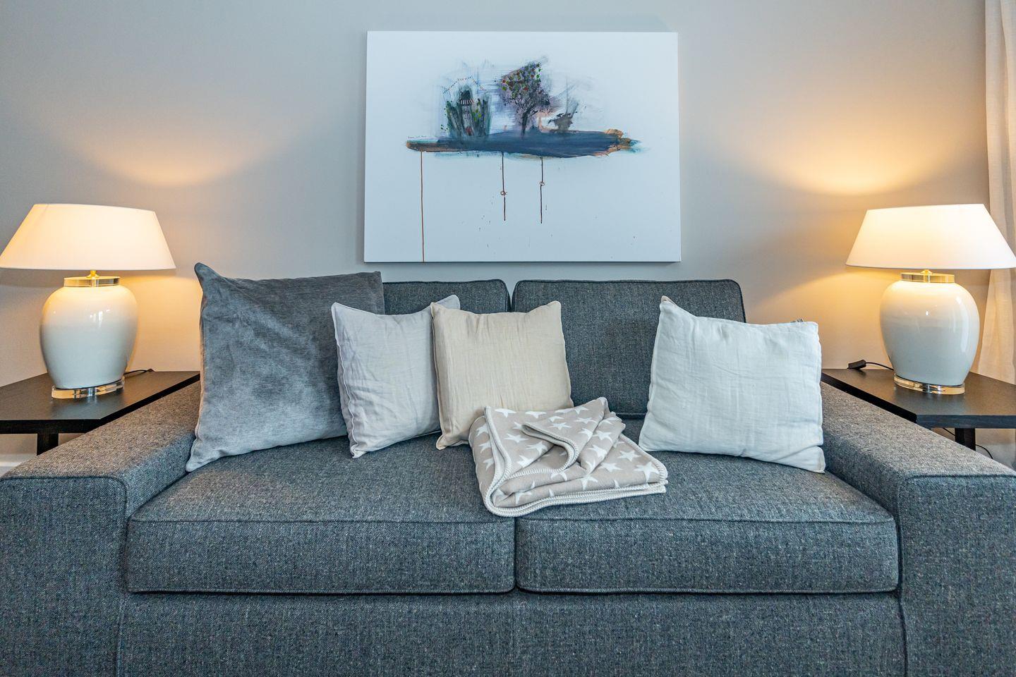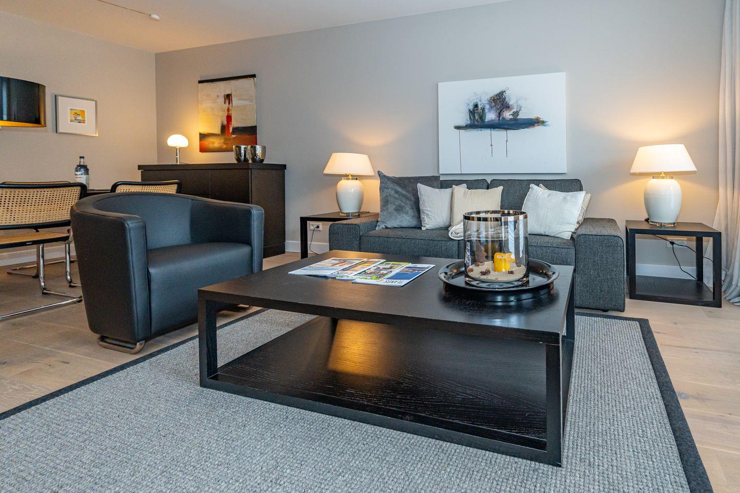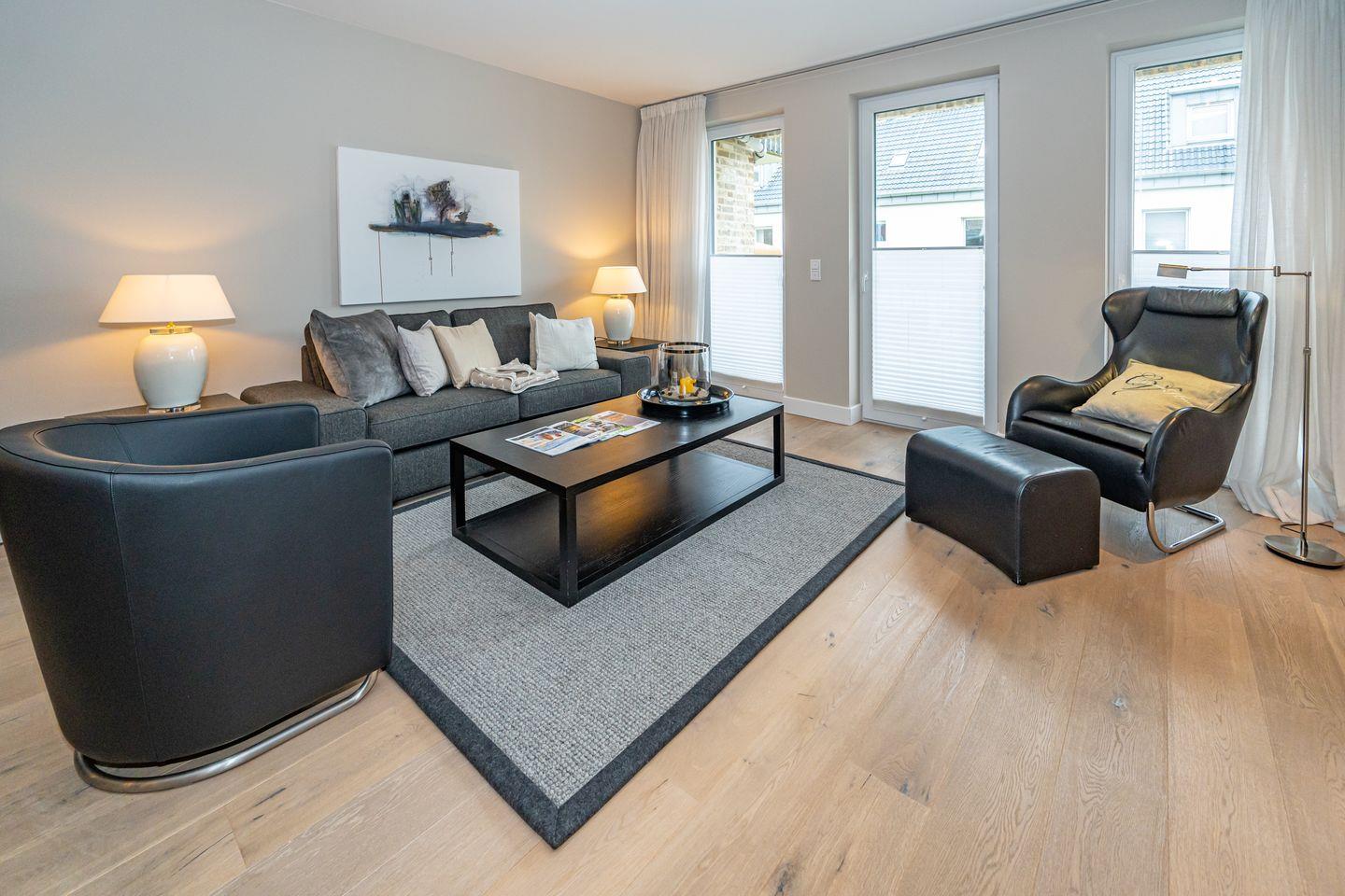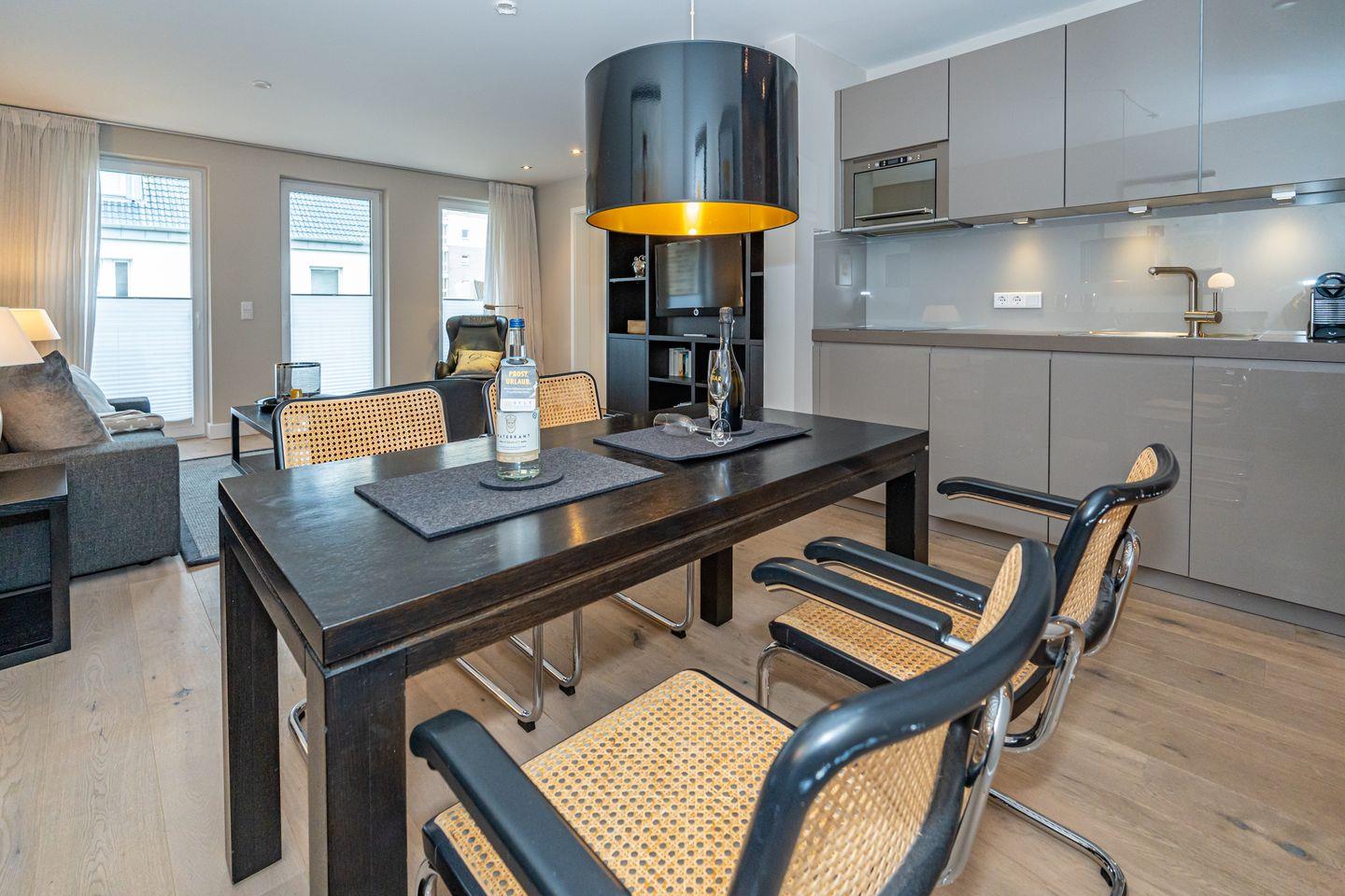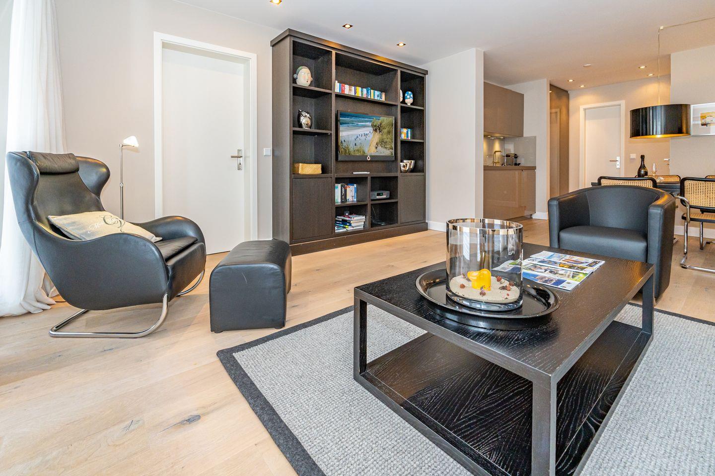 Mitten im Zentrum der Inselmetropole Westerland liegt diese 2-Zi.Ferienwohnung. (ca. 70 qm) im ersten Obergeschoss. Ein Tiefgaragenstellplatz und Fahrstuhl stehen Ihnen zur Verfügung. Durch den Flur mit Garderobe gelangen Sie in den offenen Wohn- und Essbereich. Hier erwartet Sie eine gemütliche Couch-Landschaft, Sessel, TV und Esstisch. Die offene Küche ist ausgestattet mit allem was man braucht, wie zum Beispiel einem Mikrowellenbackofen, Geschirrspüler, Kaffee- sowie eine Nespressomaschine. Nebenan befindet sich das Schlafzimmer mit Doppelbett (180 x 200cm), Einbauschrank und einem weiteren Flat-TV. Angrenzend an das Schlafzimmer befindet sich ein geräumiges Duschbad.