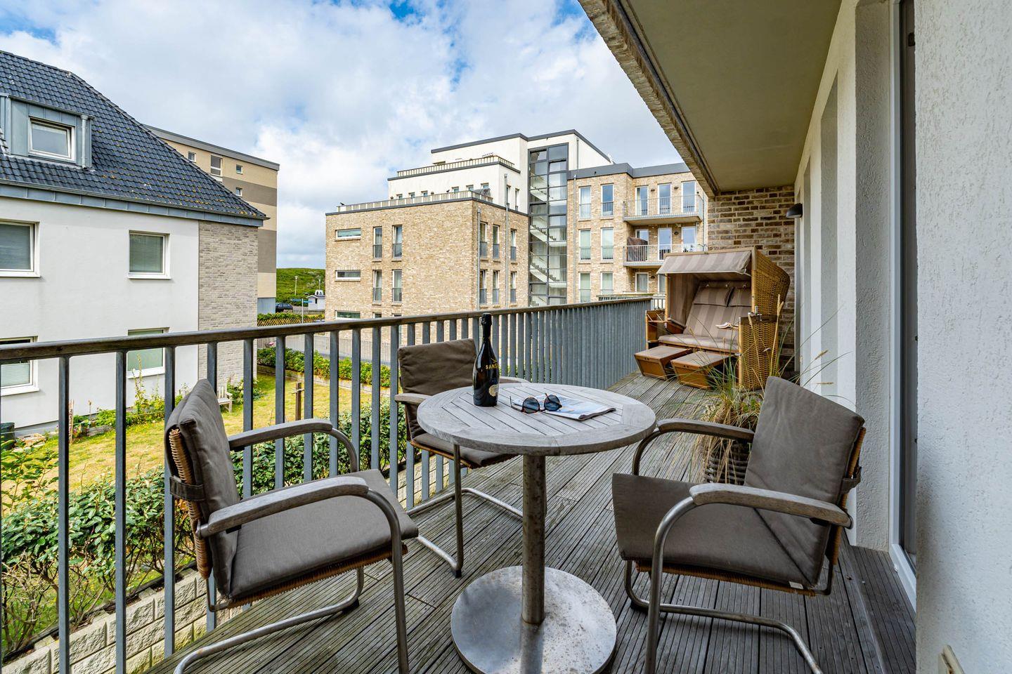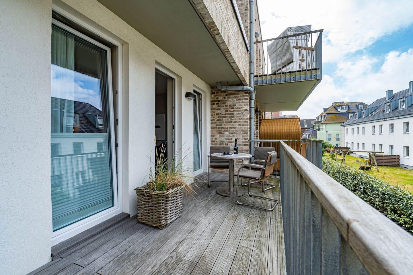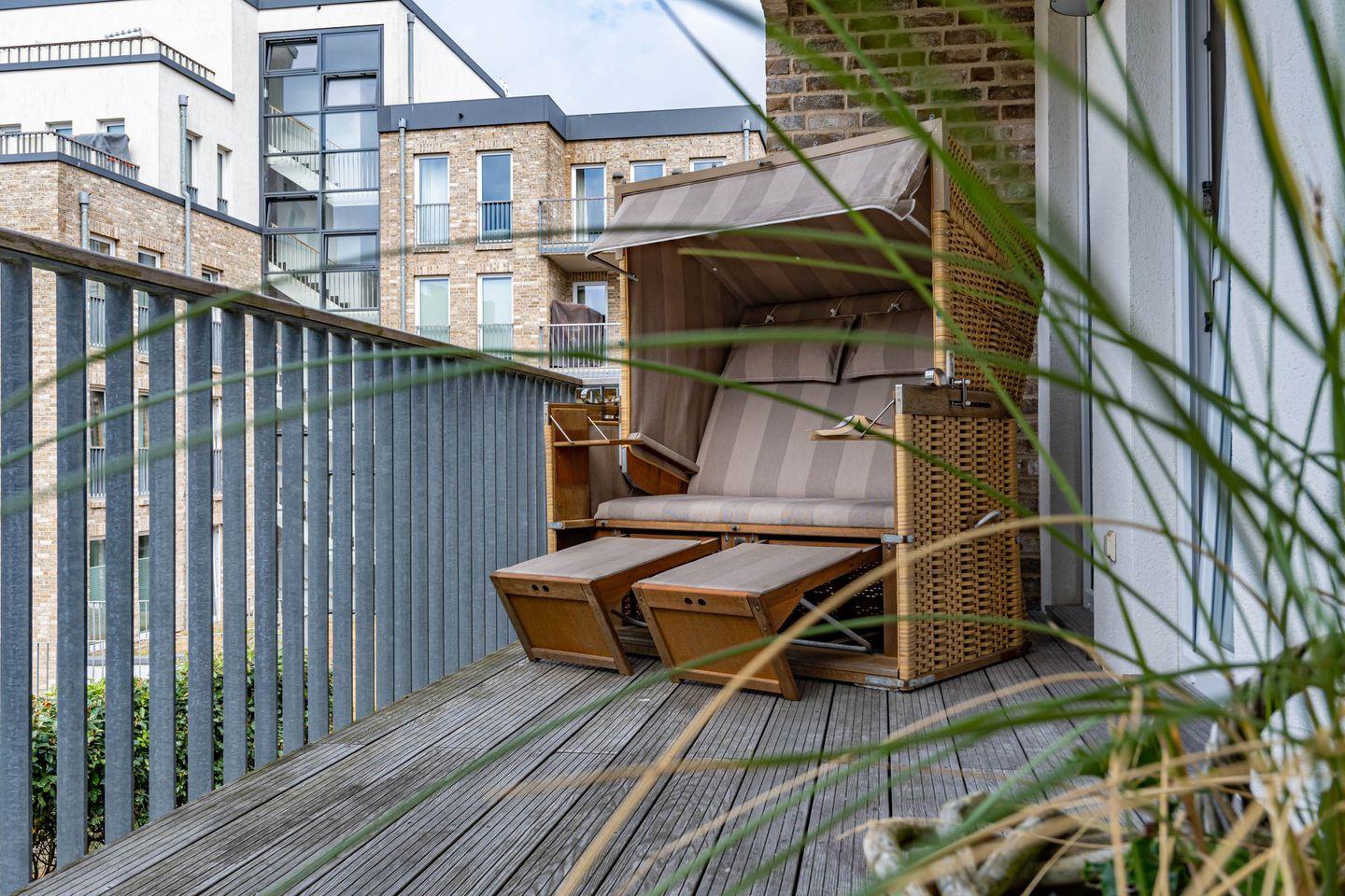 Vom Wohnbereich aus gelangen Sie in das Gäste WC. Die Ferienwohnung verfügt über einen nach Westen ausgerichteten Balkon, den Sie vom Wohn-, als auch Schlafbereich aus betreten können und der mit einem Strandkorb, Tisch und Stühlen ausgestattet ist.