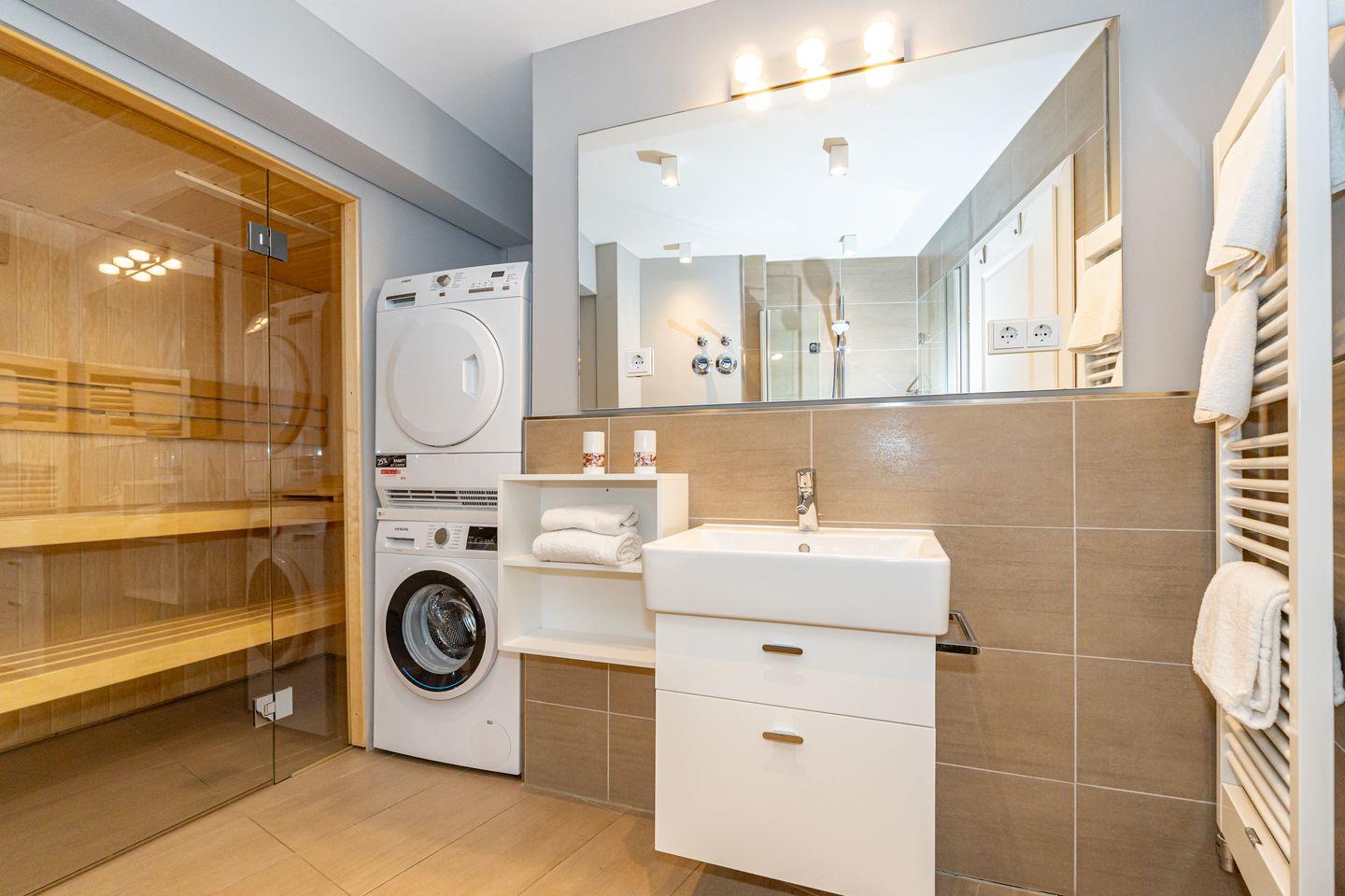 Diese moderne Ferienwohnung bietet bequem Platz für bis zu vier Personen und verfügt über zwei Schlafzimmer sowie zwei Badezimmer. Die voll ausgestattete Küche und die Sauna sorgen für zusätzlichen Komfort.