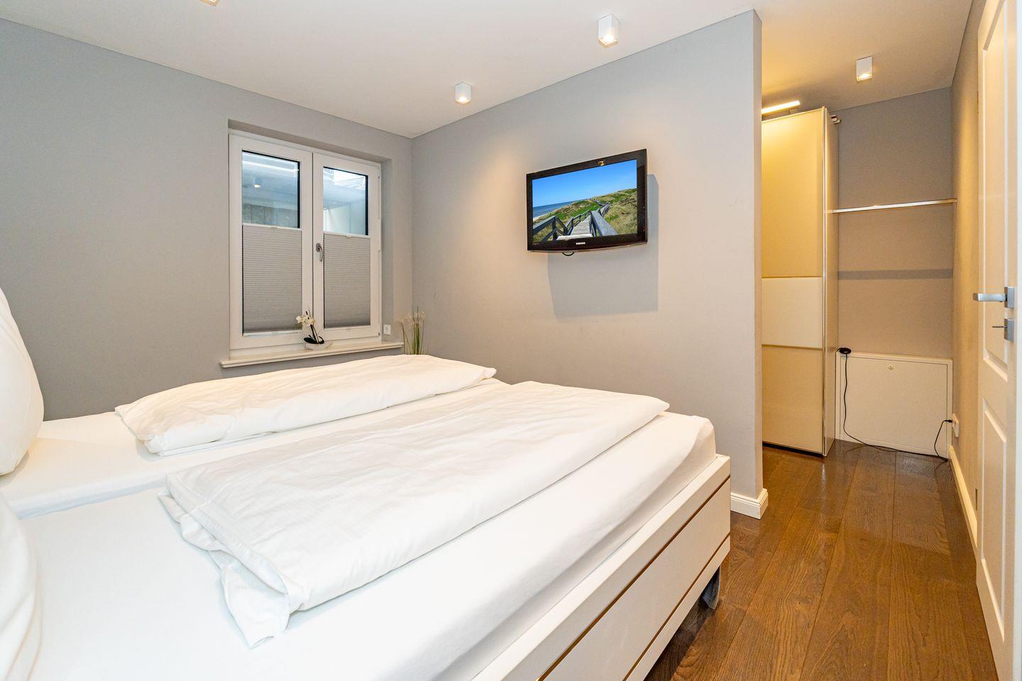 Die 3-Zimmer-Ferienwohnung teilt sich in Erdgeschoss und Untergeschoss auf. Das Erdgeschoss hat ein kombiniertes Wohn- & Esszimmer, das mit einer gemütlichen Sofalandschaft und Sessel, sowie einen TV und Esstisch ausgestattet ist. Von hier aus haben Sie Zugang zur westlich ausgerichteten Terrasse mit Gartenmöbeln und Strandkorb (saisonal). Die hochwertige, offene Küche ist ausgestattet mit einem Backofen, Geschirrspüler, Kaffeemaschine, Toaster und Wasserkocher. Auf der selben Ebene befindet sich ein Badezimmer mit Dusche und WC. Über eine Treppe gelangen Sie in das Untergeschoss. Hier befinden sich 2 geräumige Schlafzimmer mit Doppelbetten und TV. Ein Schlafzimmer hat einen begehbaren Kleiderschrank. In dem zweiten Duschbad mit WC stellen wir unseren Gästen eine Waschmaschine, einen Trockner, sowie eine Sauna zur Verfügung.