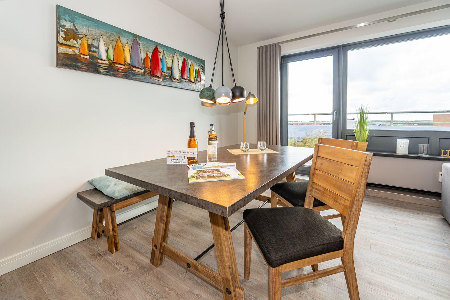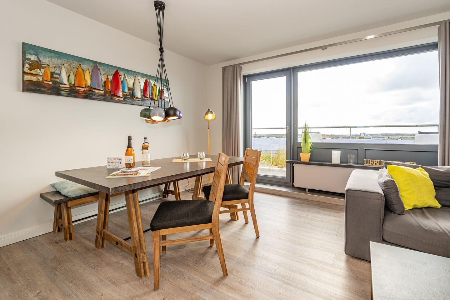 2- Zimmer Penthouse Ferienwohnung im Herzen von Westerland (65 qm) mit seitlichem Meerblick, über eine Ebene für bis zu 2 Personen. Sehr hochwertig und geschmackvoll eingerichtet. Ein stylisches Wohnzimmer mit Couch und Flatscreen., angrenzend ein einladender, offener Essbereich mit Esstisch, zwei Stühlen und eine Bank. Offene Küche mit Kapselkaffeeautomat, Geschirrspüler, Ceranfeld, Backofen und dem üblichen Komfort. Ein helles Schlafzimmer mit Doppelbett (2x 90x200cm), Kleiderschrank und TV. Badezimmer (Duschbad) mit Dusche, WC, Waschbecken, Handtuchwärmer und Föhn. Zur Wohnung gehört ein Tiefgaragenparkplatz, von hier aus erreichen Sie die Penthouse Ferienwohnung mit dem Fahrstuhl. Bitte beachten Sie, dass Haustiere in dieser Ferienwohnung nicht erlaubt sind und diese Ferienwohnung eine Nichtraucherwohnung ist. Vom Wohnbereich und vom Schlafzimmer haben Sie Zutritt zum Balkon mit Gartenmöbeln.