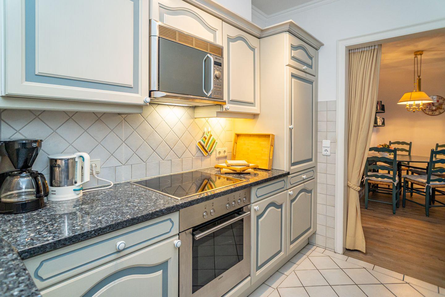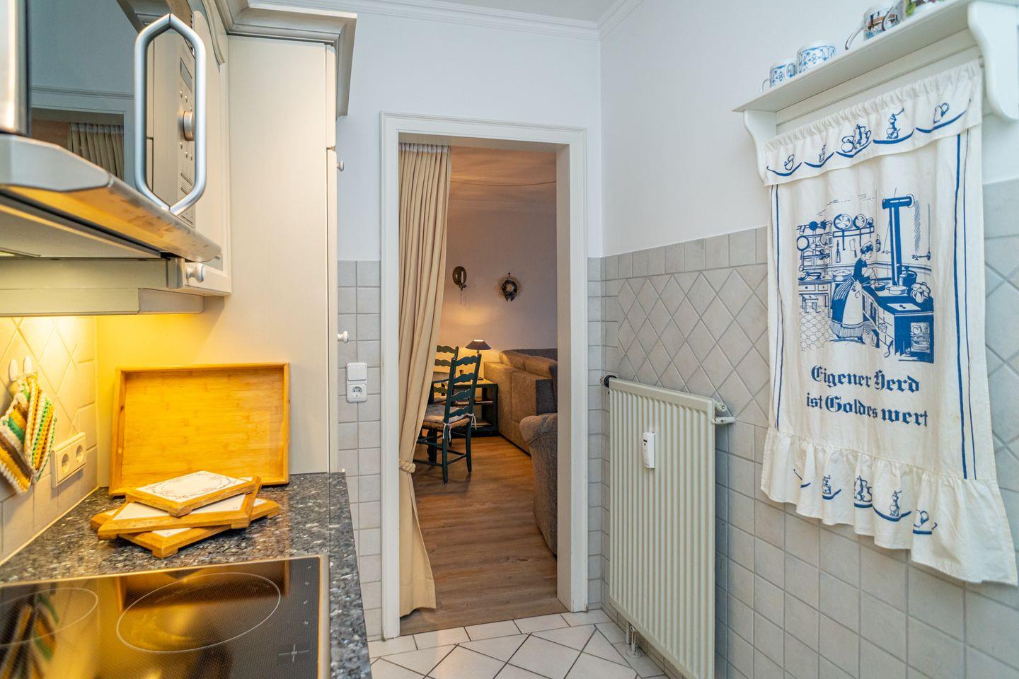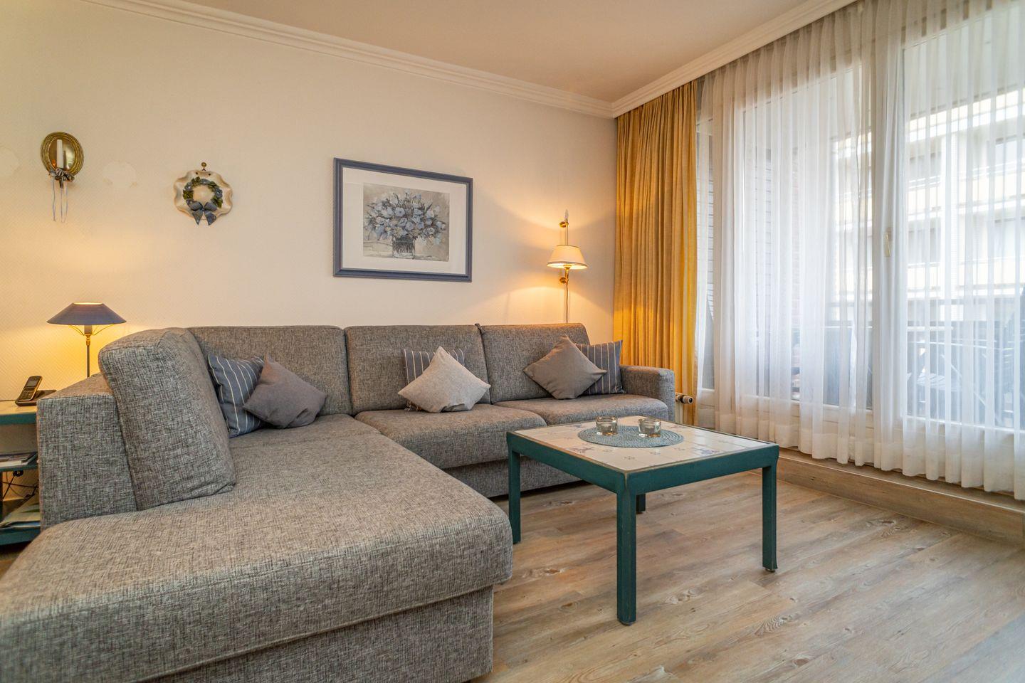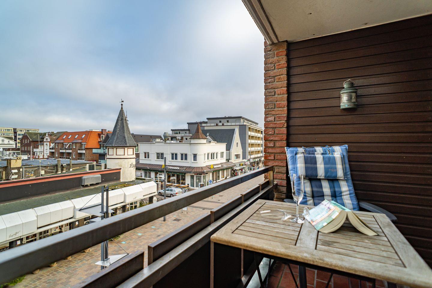 Diese, im friesischen Stil gehaltene Ferienwohnung, liegt mitten im Herzen von Westerland mit Blick auf die Westerländer Flaniermeile. Der Strand ist in greifbarer Nähe. Wohnzimmer mit bequemer Sitzgarnitur (Schlafsofa) , Flatscreen, DVD- Player, Stereoanlage und gemütlicher Essecke. Von dort aus gelangen Sie auf den windgeschützten Balkon mit gemütlichen Gartenmöbeln. Eine Küche mit Ceran-Kochfeld, Mikrowelle, Geschirrspüler, Filter-Kaffeemaschine, Wasserkocher und Toaster sind selbstverständlich. Das Schlafzimmer verfügt über ein Doppelbett (180x200 cm) und großzügigem Stauraum für Ihre Garderobe. Im Bad befindet sich eine Badewanne mit Duschabtrennung, WC, Waschtisch Kosmetikspiegel und Fön sowie genügend Abstellmöglichkeiten. Es steht Ihnen ein Tiefgaragen-Stellplatz zur Verfügung. Im Waschkeller steht eine Waschmaschine und ein Trockner zur gemeinschaftlichen Nutzung bereit. Die Ferienwohnung ist ein Nichtraucher Domizil und es sind keine Hunde gestattet.