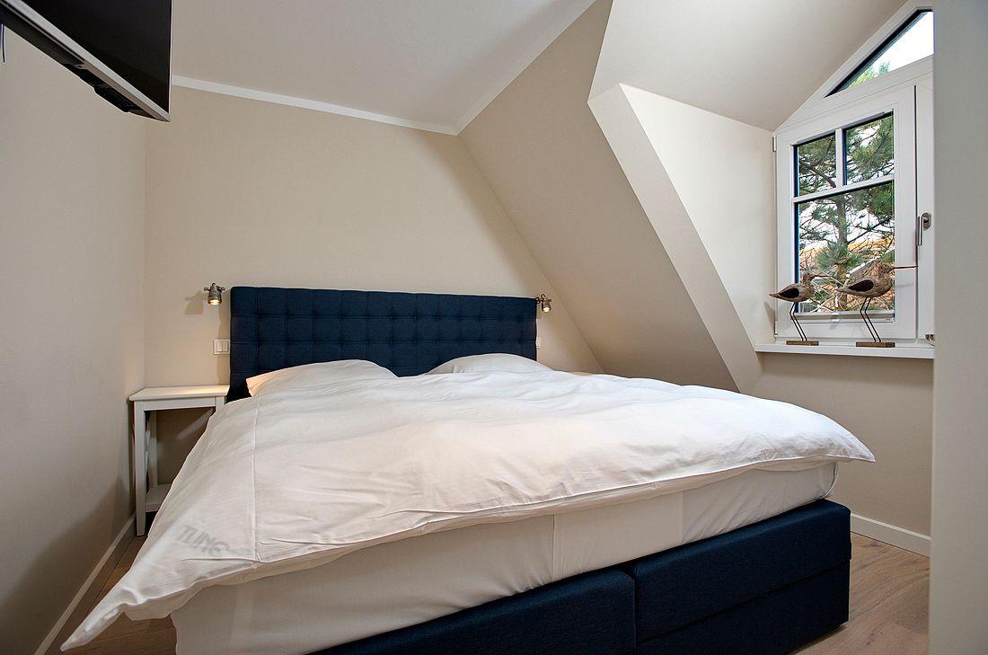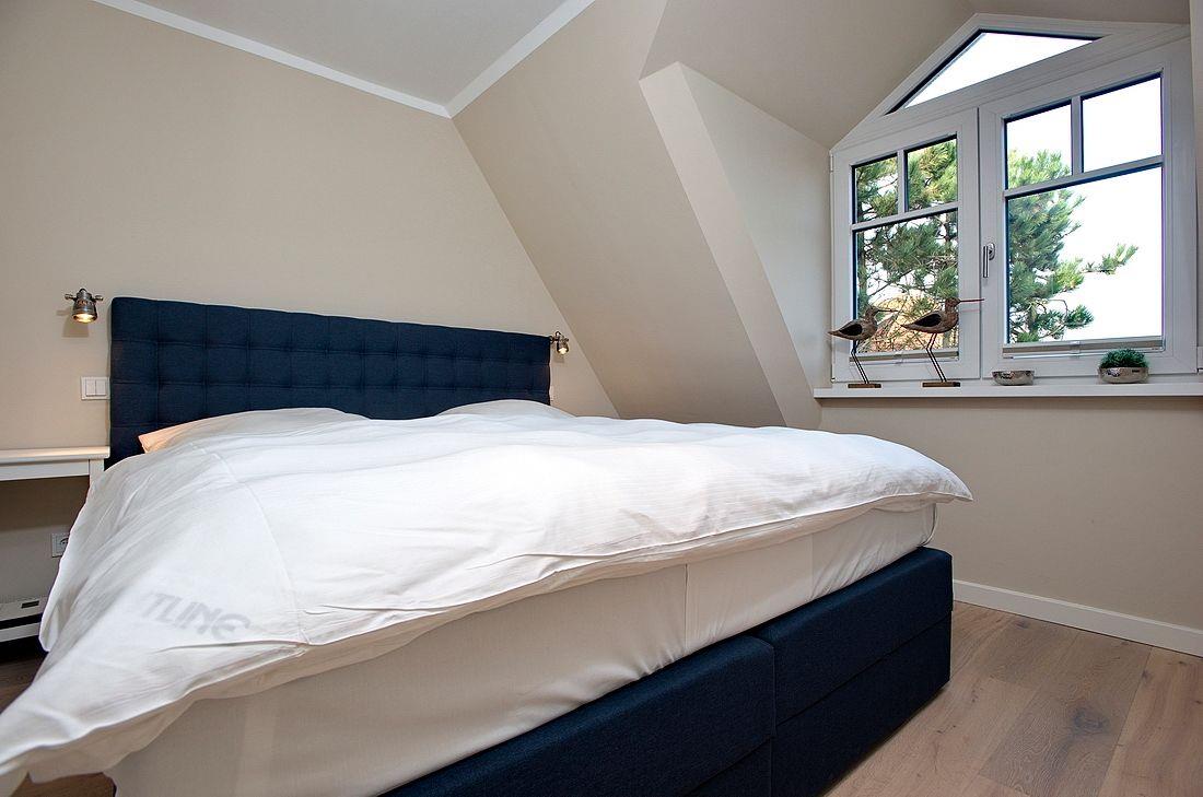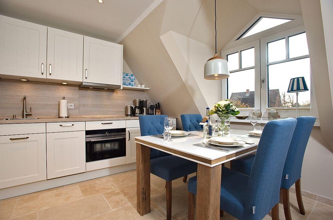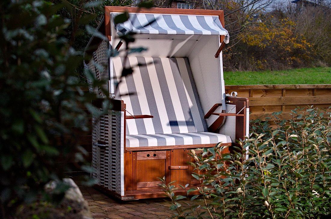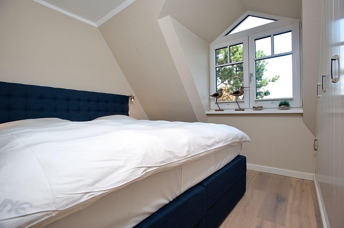 Durch einen eigenen Eingang treten Sie in einen kleinen Flur. Die Ferienwohnung erreichen Sie über eine Treppe die ins erste OG führt. Die offene Küche im Obergeschoss, ist modern eingerichtet und bietet Ihnen einen Geschirrspüler, Kühlschrank mit kleinem Eisfach, Backofen-Mikrowellenkombi, Kaffeefiltermaschine und einen Esstisch. Vom Wohnraum aus, mit einem gemütlichen Sofa, erreichen Sie den Balkon, auf dem Sie im Sommer Sylt-Open-Air-Feeling genießen können. Auf gleicher Ebene finden Sie das moderne Badezimmer, mit begehbarer Regendusche, Handtuch-Heiztrockner und WC. Das erste Schlafzimmer mit Boxspringbett (180 cm x 200 cm) und Flat-TV befindet sich ebenfalls auf dieser Ebene. Über die Treppe gelangen Sie in das Dachgeschoss, in dem sich ein weiteres Schlafzimmer mit einem Einbau-Kojen-Doppelbett (160 cm x 200 cm) und Flat-TV und einer gemütlichen Leseecke befindet. Im Garten steht Ihnen eine kleine Sonnenkuhle mit Strandkorb zum ausgiebigen relaxen zur Verfügung. Dort ist auch eine Vorrichtung zur Sicherungen Ihrer Fahrräder angebracht.