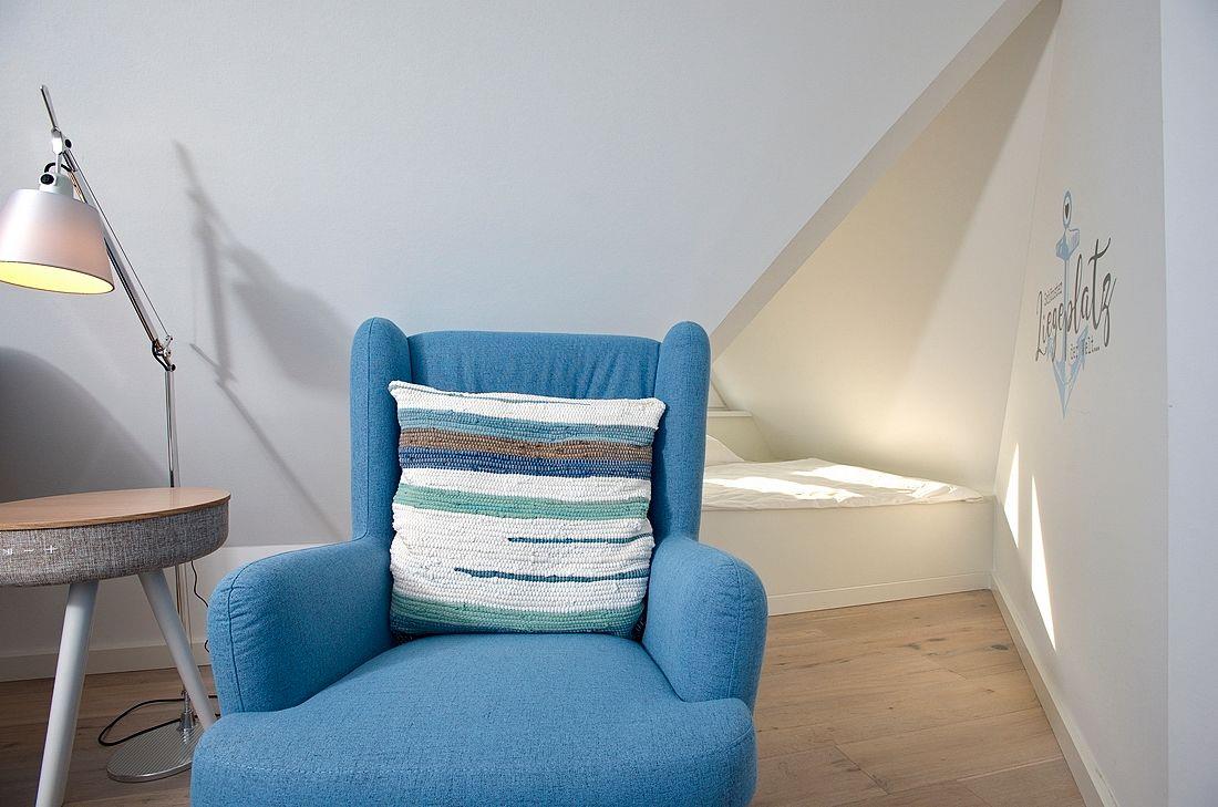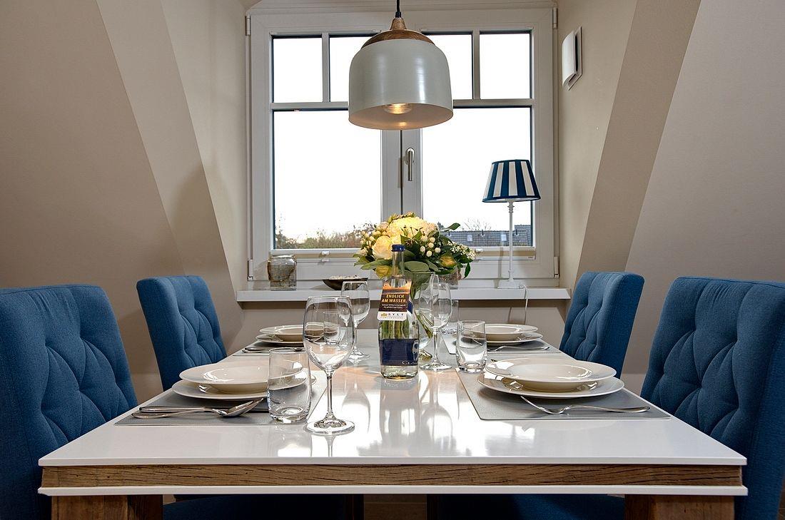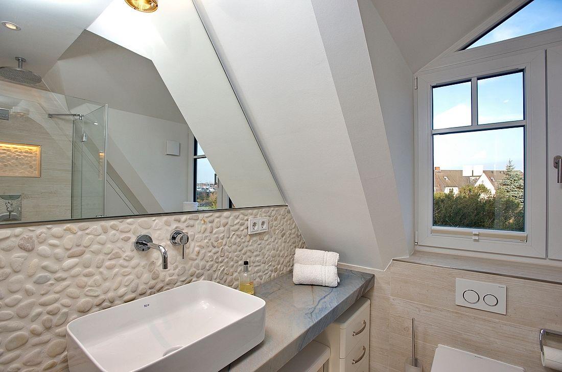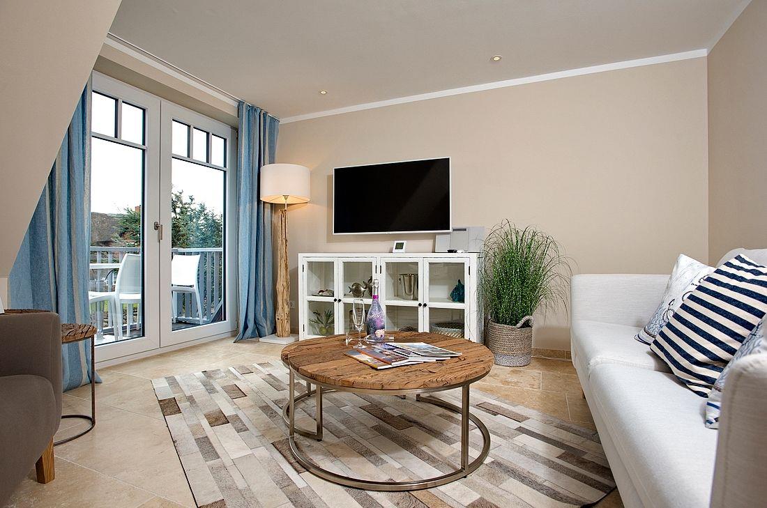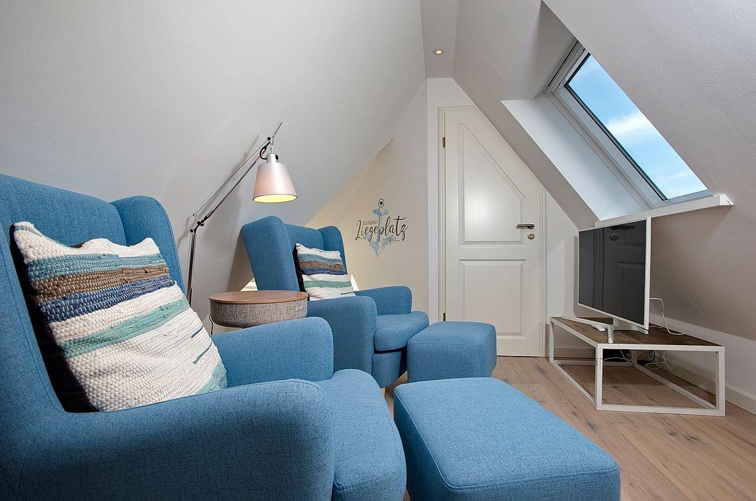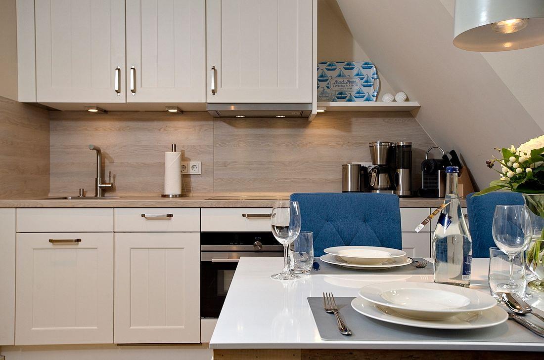 Durch einen eigenen Eingang treten Sie in einen kleinen Flur. Die Ferienwohnung erreichen Sie über eine Treppe die ins erste OG führt. Die offene Küche im Obergeschoss, ist modern eingerichtet und bietet Ihnen einen Geschirrspüler, Kühlschrank mit kleinem Eisfach, Backofen-Mikrowellenkombi, Kaffeefiltermaschine und einen Esstisch. Vom Wohnraum aus, mit einem gemütlichen Sofa, erreichen Sie den Balkon, auf dem Sie im Sommer Sylt-Open-Air-Feeling genießen können. Auf gleicher Ebene finden Sie das moderne Badezimmer, mit begehbarer Regendusche, Handtuch-Heiztrockner und WC. Das erste Schlafzimmer mit Boxspringbett (180 cm x 200 cm) und Flat-TV befindet sich ebenfalls auf dieser Ebene. Über die Treppe gelangen Sie in das Dachgeschoss, in dem sich ein weiteres Schlafzimmer mit einem Einbau-Kojen-Doppelbett (160 cm x 200 cm) und Flat-TV und einer gemütlichen Leseecke befindet. Im Garten steht Ihnen eine kleine Sonnenkuhle mit Strandkorb zum ausgiebigen relaxen zur Verfügung. Dort ist auch eine Vorrichtung zur Sicherungen Ihrer Fahrräder angebracht.