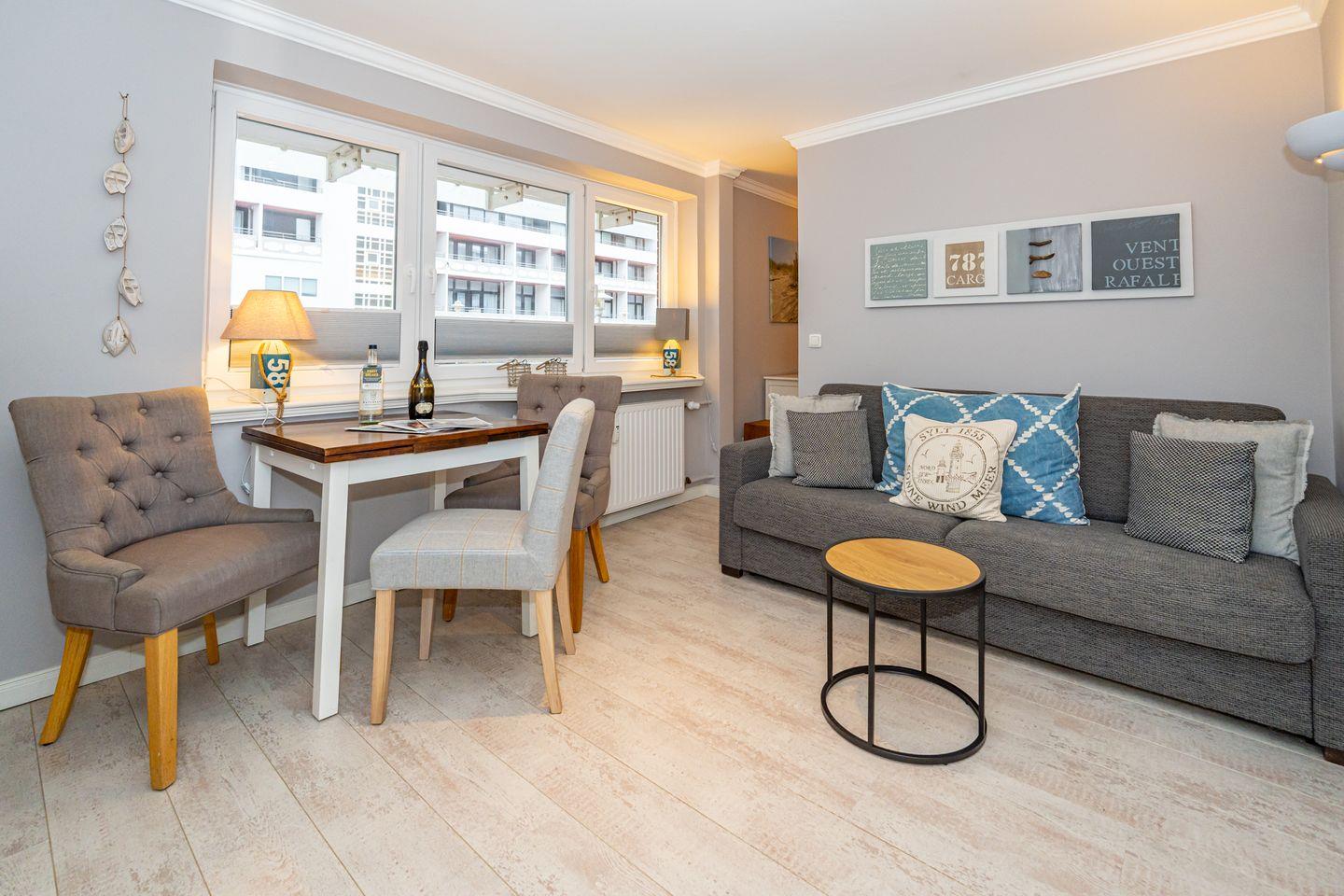 Die 1-Zimmer-Ferienwohnung (ca. 35m²) liegt im ersten Obergeschoss in unmittelbarer Stadt- und Strandnähe. Die Ferienwohnung verfügt über ein Duschbad mit WC, eine Küchenzeile und einen kombinierten Wohnraum mit Trennwand zum Schlafzimmer. Das Wohnzimmer bietet Ihnen einen Essplatz, sowie eine gemütliche Ausziehcouch mit Blick auf den Flatscreen mit Kabelanschluss. Der Schlafbereich verfügt über ein Doppelbett (160 cm x 200 cm) und ist durch eine durchgehende Trennwand (von der Decke bis zum Fußboden) vom Wohnbereich getrennt. Haustiere sind nach Absprache erlaubt (10,- € pro Tier/Tag).