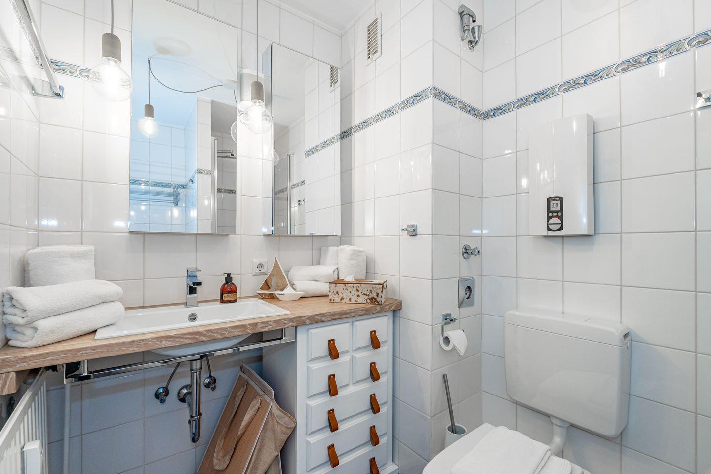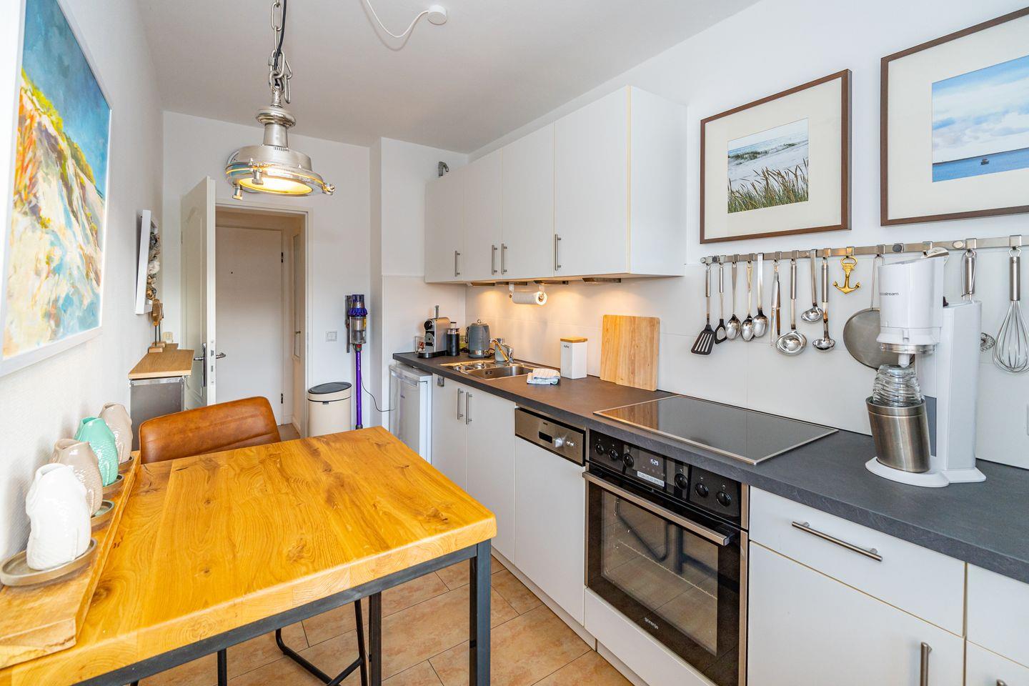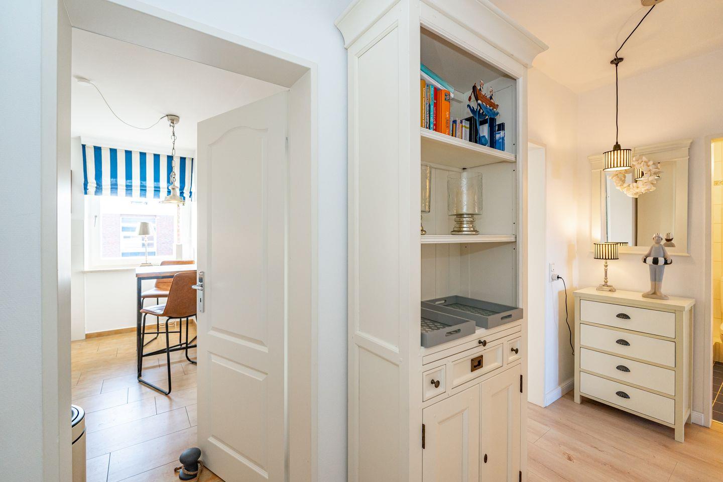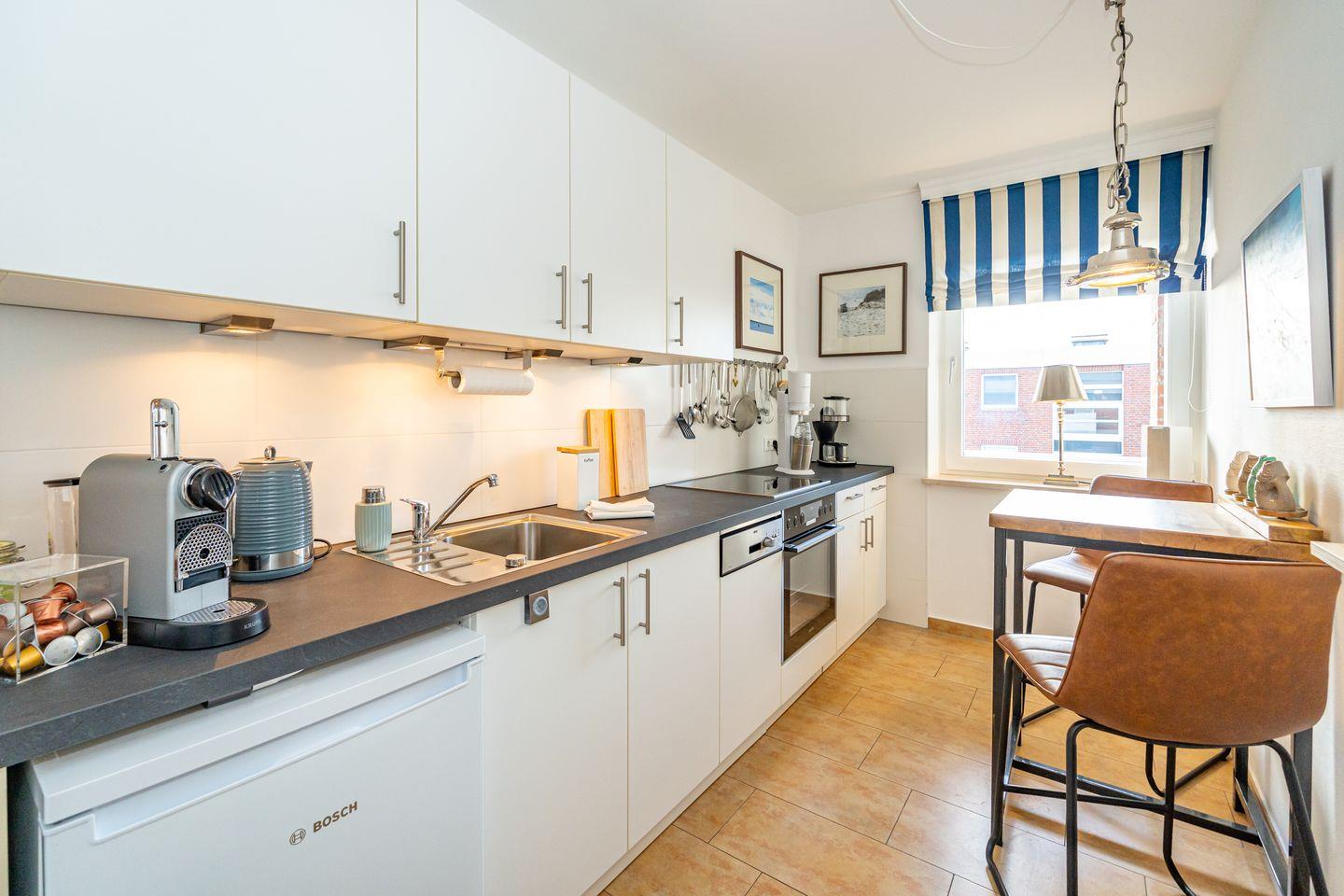Vom Flur aus gehen alle Zimmer dieser Ferienwohnung ab. Im Wohnzimmer finden Sie neben einem einladenden Essbereich ein gemütliches Sofa. Zusätzliche Ausstattungsmerkmale sind die SONOS-Lautsprecher und der große SMART-TV mit integriertem WLAN. Von hier aus haben Sie Zutritt zum Balkon. Die separate Küche verfügt über Kühlschrank, Backofen, Geschirrspüler, Induktionskochfeld, eine Filterkaffeemaschine, eine Nespresso Kapselmaschine sowie einen Wasserkocher und Toaster. Bequem können Sie hier am Esstisch Ihr Frühstück genießen. Im geräumigen Schlafzimmer erwartet Sie ein Doppelbett (160 x 200 cm). Auch hier finden Sie einen großen SMART-TV. Im Badezimmer befindet sich ein Duschbad, WC sowie ein moderner Waschtrockner. Die Ferienwohnung verfügt über WLAN.