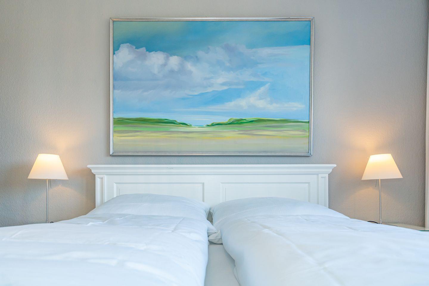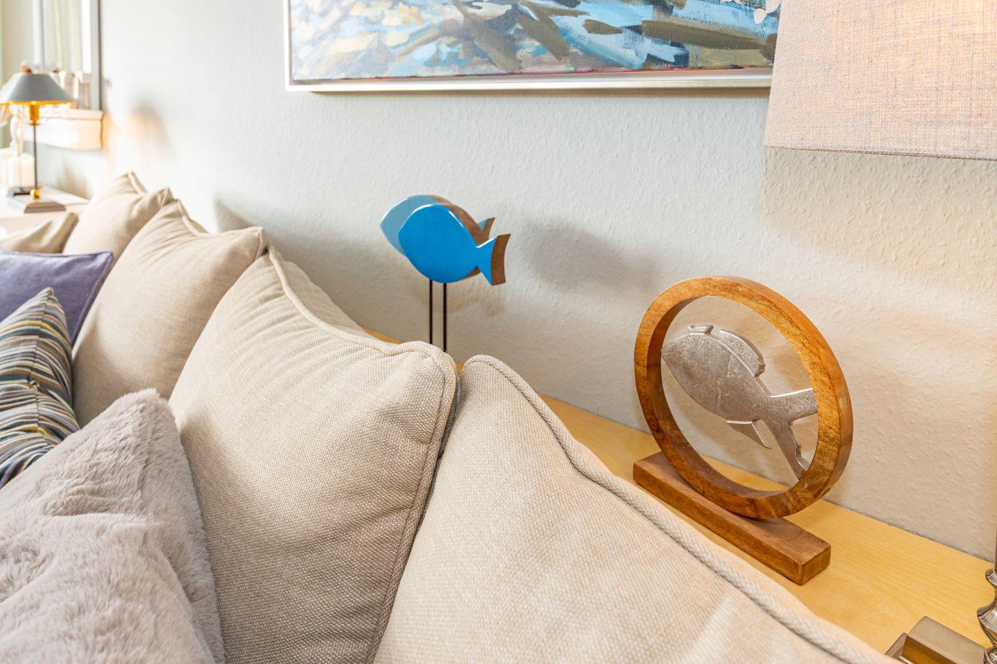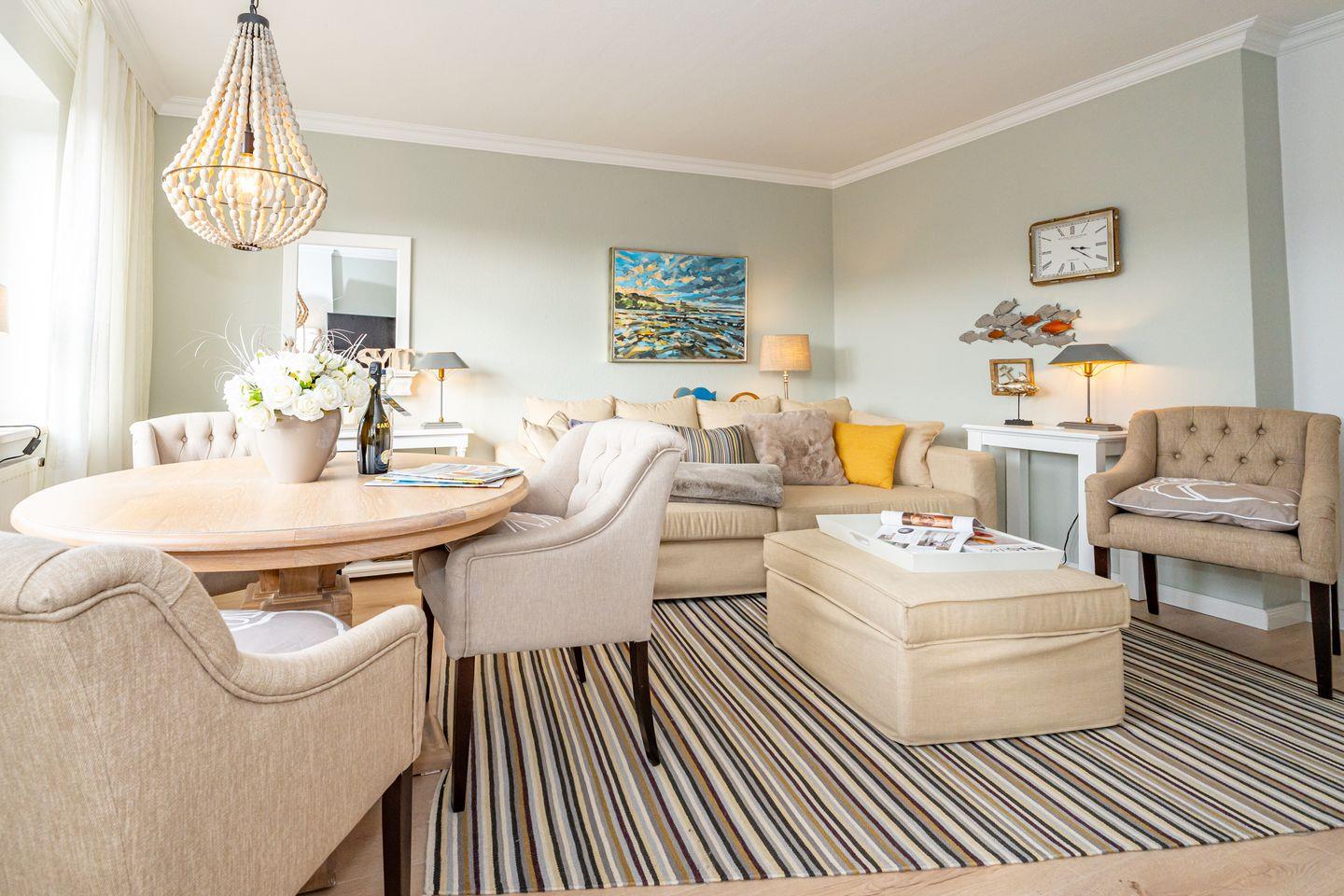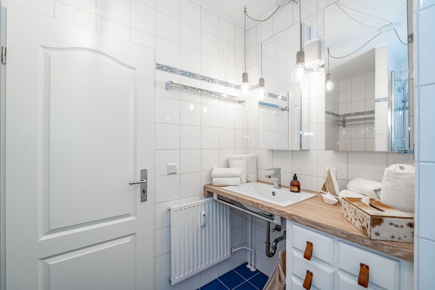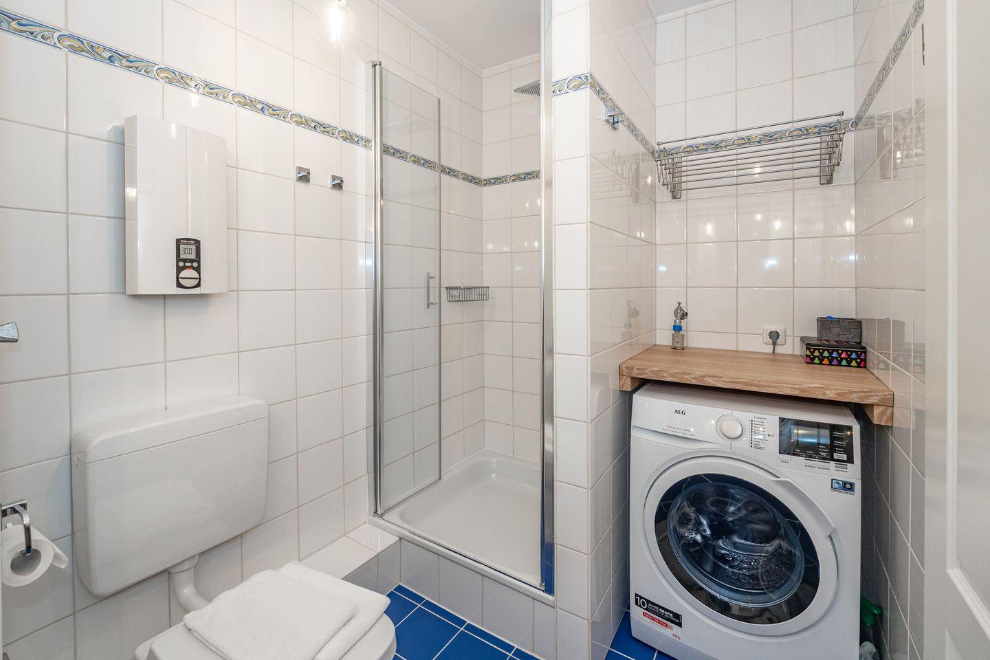 Vom Flur aus gehen alle Zimmer dieser Ferienwohnung ab. Im Wohnzimmer finden Sie neben einem einladenden Essbereich ein gemütliches Sofa. Zusätzliche Ausstattungsmerkmale sind die SONOS-Lautsprecher und der große SMART-TV mit integriertem WLAN. Von hier aus haben Sie Zutritt zum Balkon. Die separate Küche verfügt über Kühlschrank, Backofen, Geschirrspüler, Induktionskochfeld, eine Filterkaffeemaschine, eine Nespresso Kapselmaschine sowie einen Wasserkocher und Toaster. Bequem können Sie hier am Esstisch Ihr Frühstück genießen. Im geräumigen Schlafzimmer erwartet Sie ein Doppelbett (160 x 200 cm). Auch hier finden Sie einen großen SMART-TV. Im Badezimmer befindet sich ein Duschbad, WC sowie ein moderner Waschtrockner. Die Ferienwohnung verfügt über WLAN.