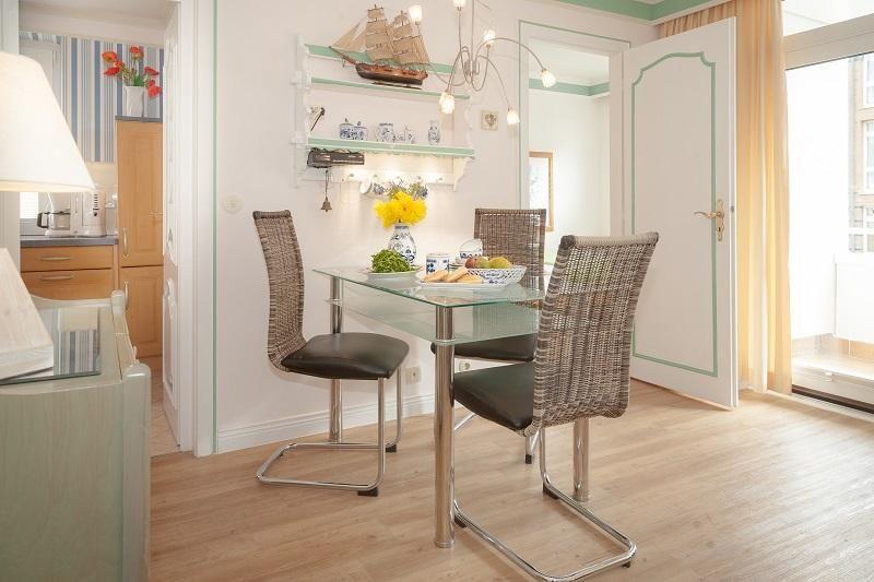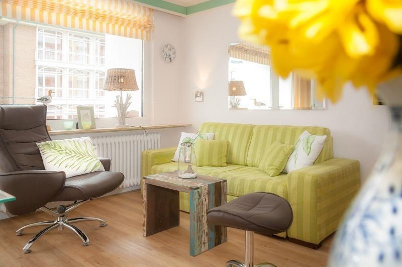 Das Appartement ist hell und freundlich eingerichtet. Im Wohnbereich befindet sich eine Sitzgruppe.