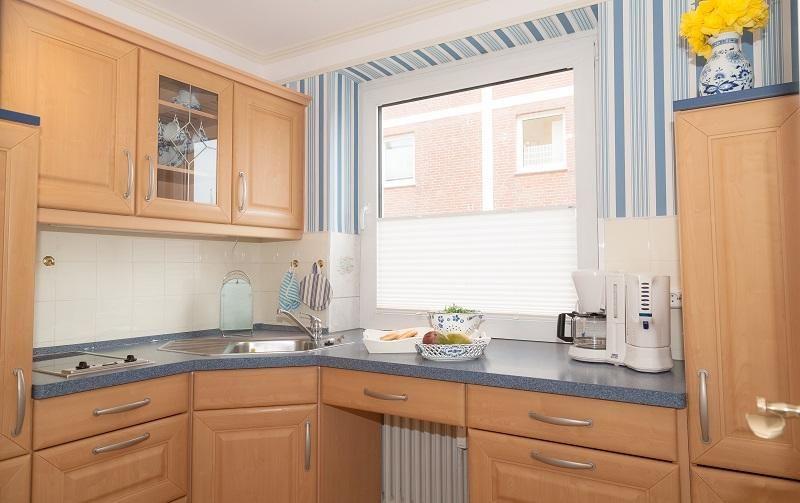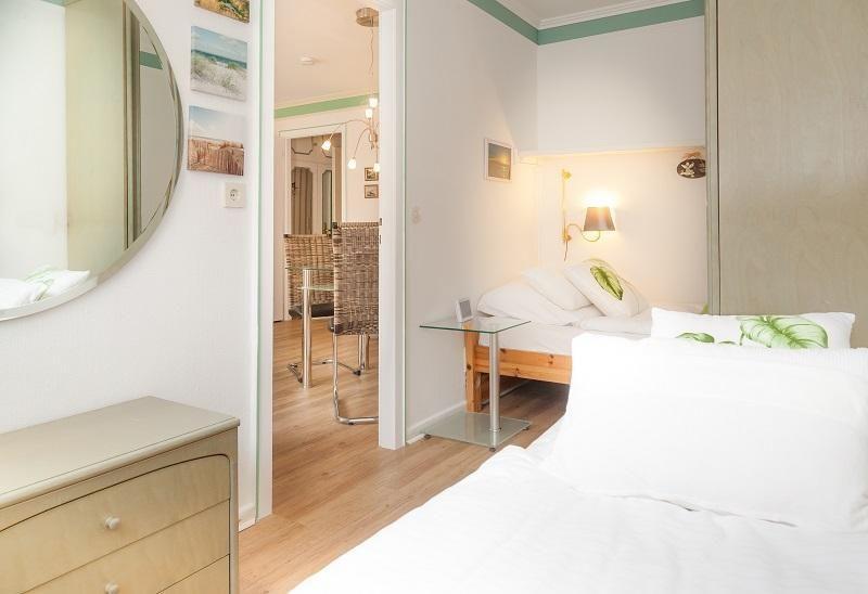 Im Schlafzimmer findet man 2 Einzelbetten, eine weitere Schlafmöglichkeit auf dem Schlafsofa steht im Wohnzimmer bereit. Die separate Küche ist ausgestattet mit Kaffeemaschine, Toaster, 2-Plattenherd, Kühlschrank. Ein kostenloser PKW-Stellplatz befindet sich am Haus. Der Strandübergang befindet sich direkt vor der Haustür. Die City liegt sozusagen gleich um die Ecke.