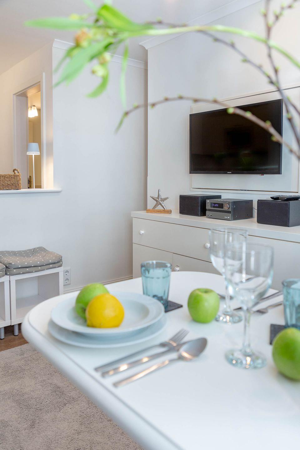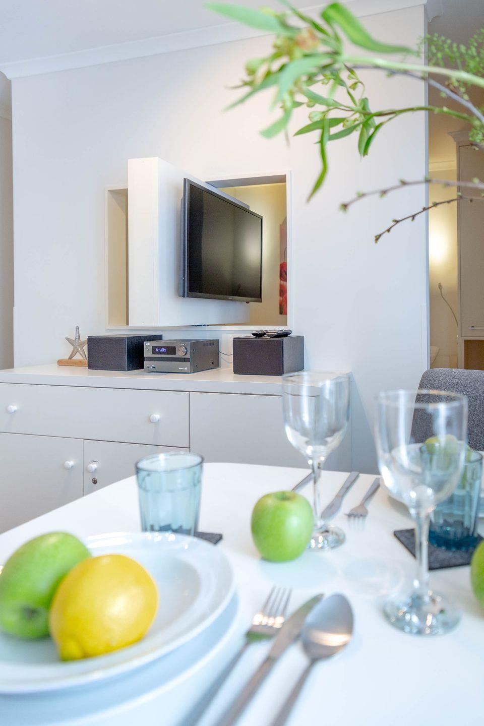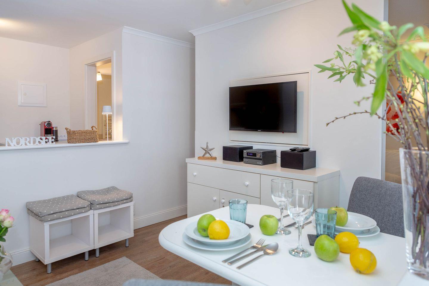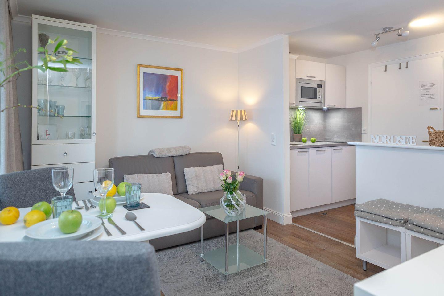 Die Wohnung zeichnet sich durch ihre Ausstattung und eine zeitgemäße, wohnliche Atmosphäre aus. Der offene Wohn- und Küchenbereich ist funktional und geschmackvoll gestaltet. Die offen zum Wohnzimmer angelegte Küche ist vollständig ausgestattet und beinhaltet einen Ceranherd, eine Mikrowelle, eine Spülmaschine, einen Kühlschrank mit Gefrierfach, eine Nespresso-Espressomaschine, eine klassische Kaffeemaschine, einen Wasserkocher, einen Toaster sowie umfangreiche Küchenutensilien, Geschirr und Besteck. Für Ihre Anreise finden Sie eine Erstausstattung an Geschirrhandtüchern, Badetüchern, Handtüchern und Bettwäsche vor.
