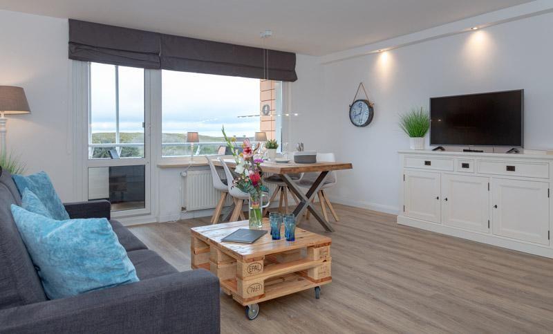 Westerland- Wohnung Sommerset, direkt am Strand- Die komplett renovierte und im lässig-gemütlichen Hamptons-Stil eingerichtete Wohnung liegt nur gute 100 Meter von der Westerländer Strandpromenade und dem beliebten Brandenburger Strand entfernt im Appartementhaus Windhuk.