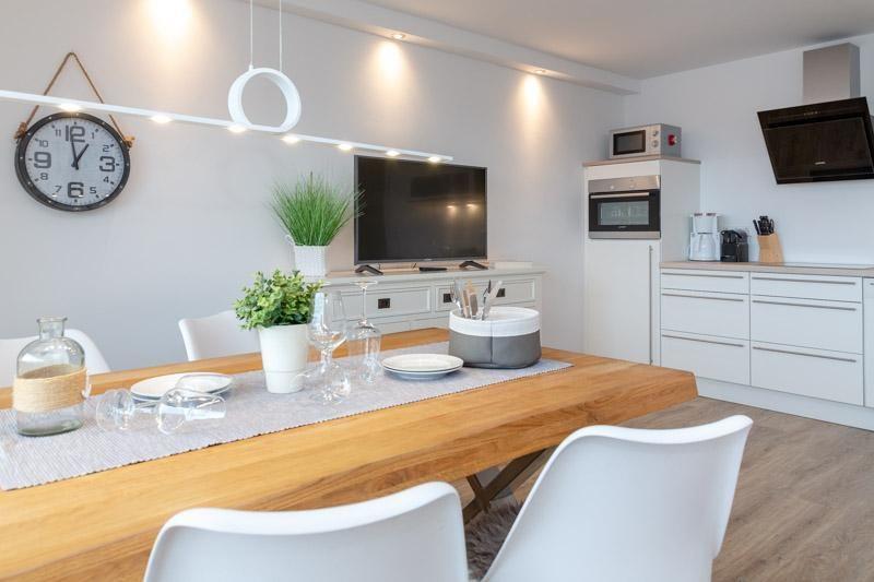 Westerland- Wohnung Sommerset, direkt am Strand- Die komplett renovierte und im lässig-gemütlichen Hamptons-Stil eingerichtete Wohnung liegt nur gute 100 Meter von der Westerländer Strandpromenade und dem beliebten Brandenburger Strand entfernt im Appartementhaus Windhuk. Das helle, moderne Appartement hat eine Wohnfläche von ca.58 Quadratmetern und ist ausgestattet mit vielen liebevoll netten maritimen "Hinguckern" dekoriert. Hier gehört das dezente Meeresrauschen im Hintergrund quasi zum Inventar. Das Appartement hat ein großzügiges, ruhiges Schlafzimmer (mit TV), sowie zusätzlich eine ausklappbare Multifunktionscouch im Wohnbereich. Die moderne Küche ist offen im Wohnbereich integriert. Hier wird es Ihnen an nichts fehlen: Backofen Gefrierfach, Geschirrspüler, Kaffeemaschine, Kühlschrank, Mikrowelle, Wasserkocher sind vorhanden. Ebenso ein großer W-LAN fähiges TV. Freies Internet ist selbstverständlich für die Gäste dieser Wohnung ebenfalls vorhanden. Das eben top sanierte Bad hat eine großzügige Regendusche. Auch ein Föhn ist vorhanden. Auf dem nach Westen ausgerichteten Balkon kann man in den Sommermonaten dann nach einem schönen Strandtag, noch einen Sundowner genießen. Die Wohnung befindet sich in der 3. Etage, am Ende des Ganges, in ruhiger Lage im Haus. Zu dieser Wohnung gehört ein fester kostenloser PKW Außenstellplatz. Im Kellerbereich des Hauses befinden sich Waschmaschinen und Trockner (gegen Gebühr). Das Haus hat einen ebenerdigen Fahrstuhl. Die City und den Strand erreichen Sie in wenigen Minuten fußläufig. Ein tolles, modernes Appartement erwartet Sie. Herzlich willkommen im ( Nichtraucher) Appartement Sommerset. Übrigens nette Hunde (10€ pro Tag) sind hier willkommen.