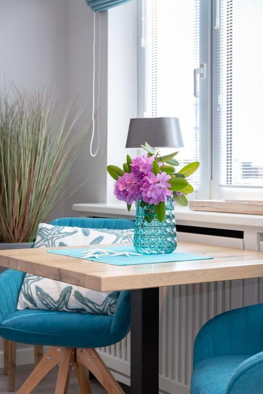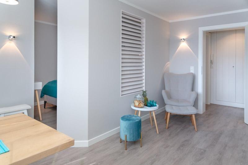 Mit einer Größe von 37 m² besticht die moderne Ferienwohnung durch ihre detailverliebte, freundliche und helle Einrichtung. Eine kleine offene Küche, ein abgegrenzter Wohn- und Schlafbereich sowie ein komfortables, helles Duschbad sind mit allen Annehmlichkeiten für einen entspannten Aufenthalt ausgestattet.