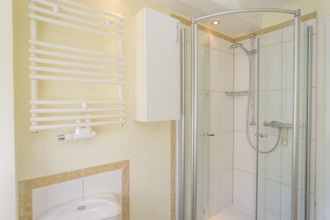 Ebenfalls ebenerdig liegt das Bad mit Dusche und WC.