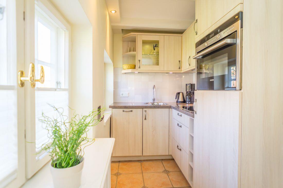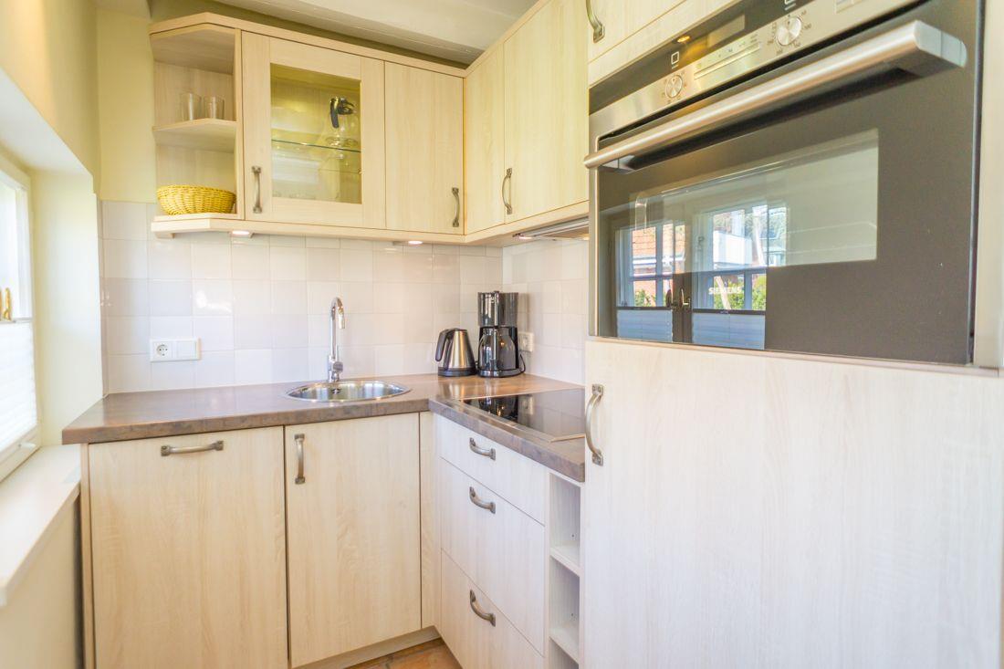 Die kleine Küchenzeile mit u.a. einer Spülmaschine verbirgt sich in einer an den Wohnraum grenzenden Nische.
