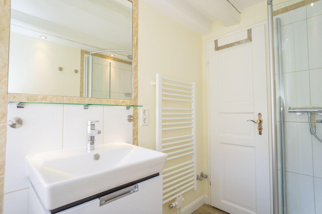 Ebenfalls ebenerdig liegt das Bad mit Dusche und WC.