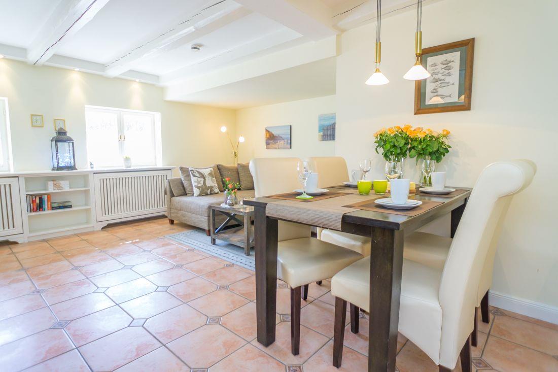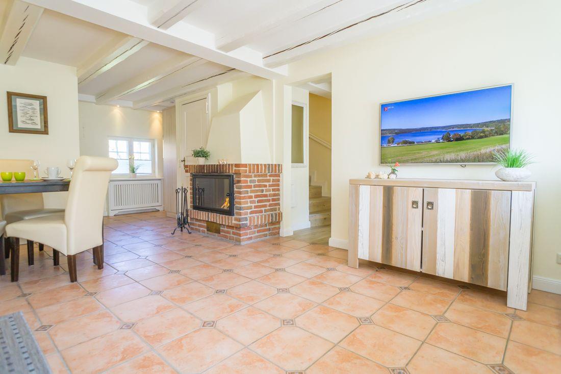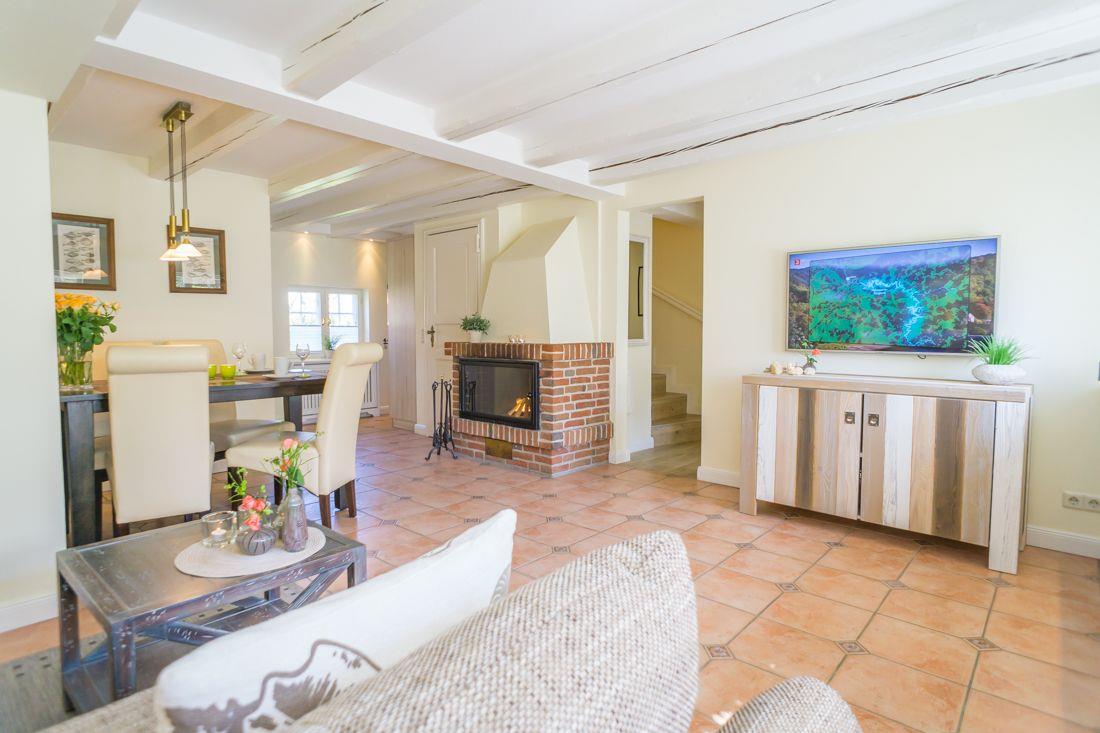 Zu ebener Erde liegt der einladende Wohn- und Eßraum mit Kamin.