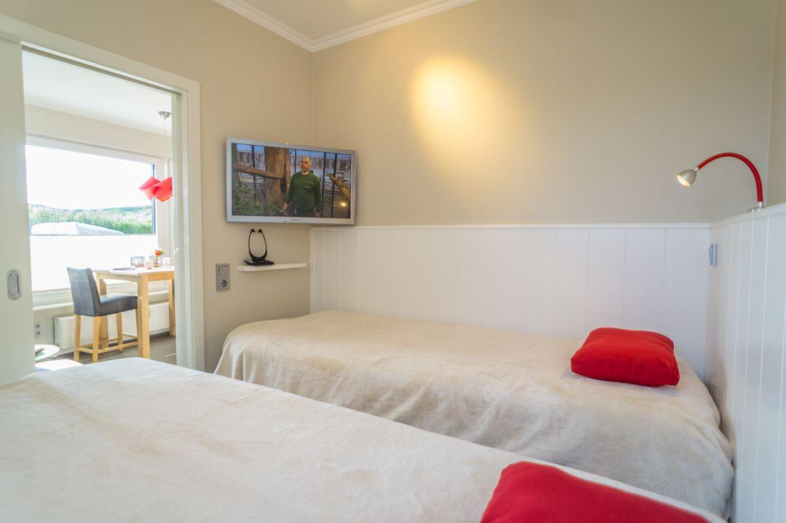 Ein gemütliches Schlafzimmer eingerichtet mit Boxspringbetten (80x200) und LCD TV.
