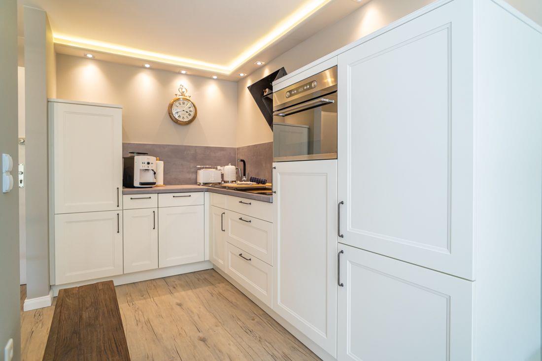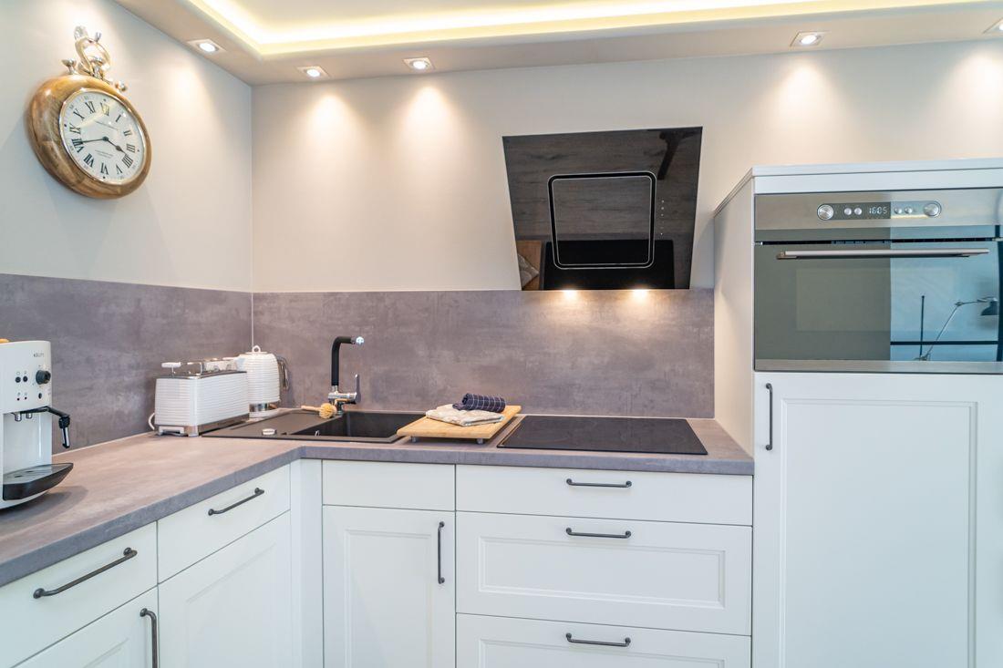 Die offene Küche verfügt u.a. über 4er Cerankochfeld, Backofen, Spülmaschine, und Microwelle.