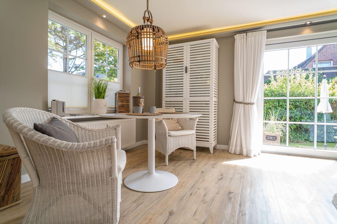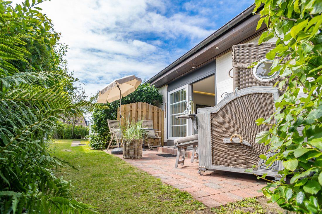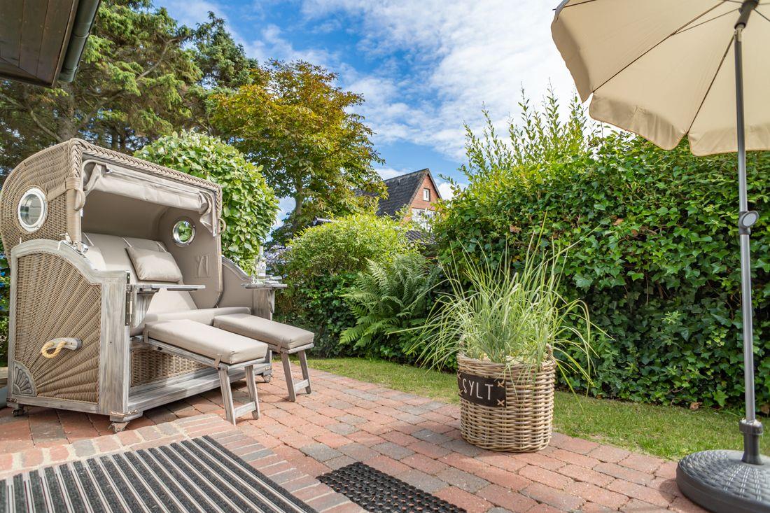 Eine sonnige Terrasse mit Strandkorb und Gartenmöbeln steht Ihnen zur Verfügung.