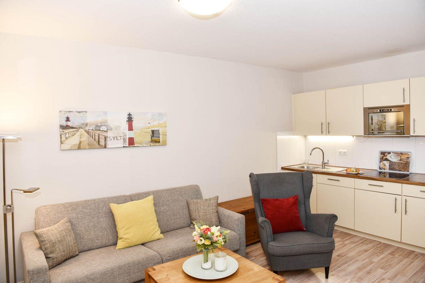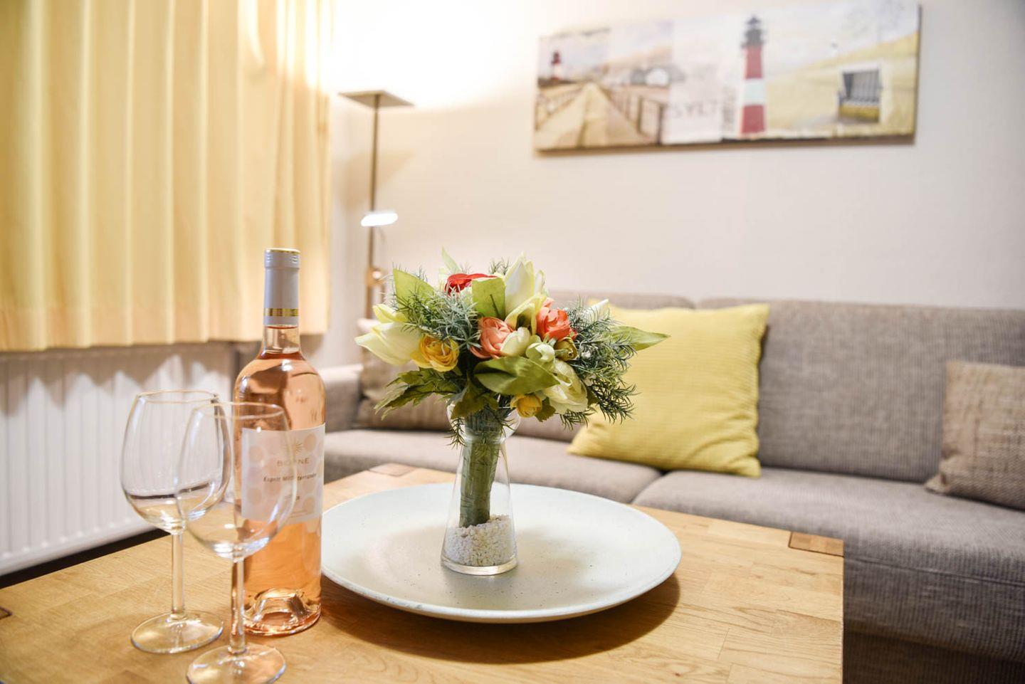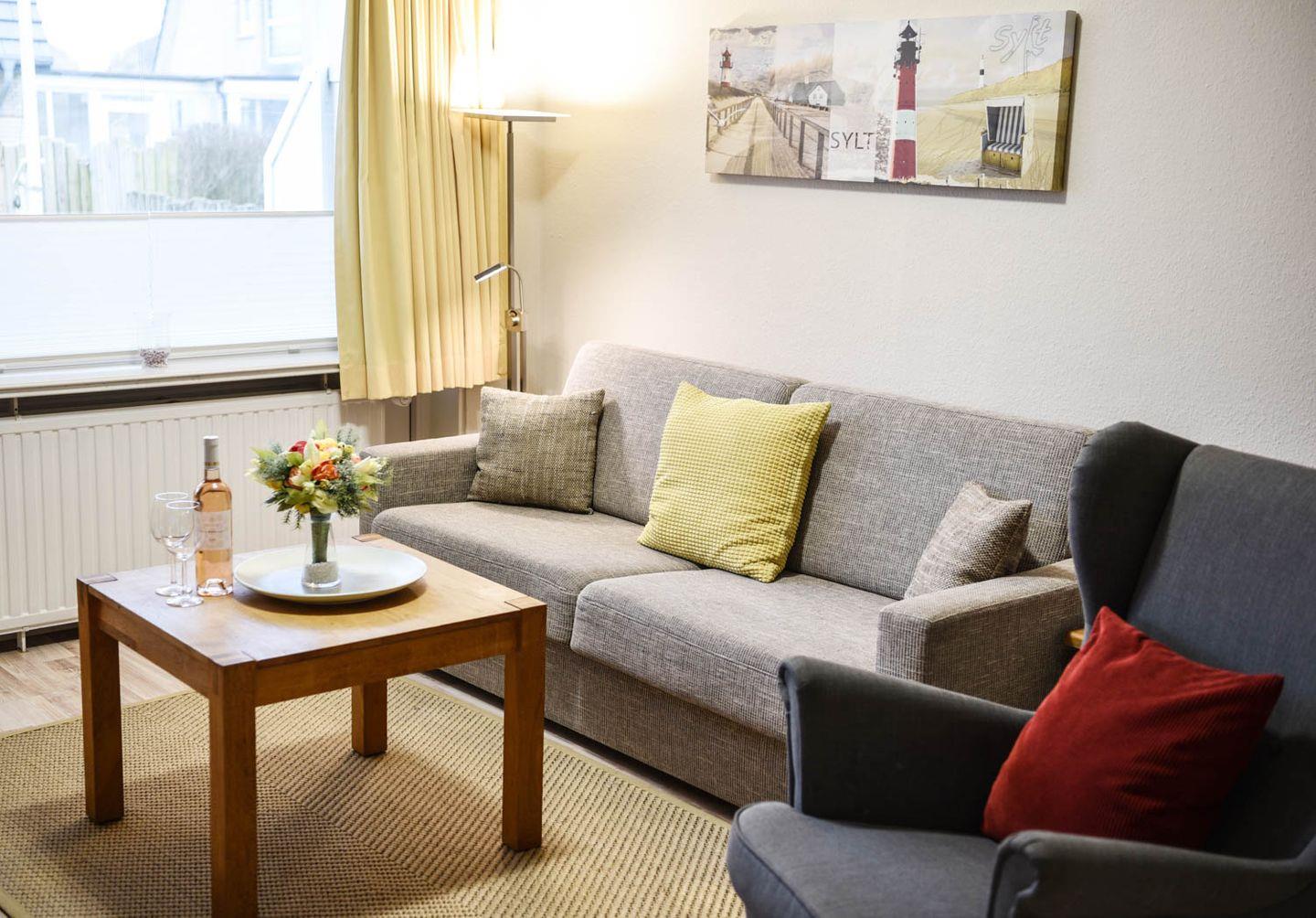 Moin und ein herzliches Willkommen in der Ferienwohnung „Mare Nostrum 4“. Sie liegt im Erdgeschoss eines überschaubaren Appartementhauses in unmittelbarer Strandnähe, zweite Reihe hinter den Dünen von Westerland. Perfekt für zwei Personen mit 46 Quadratmetern Größe und einem separaten Schlafzimmer, aber auch zu viert komfortabel zu nutzen, da sich die gemütliche Couch im Wohnzimmer mit offener Küche als wirklich vollwertiges Doppelbett zum Richtig-gut-Schlafen ausklappen lässt.
