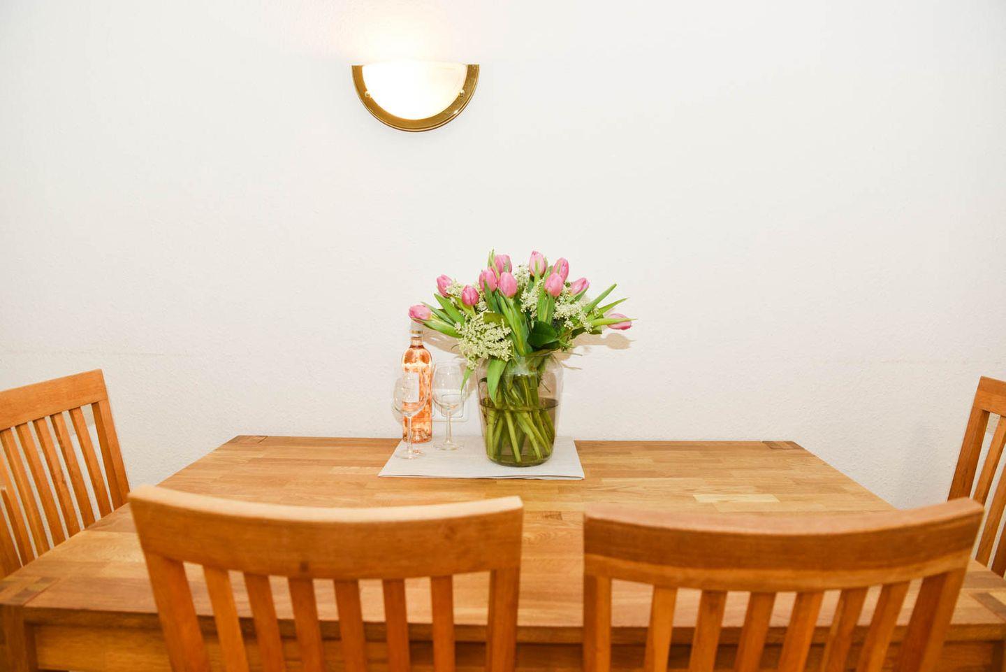 Die offene Wohnküche (Farbton „Vanille“) ist voll ausgestattet, die Terrasse möbliert, ein eigener Parkplatz und Waschmaschine/Trockner zur Gemeinschaftsnutzung stehen ebenfalls zur Verfügung. Der Clou an diesem Haus aber ist seine Lage: Keine zehn Minuten sind es von hier aus zur quirligen Innenstadt mit allen Einkaufsmöglichkeiten, urigen Kneipen und attraktiven Restaurants. Und wer gerne vorm Frühstück im Meer schwimmt, kann theoretisch in der Badehose „eben rüber laufen“ zum Strand, der ist hier nämlich keine zwei Minuten weit weg.
