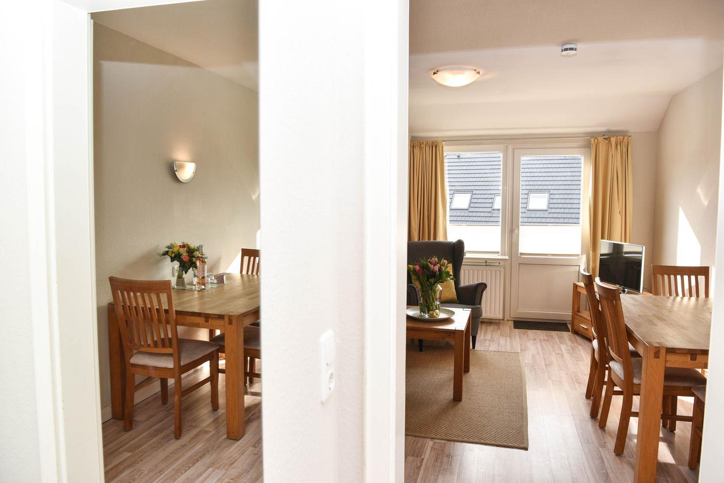 Moin und ein herzliches Willkommen in der Ferienwohnung „Mare Nostrum 11“. Sie liegt in der zweiten Etage eines überschaubaren Appartementhauses in unmittelbarer Strandnähe, hinter den Dünen von Westerland. Mit 50 Quadratmetern Größe und einem separaten Schlafzimmer perfekt für das Urlaubsglück von zwei Personen, aber auch mit vier Personen entspannt zu nutzen, da sich die gemütliche Couch im Wohnzimmer als vollwertiges Doppelbett zum Richtig-gut-Schlafen ausklappen lässt.